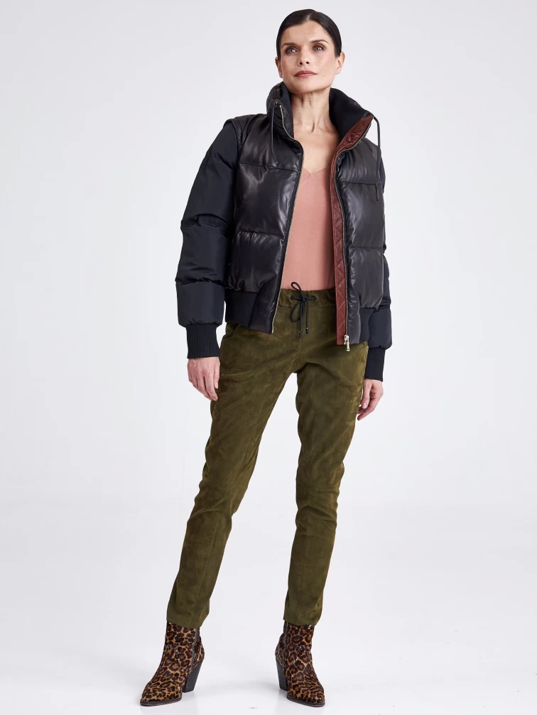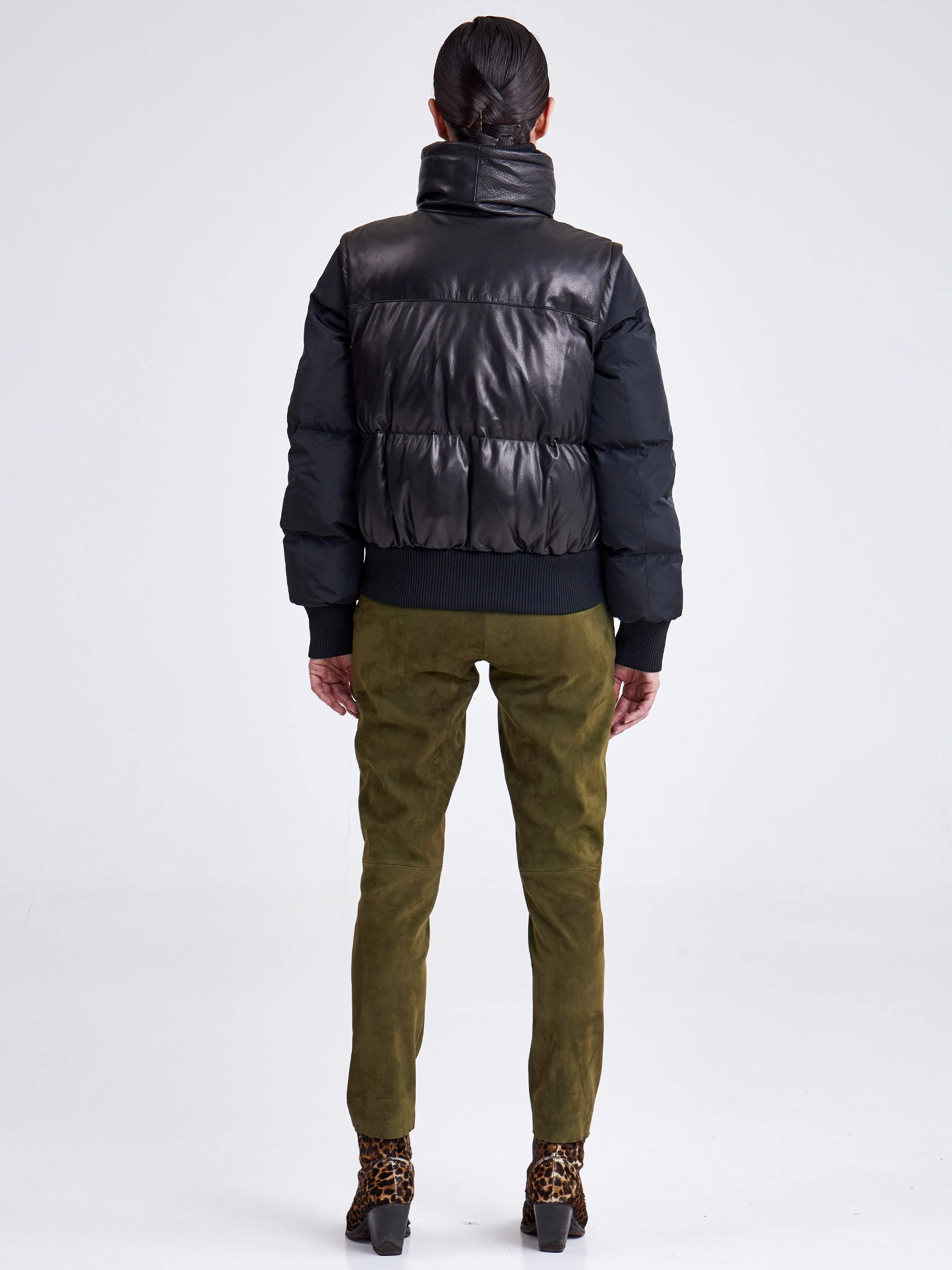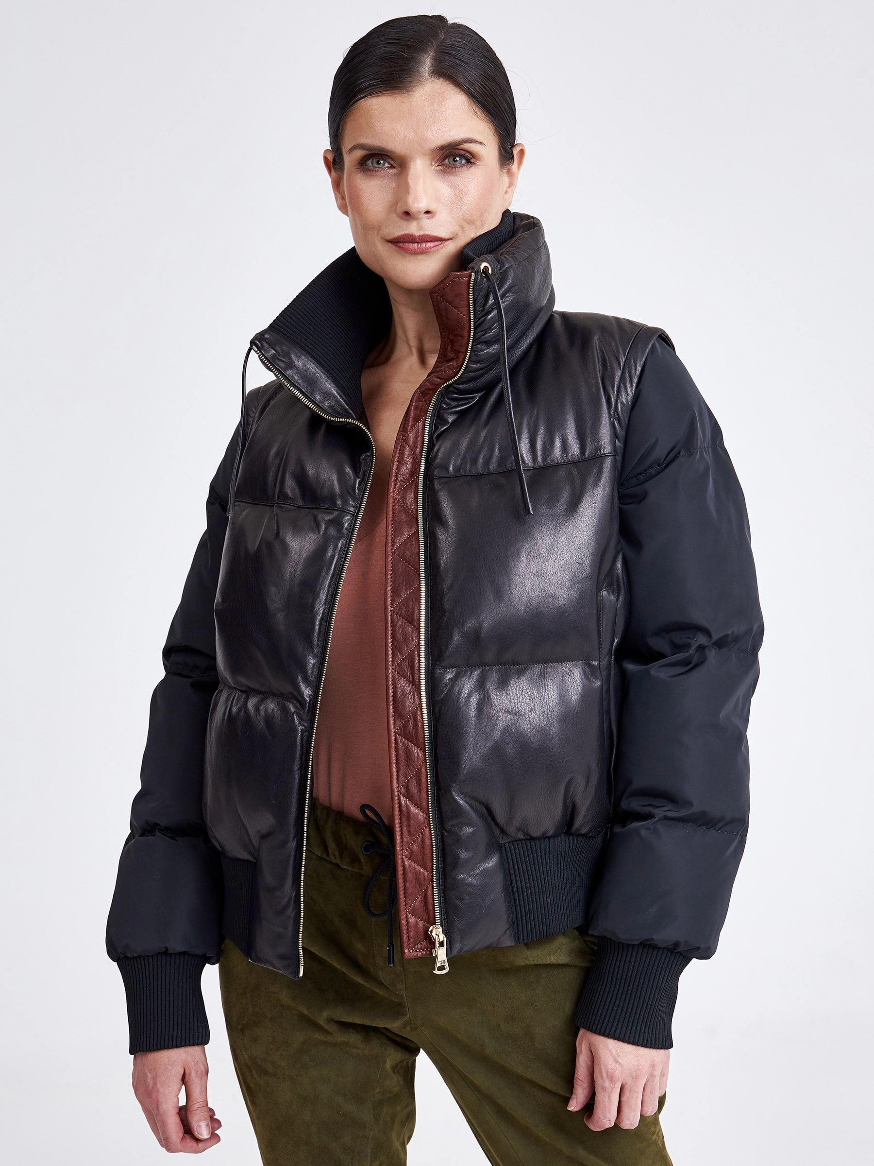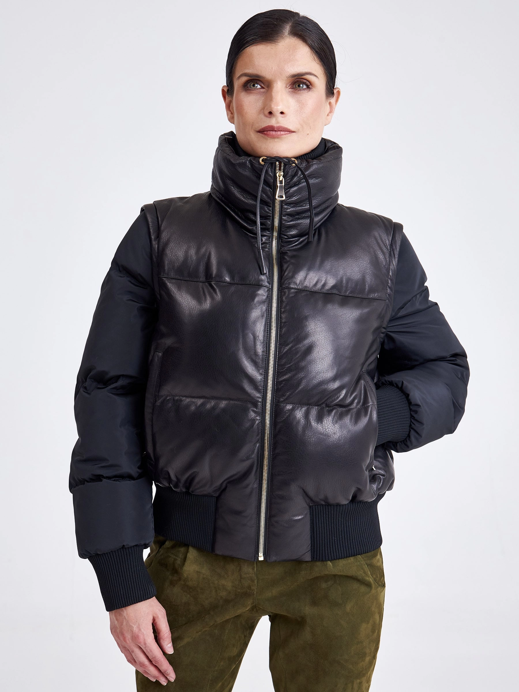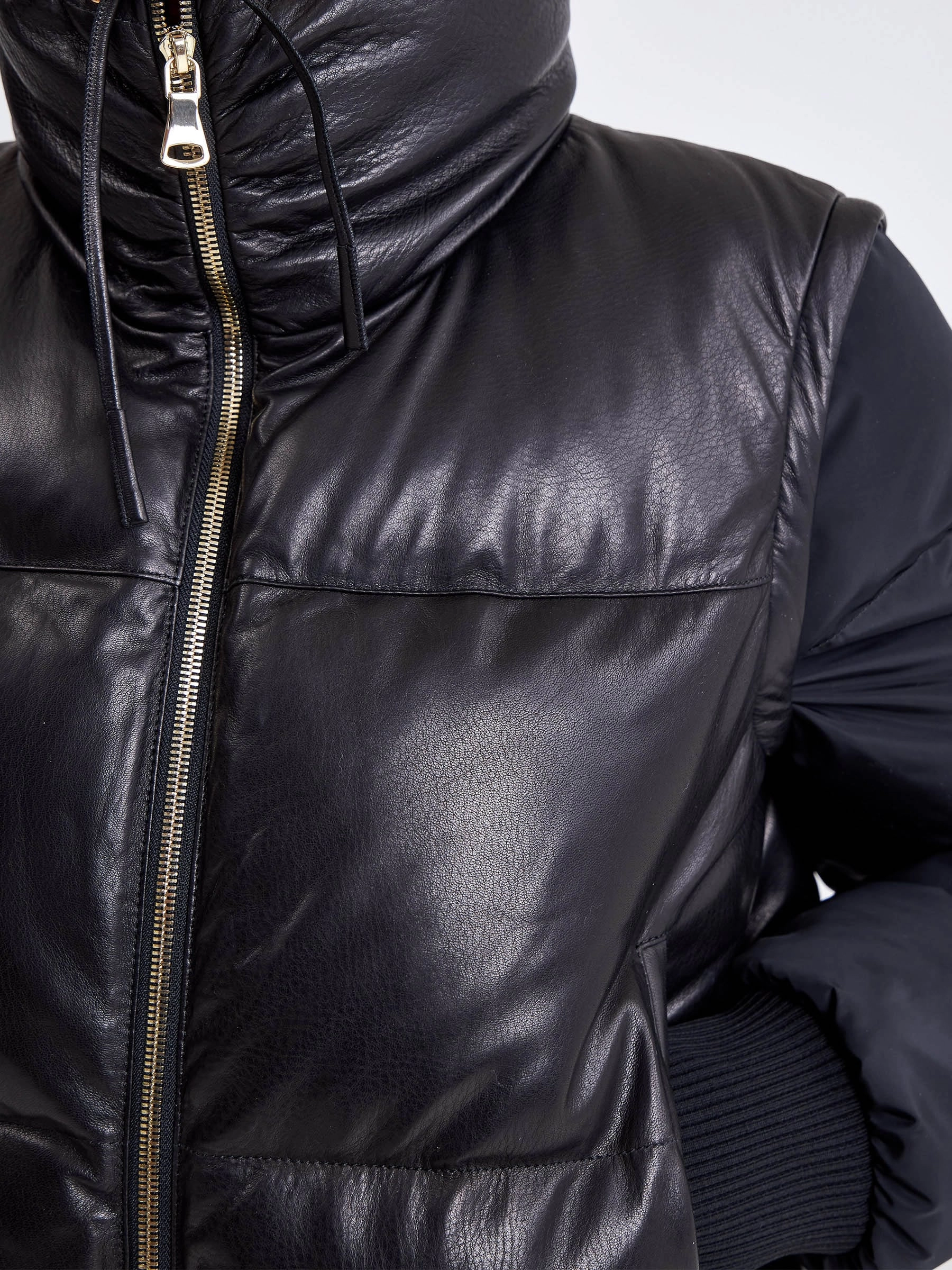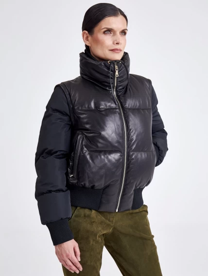 Короткая куртка бомбер выполнили из натуральной черной кожи в тандеме с прочной непромакаемой тканью. Рукава отстегиваются, что позволяет изделие носить как жилетку. За дополнительный комфорт в капризную погоду, отвечает двойной воротник - стойка и плотные трикотажные манжеты. В качестве утеплителя - немецкий синтепон Френденберг. Отличная теплоизоляция, превосходная парапроницаемость.