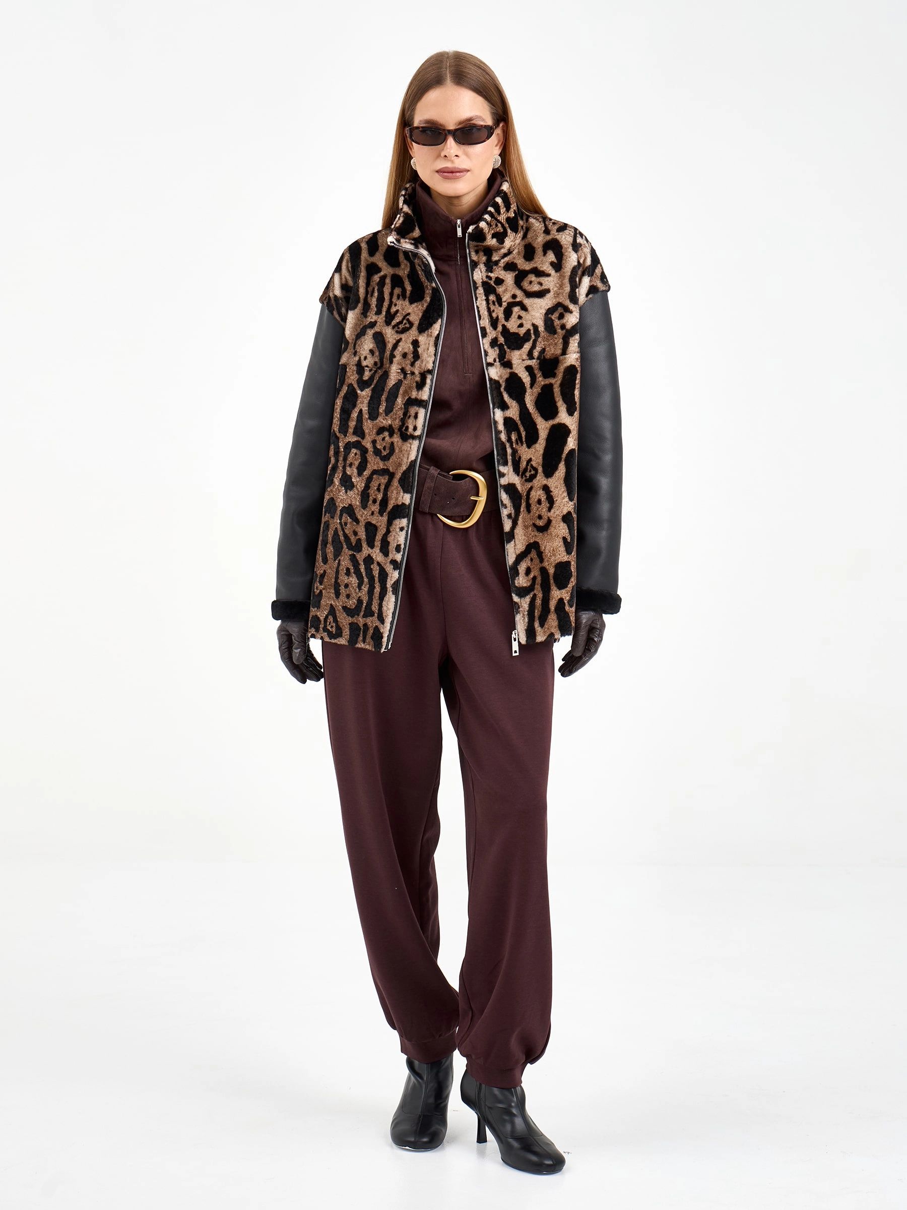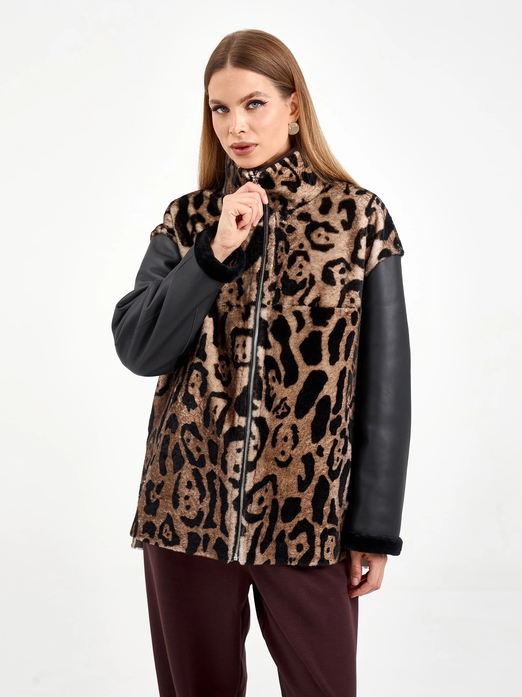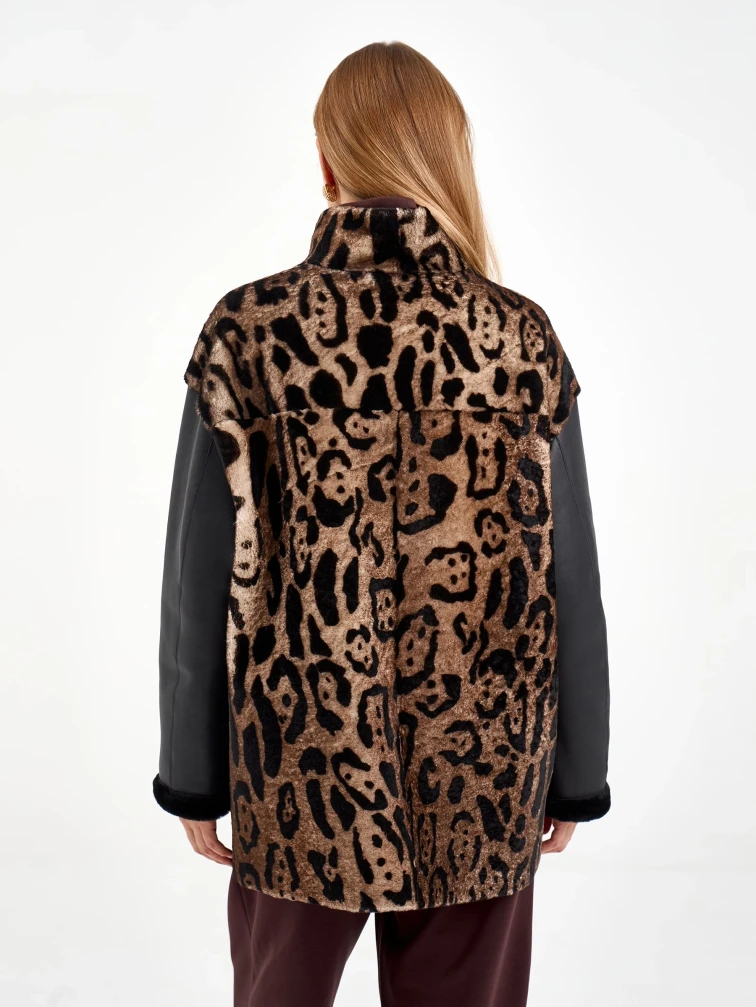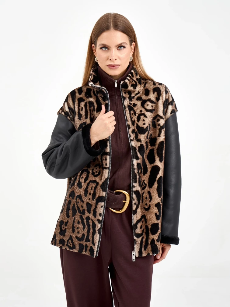 Короткая комбинированная дубленка из овчины мерино с леопардовым принтом и кожаными рукавами. Модель свободного кроя длиной 75 см с воротником-стойкой и спущенным рукавом сочетает смелые текстурные контрасты. Боковые разрезы и врезные карманы застегиваются на молнии, подчеркивая современный дизайн. Стилисты рекомендуют носить с монохромными базовыми вещами — черными узкими джинсами, водолазкой и кожаными ботильонами, чтобы выразительная фактура дубленки стала центром образа. Идеальный выбор для создания смелого городского образа, где дерзкая эстетика встречается с непревзойденным комфортом.