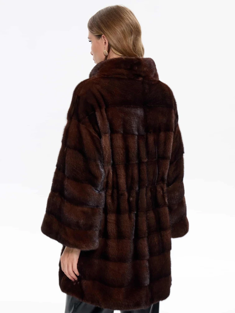 Короткую шубу в универсальной длине выполнили из густой коричневой норки премиум-класса в диагональной раскладке, где ручная сортировка шкурок гарантирует безупречный глянцевый блеск, равномерную плотность и шелковистую текстуру меха. Спущенный крой рукавов создает модный силуэт с мягкой линией плеч, который маскирует сутулость, добавляет образу легкости и не ограничивает подвижность, делая модель идеальной для активной городской жизни. Воротник-стойка надежно защищает от ветра и гармонично сочетается с любыми аксессуарами, а скрытые клипсы обеспечивают надежную фиксацию без повреждения меха, сохраняя чистоту линий фасона. Модель дополнена двумя удобными боковыми карманами и широким кожаным поясом для акцента на талии.
