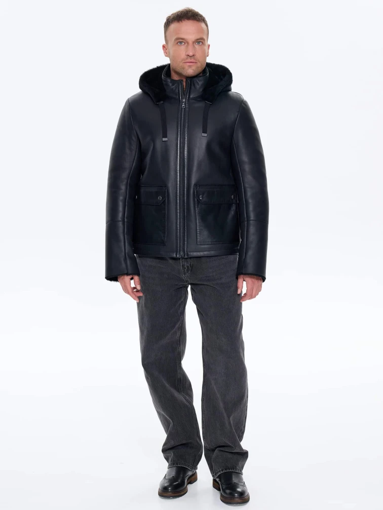 Товар короткая мужская дубленка с капюшоном премиум класса 441, черная, размер 48, артикул 41230 выполнен из овчина "мерино" с застежкой молния. Рассчитан на сезон: зима. Длина изделия 68 см, силуэт прямой.