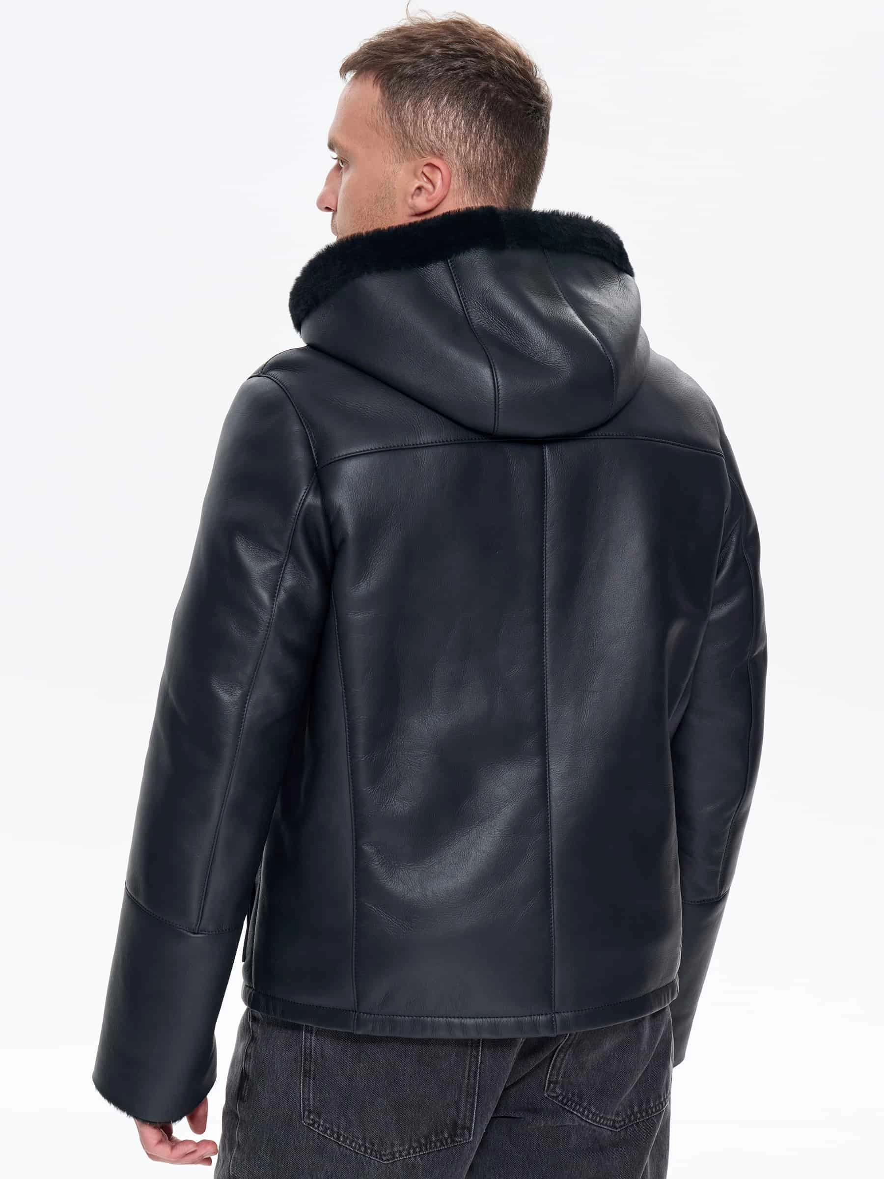 Короткая мужская дубленка с капюшоном премиум класса 441, черная, размер 48, артикул 41230