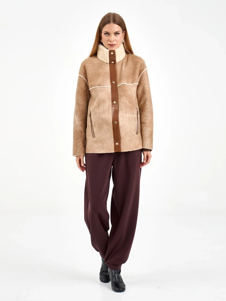Короткая дубленка без капюшона из мягчайшей овчины мерино свободного кроя. Модель длиной 65 см с воротником-стойкой и спущенным рукавом демонстрирует утонченную эстетику: декоративные швы вывернуты мехом наружу, а карманы и планка на кнопках оформлены кожаными кантами с золотистой фурнитурой. Стилисты рекомендуют сочетать с водолазками, кожаными брюками и челси для создания образа в стиле smart casual — эта дубленка станет идеальным выбором для городских прогулок, добавляя образу непринужденной элегантности и уюта.