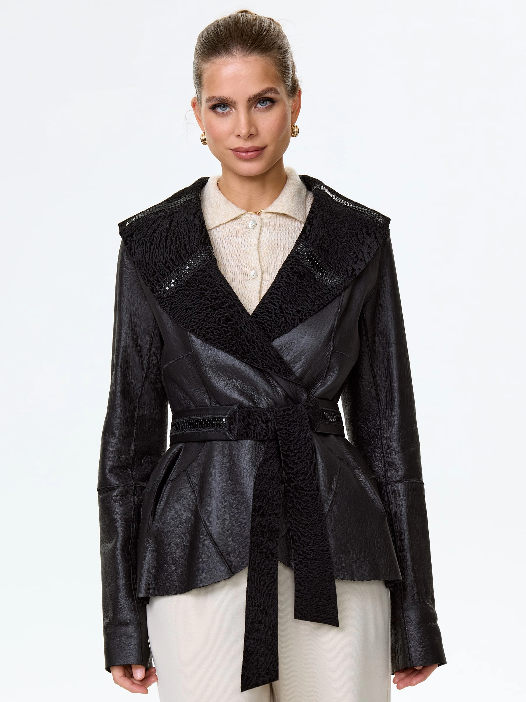 Приталенную двухстороннюю дубленку выполнили из нежнейшего меха новозеландского ягненка, близкого по восприятию к каракульче. Изделие можно носить и гладкой и фактурной стороной наружу. Шалевидный воротник декорировали паедками. Дополнением к модели послужил широкий кожаный пояс.