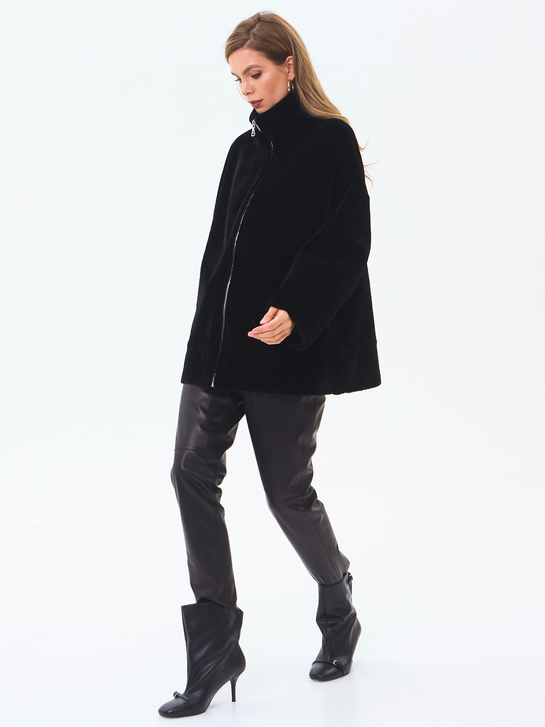 Для пошива короткой дубленки использовали мех овчины астраган тонкой выделки. Изделие свободного кроя комфортно садится по фигуре не ограничивая движения. Модель с воротником- стойка и двумя врезными карманами застегивается крупной молнией.
