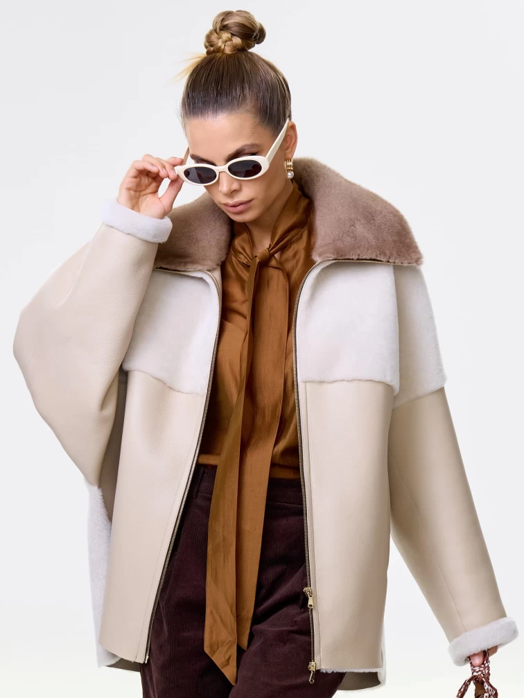 Товар короткая женская дубленка с норковым воротником премиум класса 2034, бежевая, размер 52, артикул 64180 выполнен из овчина "мерино" с застежкой молния. Рассчитан на сезон: осень-зима. Длина изделия 76 см, силуэт свободный.