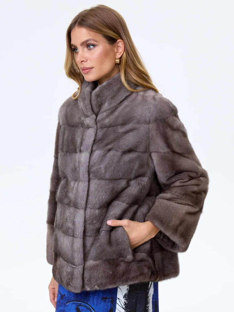 Короткая норковая женская поперечная шуба Ольга(в), графитовая, размер 46, артикул 34040
