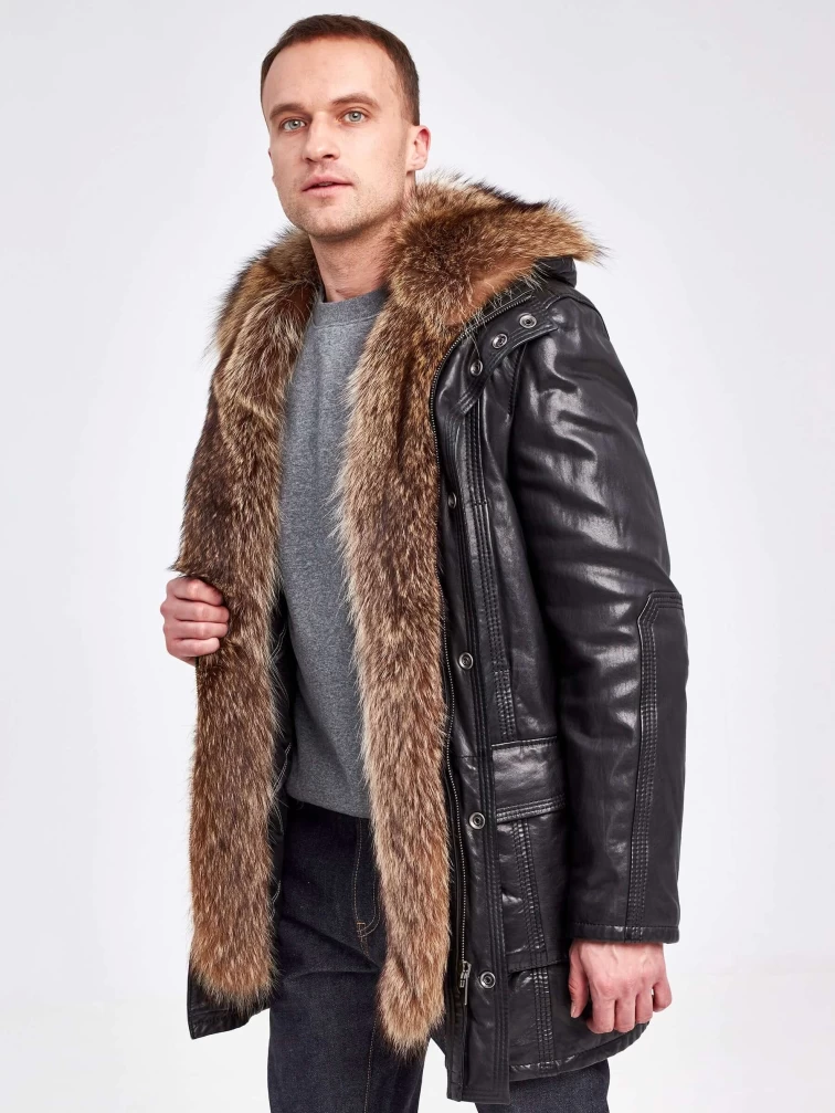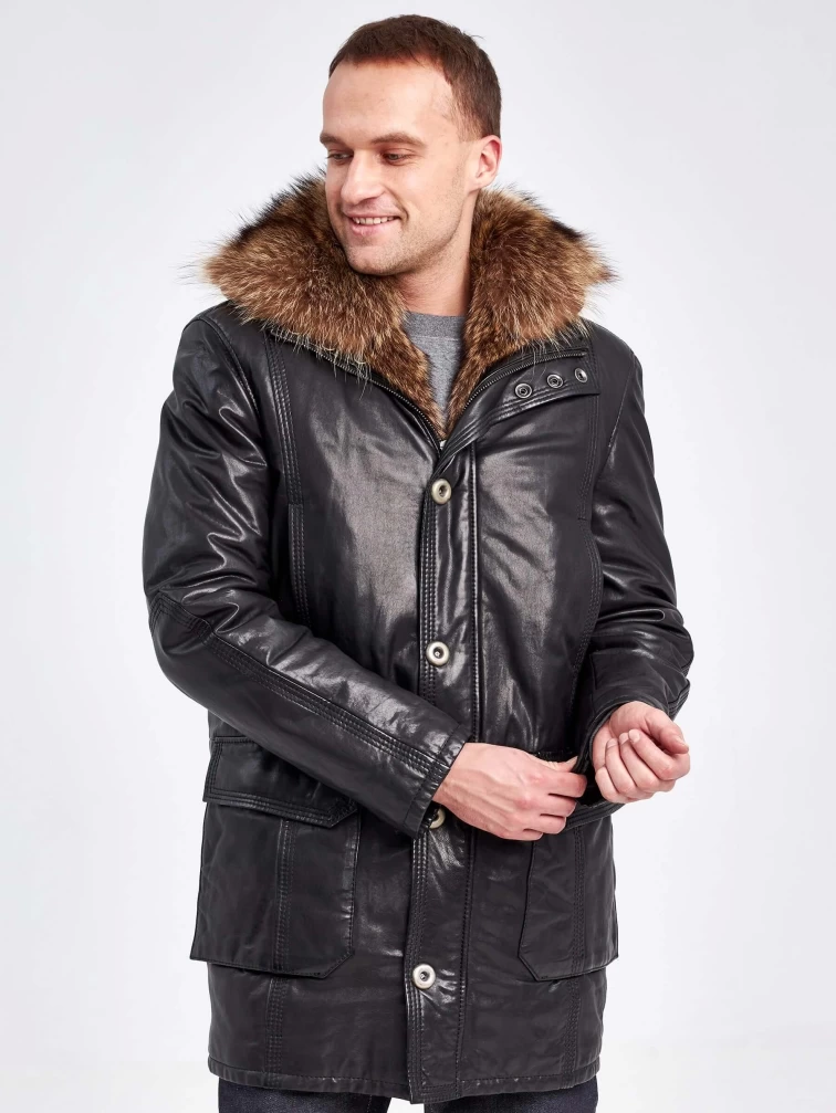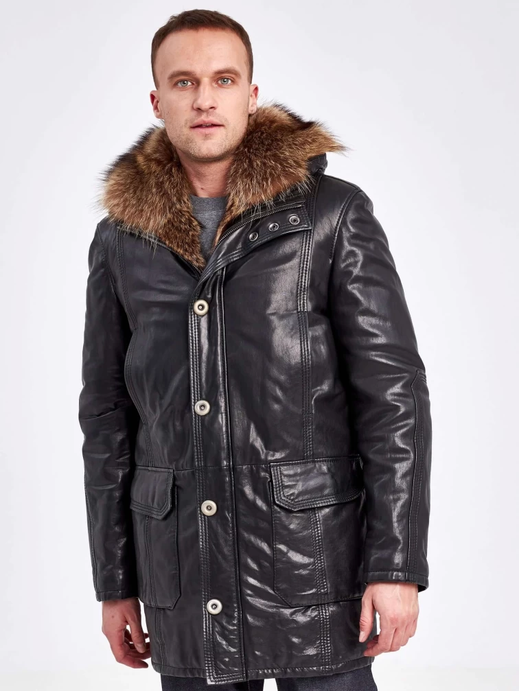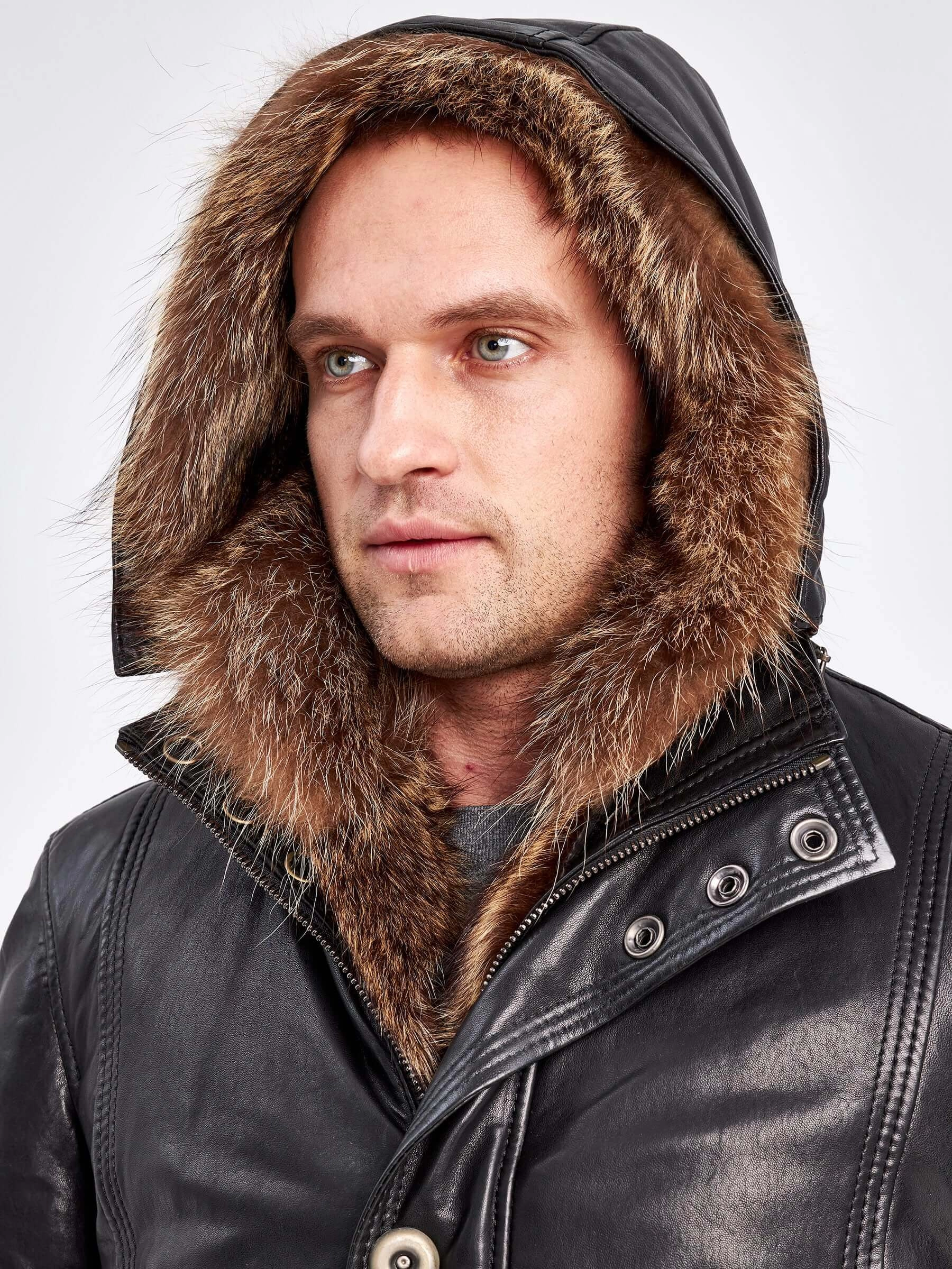 Кожаная аляска утепленная мужская 5467, с капюшоном и мехом енота, черная, p. 48, арт. 41000