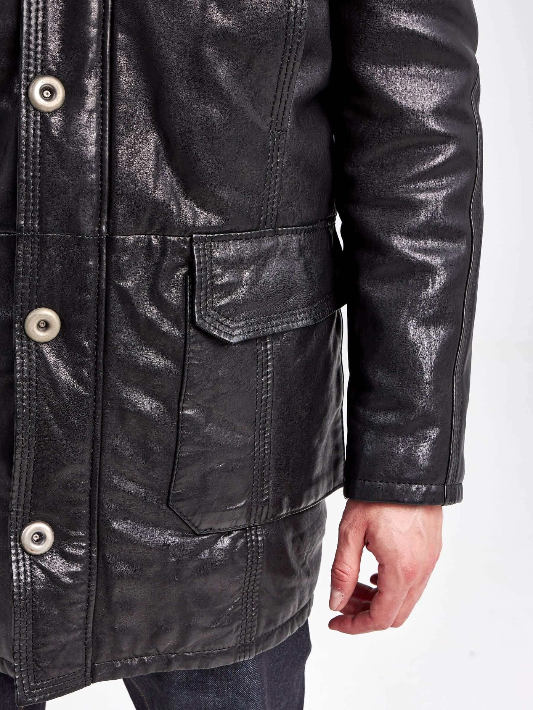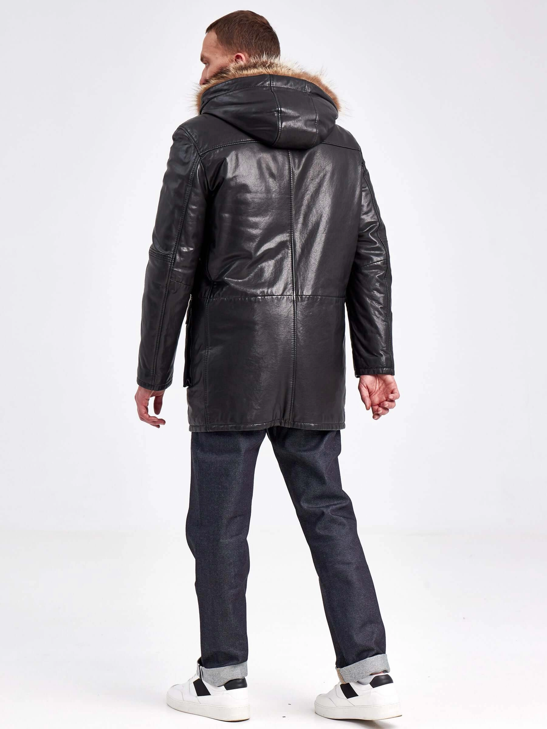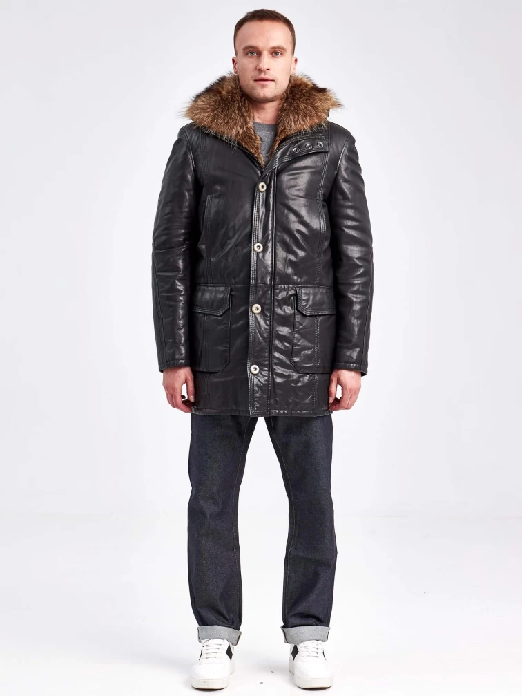 Кожаная аляска утепленная мужская 5467, с капюшоном и мехом енота, черная, p. 48, арт. 41000