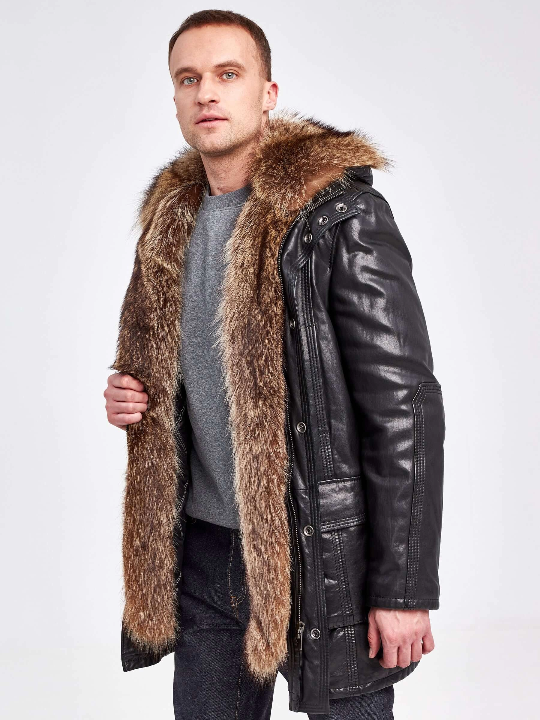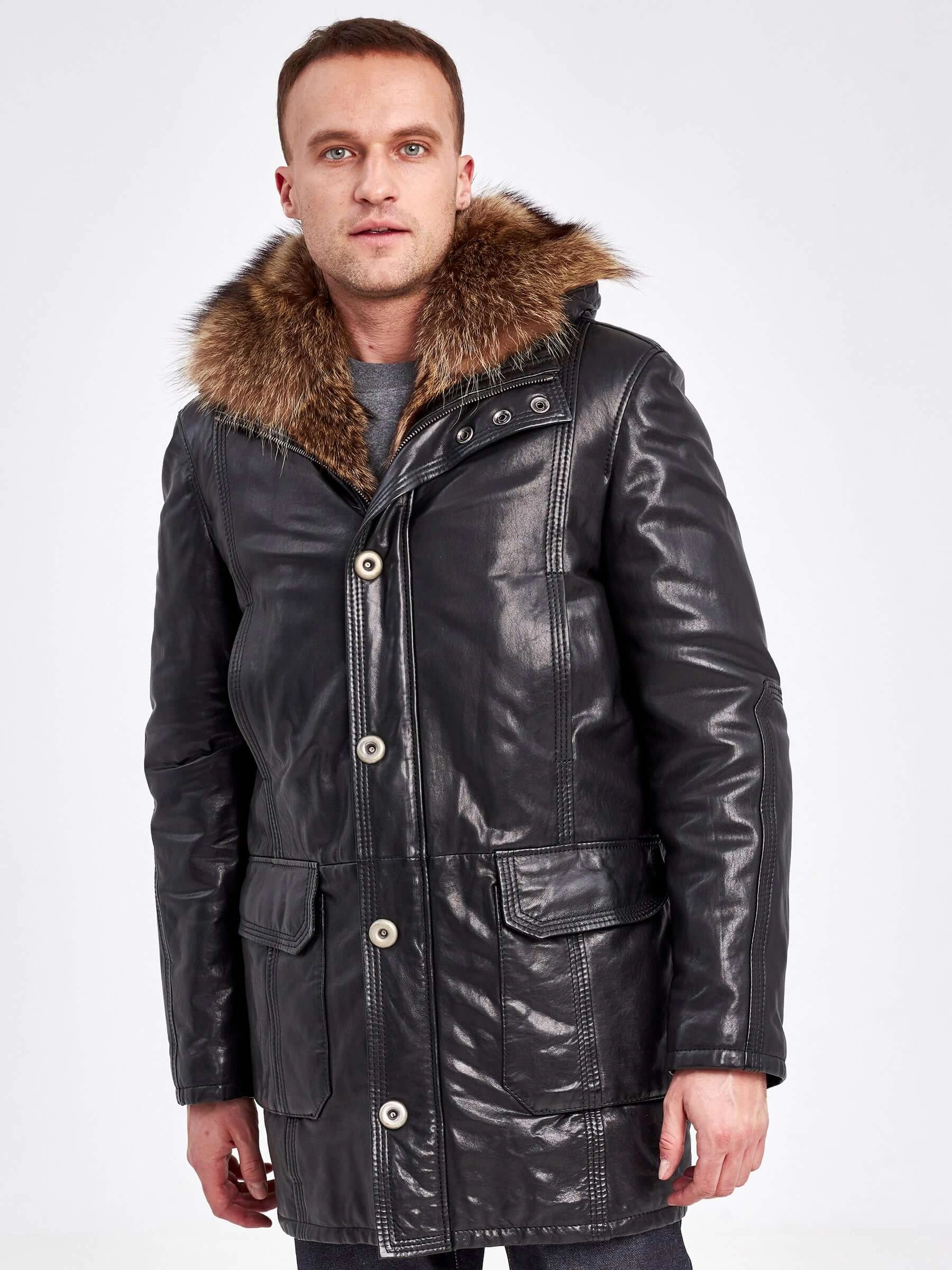 Зимняя куртка премиального качества из натуральной кожи, большим сьемным енотовым капюшоном и отделкой мехом серебристого енота на передней планке.
