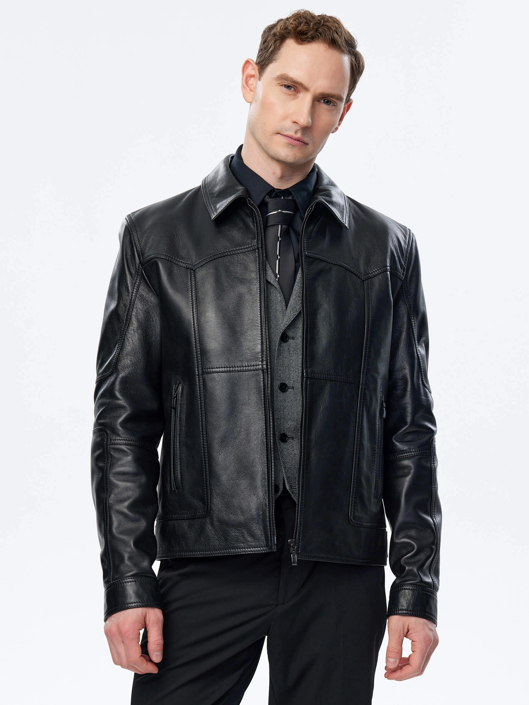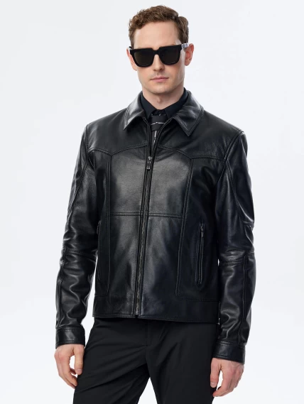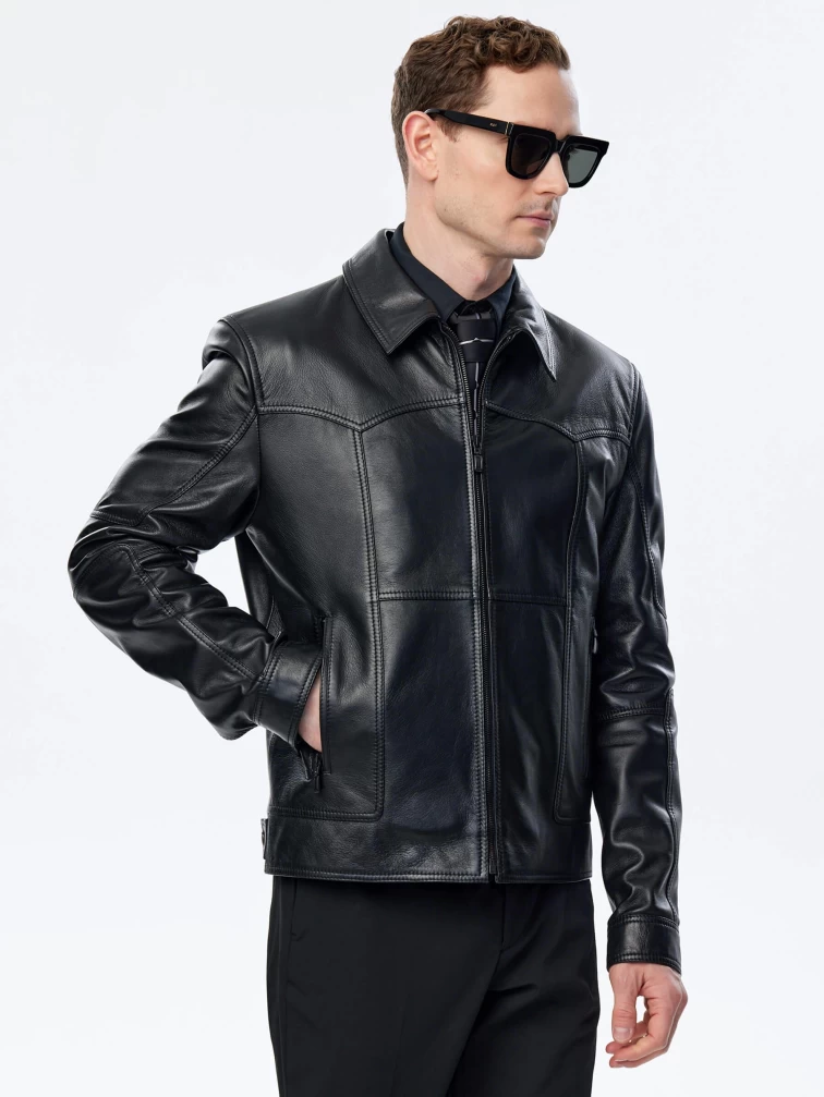 Мужская куртка в универсальном черном цвете. Кожа премиального качества. Воротник-отложной. Застёжка-молния. Рукав втачной. Боковые карманы на молниях. Предусмотрены удобные внутренние карманы для документов. Безупречная работа наших портных. Обеспечена идеальная посадка по фигуре и прекрасная свобода движений.