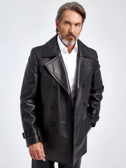 Двубортный мужской кожаный тренч на поясе 525, черный, размер 50, артикул 29060