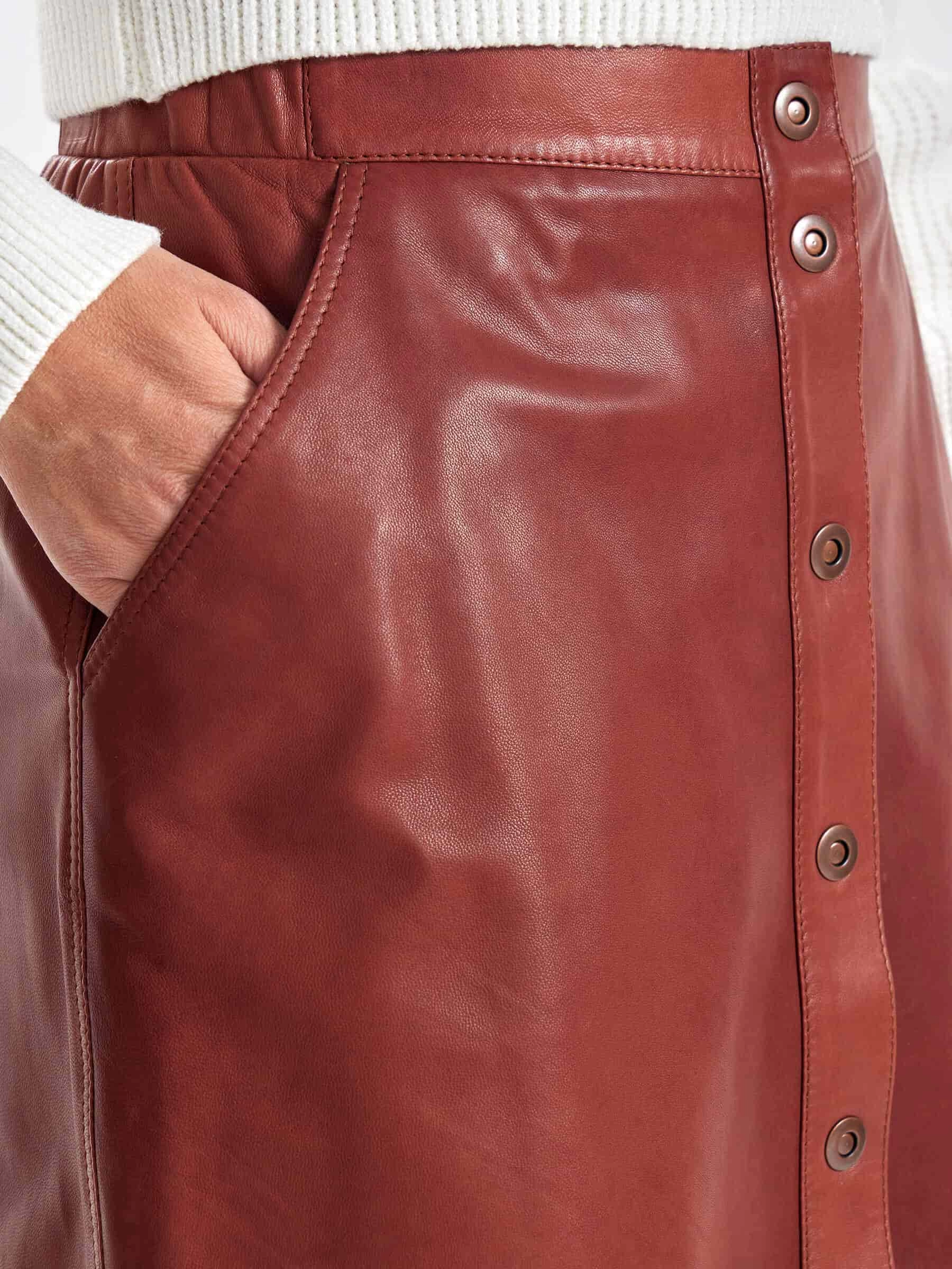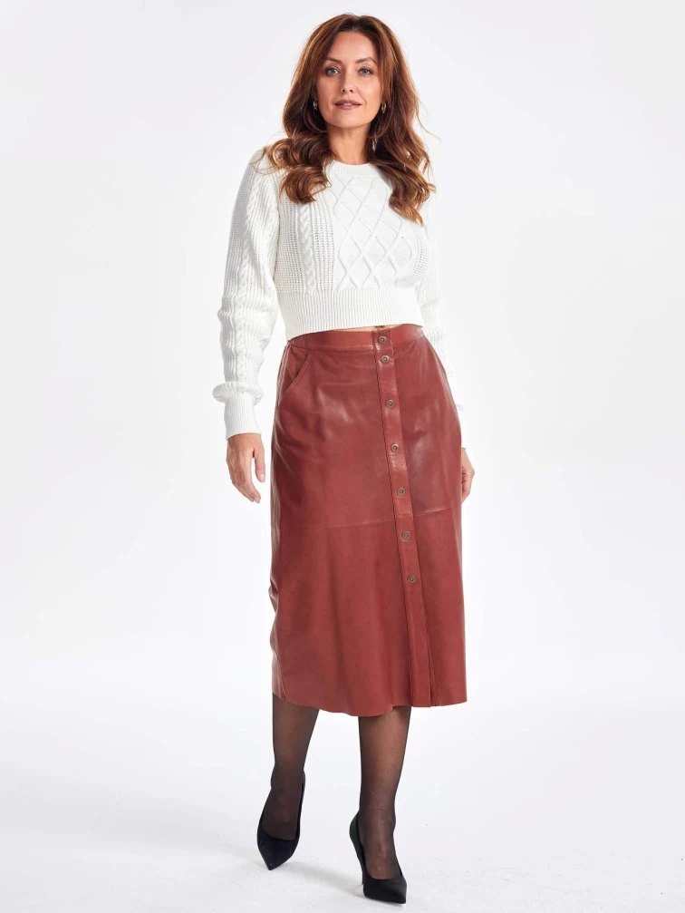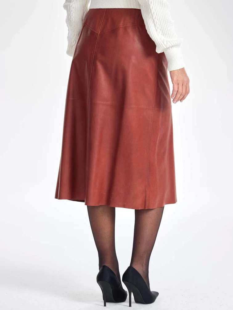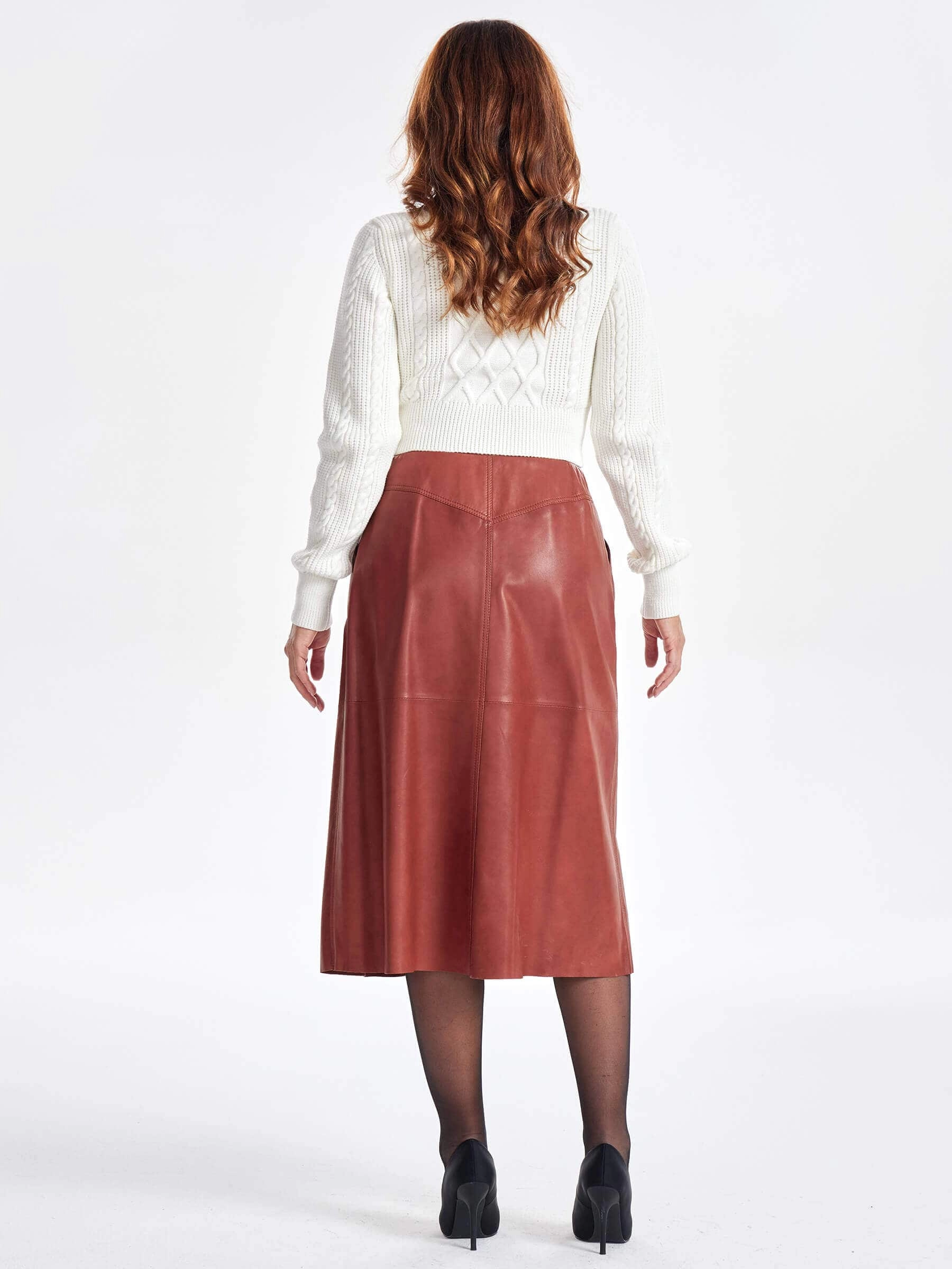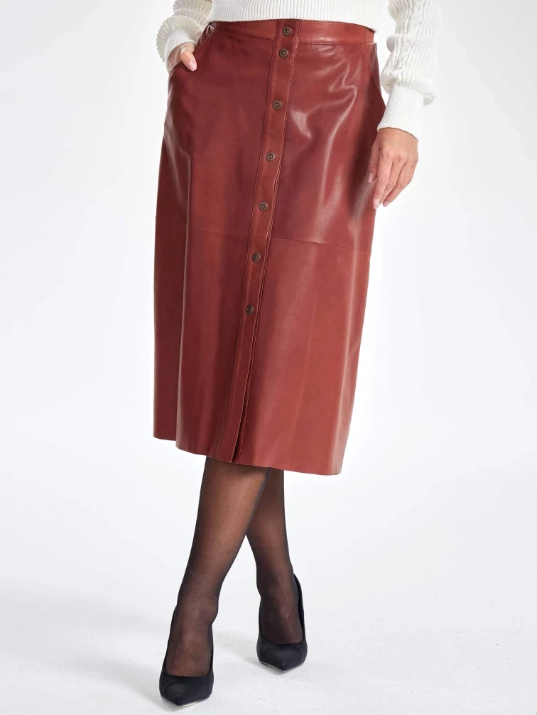 Товар длинная кожаная юбка 08, коньячная, размер 46, артикул 85350 выполнен из натуральной кожи с застежкой кнопки. Рассчитан на сезон: демисезон. Длина изделия 80 см, силуэт расклешенный.