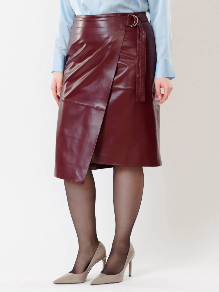 Товар кожаная юбка миди с запахом 07, бордовая, размер 42, артикул 85422 выполнен из натуральной кожи с застежкой молния. Рассчитан на сезон: демисезон. Длина изделия 65 см, силуэт прямой.