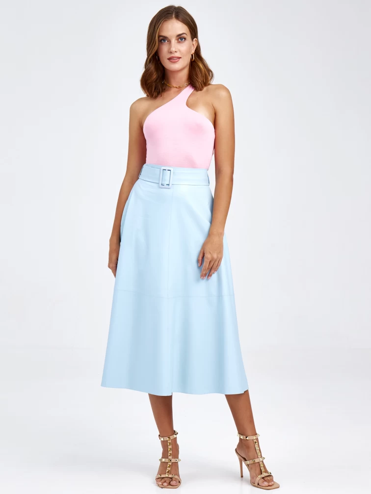 Товар женские кожаная юбка из экокожи 4820757, голубая, размер 48, артикул 85770 выполнен из экокожи с застежкой молния. Рассчитан на сезон: демисезон. Длина изделия 75-90 см, силуэт расклешенный.