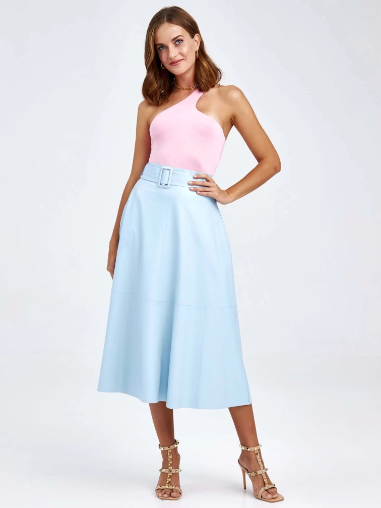 Расклешенная юбка в длине миди- виртуозно справится с любой задачей, будь то блуза, боди или пиджак. Юбка сшита из мягкого материала –Экокожа. Удобные карманы в боковых швах. Не требовательна в уходе. Идеальную посадку по фигуре обеспечит широкий пояс в тон.