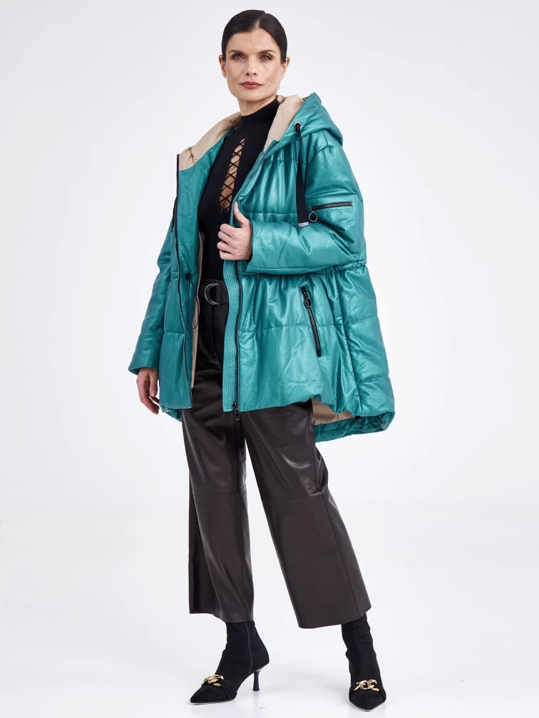 Товар кожаная женская куртка оверсайз с капюшоном премиум класса 3021, зеленая, размер 48, артикул 25470 выполнен из натуральной кожи с застежкой молния. Рассчитан на сезон: демисезон. Длина изделия 75-90 см, силуэт свободный.