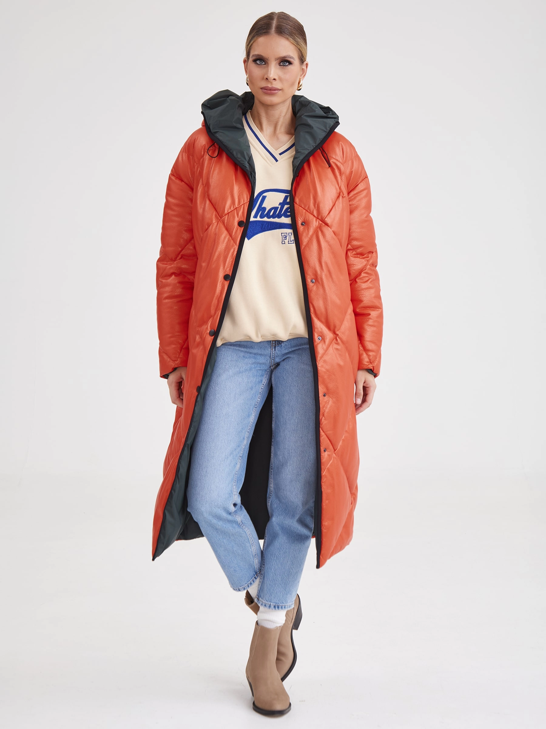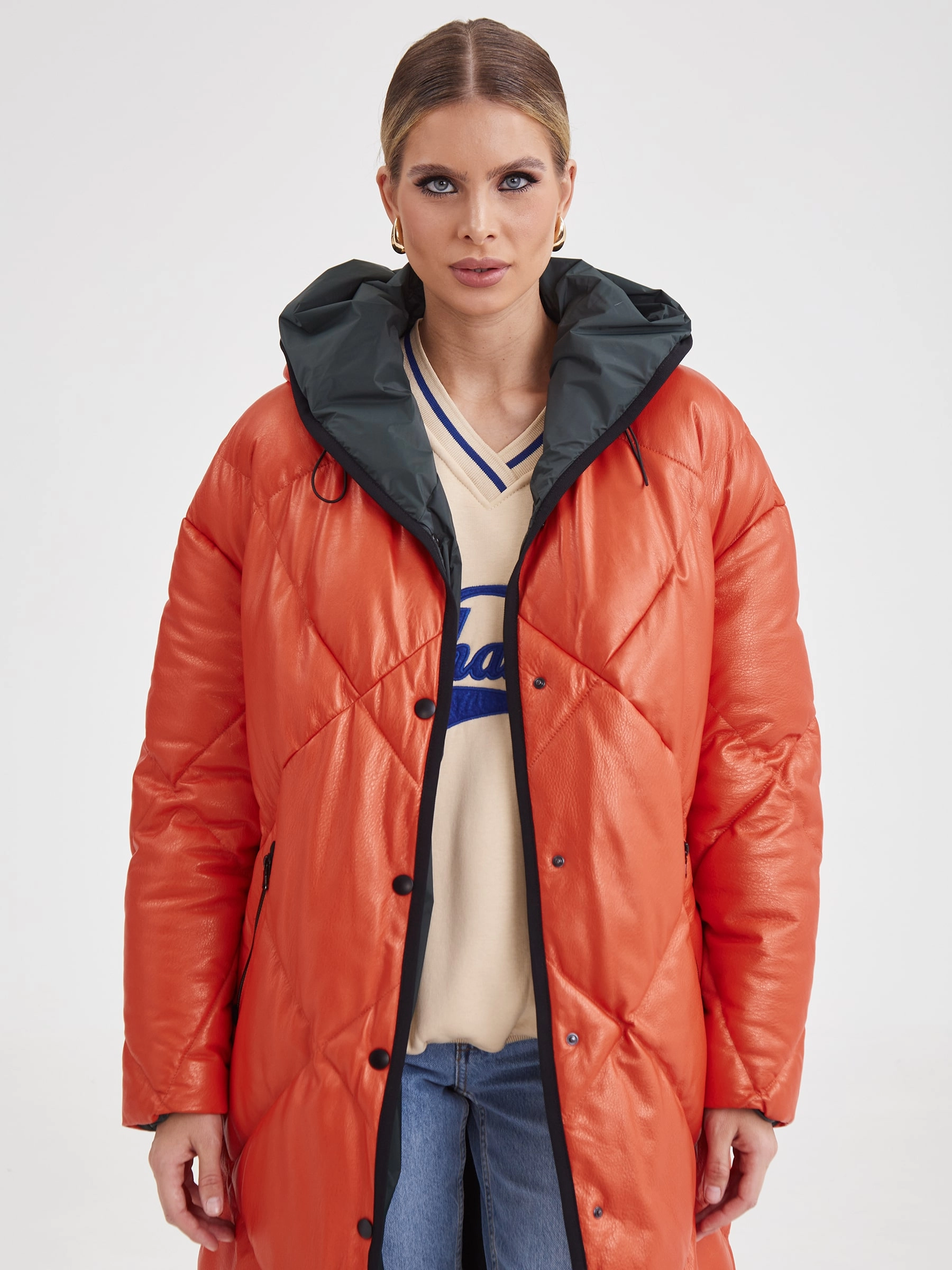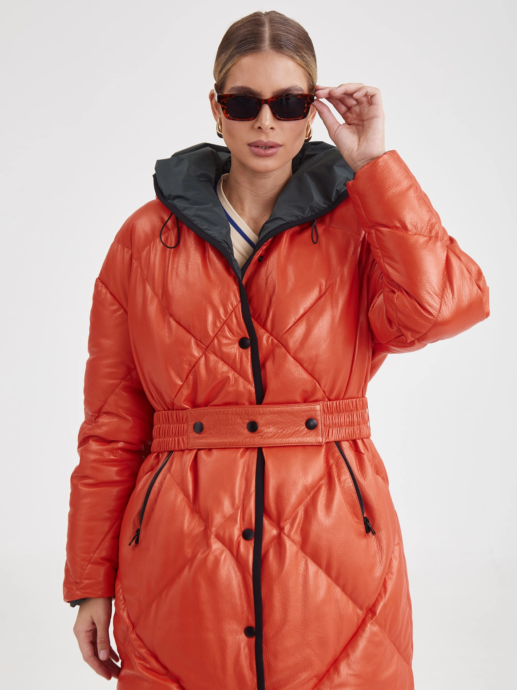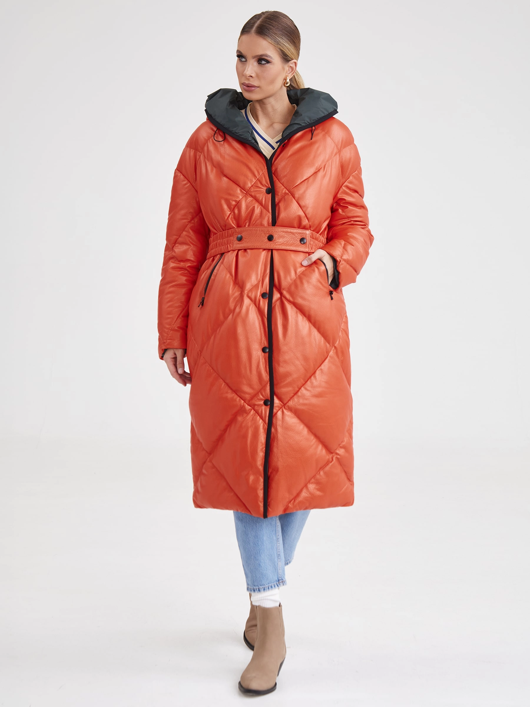 Товар кожаное женское стеганое пальто с капюшоном премиум класса 3026, оранжевое, размер 48, артикул 25410 выполнен из натуральной кожи с застежкой кнопки. Рассчитан на сезон: осень-зима. Длина изделия свыше 90 см, силуэт прямой.