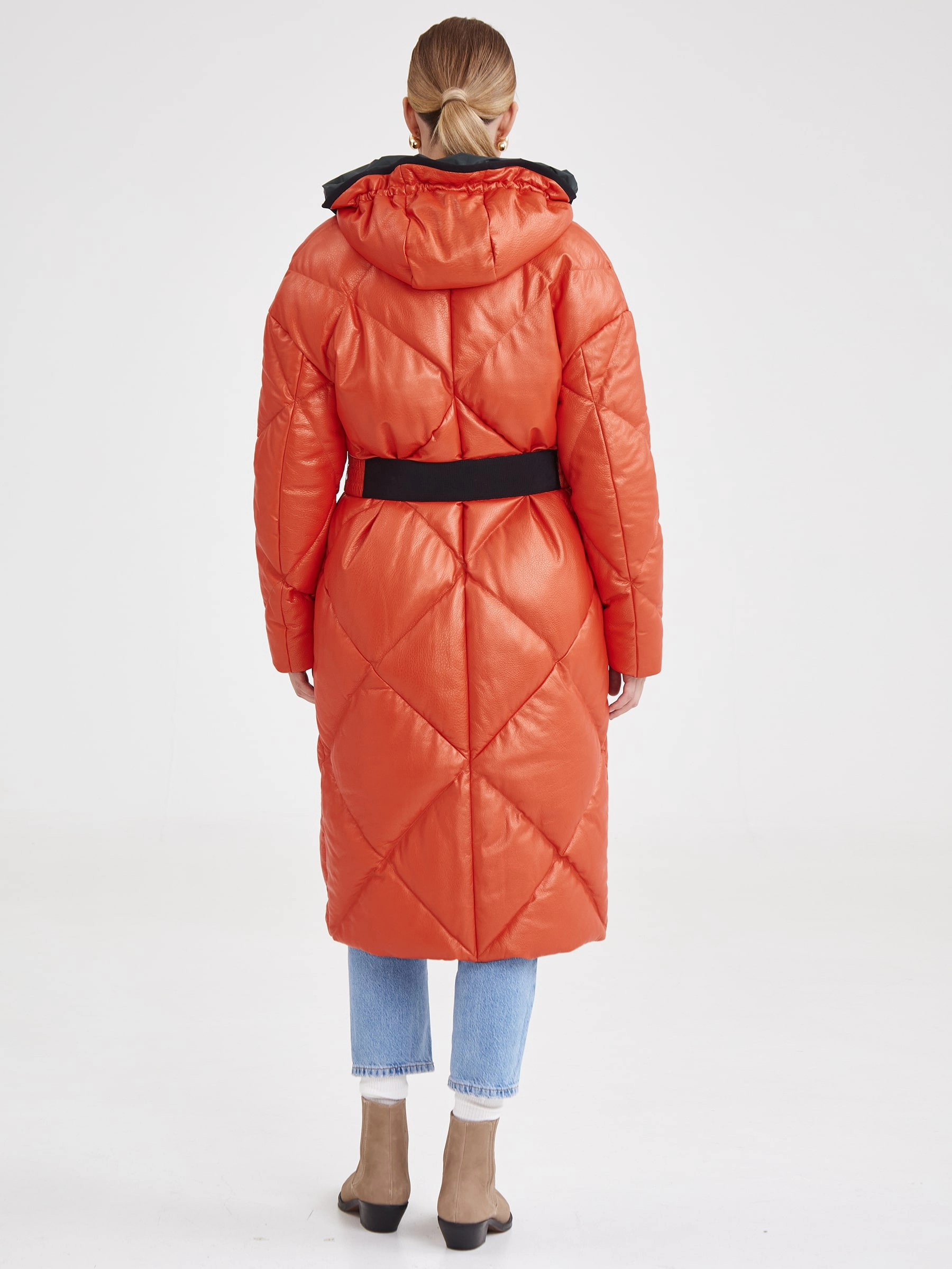 Кожаное женское стеганое пальто с капюшоном премиум класса 3026, оранжевое, размер 48, артикул 25410