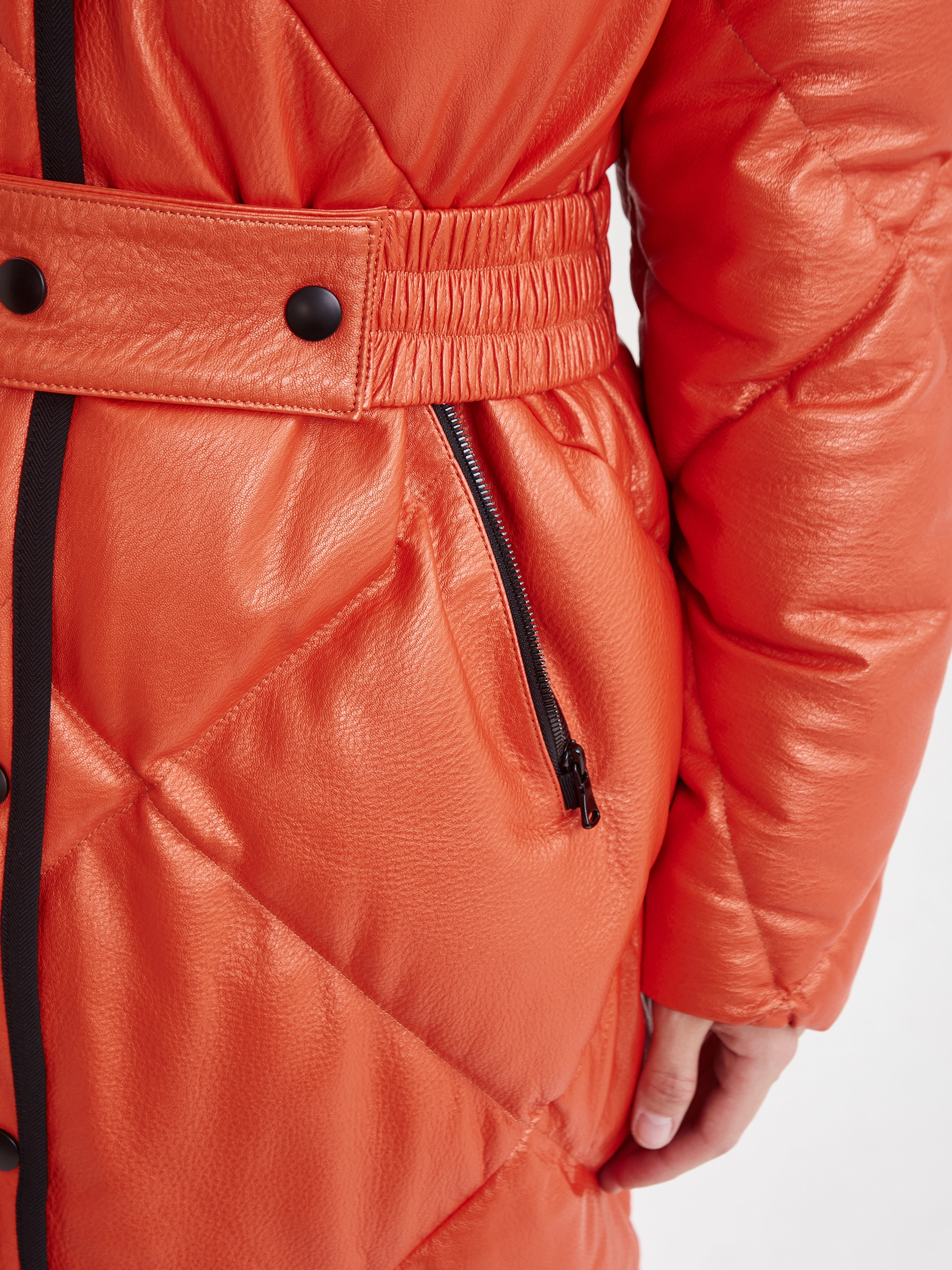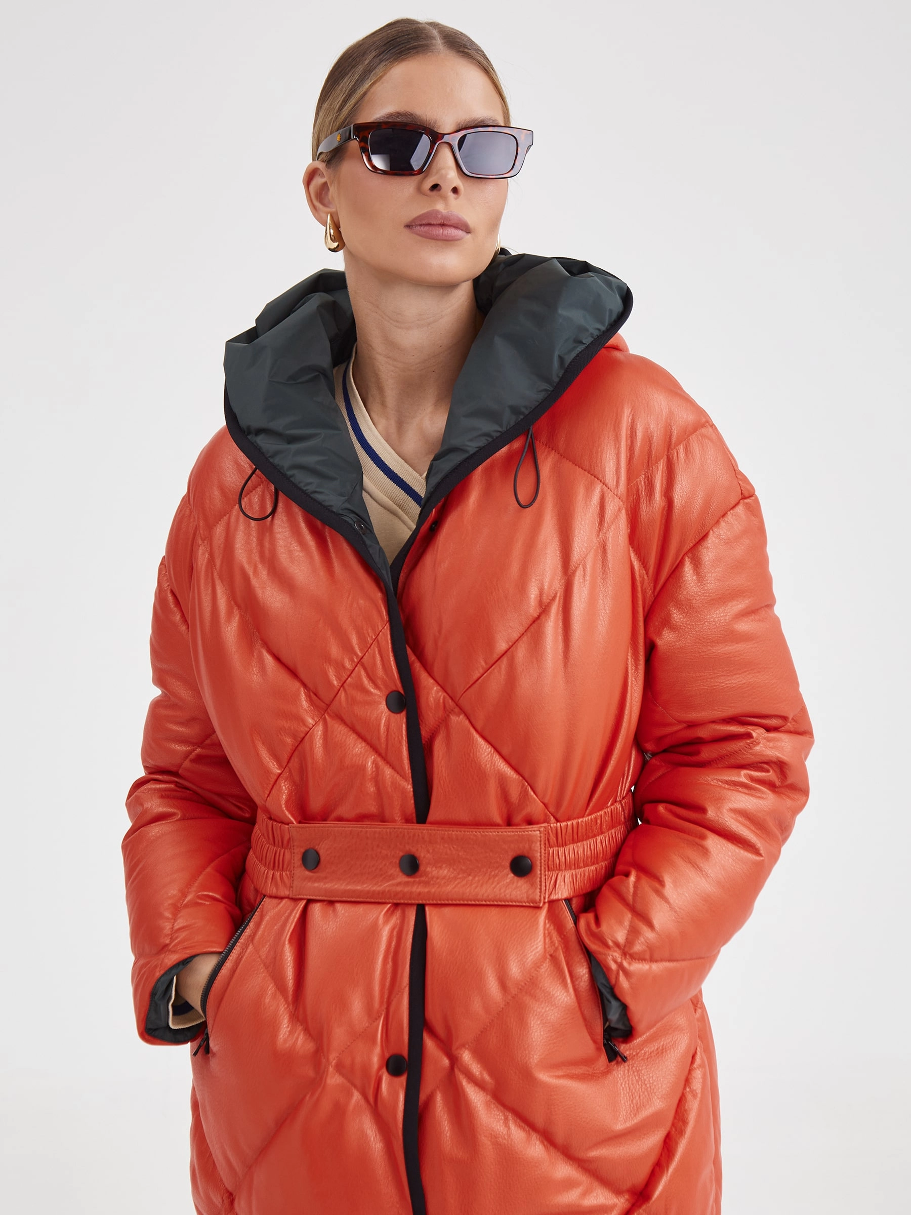 Этот пальто - пуховик прямого кроя из натуральной кожи премиум качества. Никакого лишнего декора. Оранжевый цвет- говорит нам о своей мощной жизнерадости. Застежка - кнопки, объемный капюшон дополнен регулирующими тонкими шнурками. Утеплитель-немецкий синтепон Френденберг. Отличная теплоизоляция, превосходная парапроницаемость, простой уход. Всегда стильно и тепло.