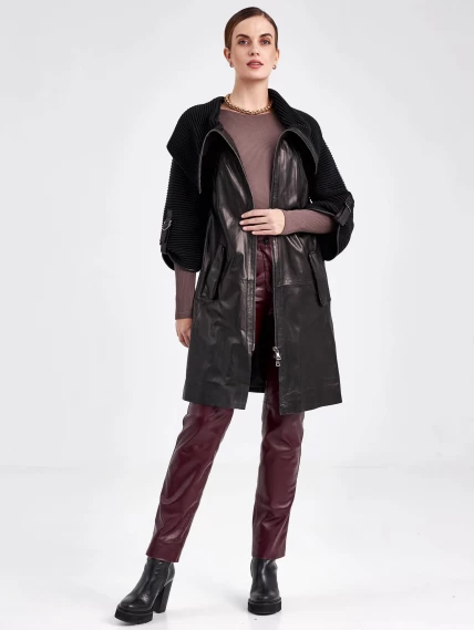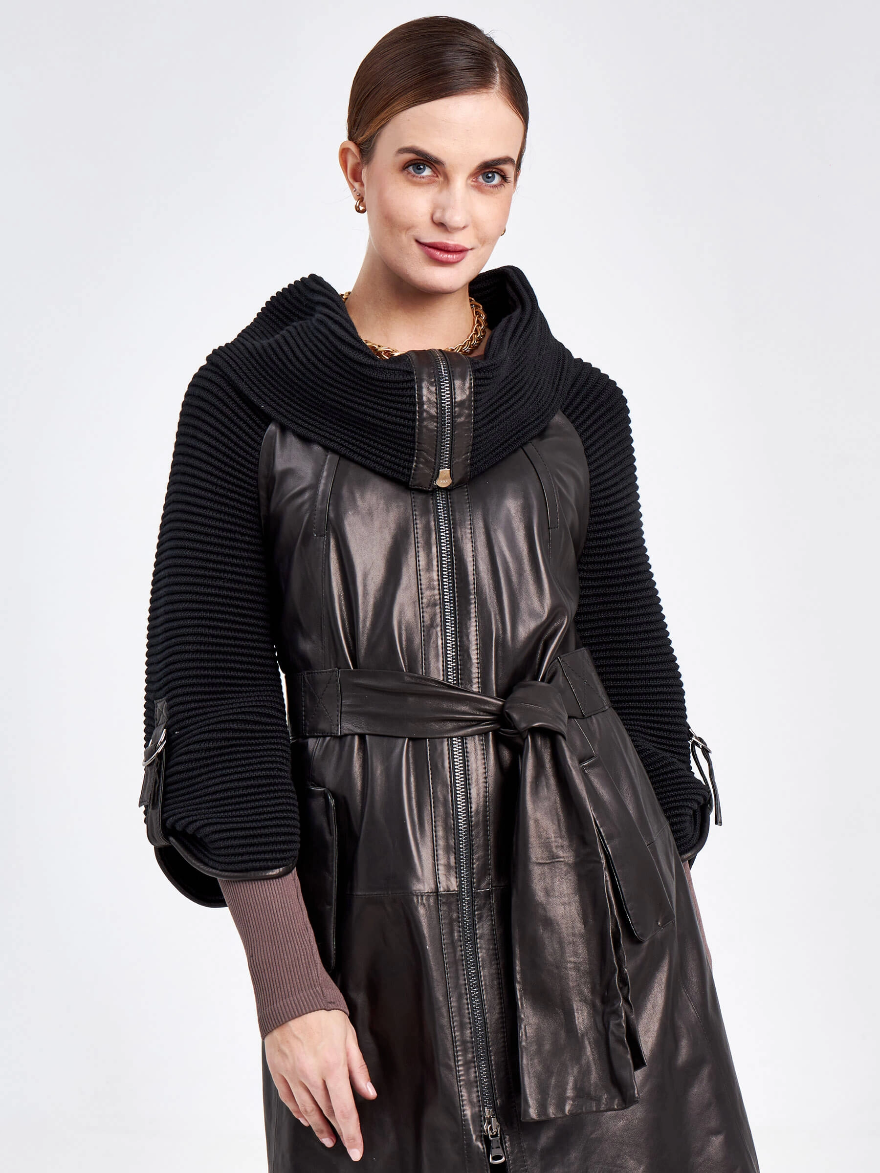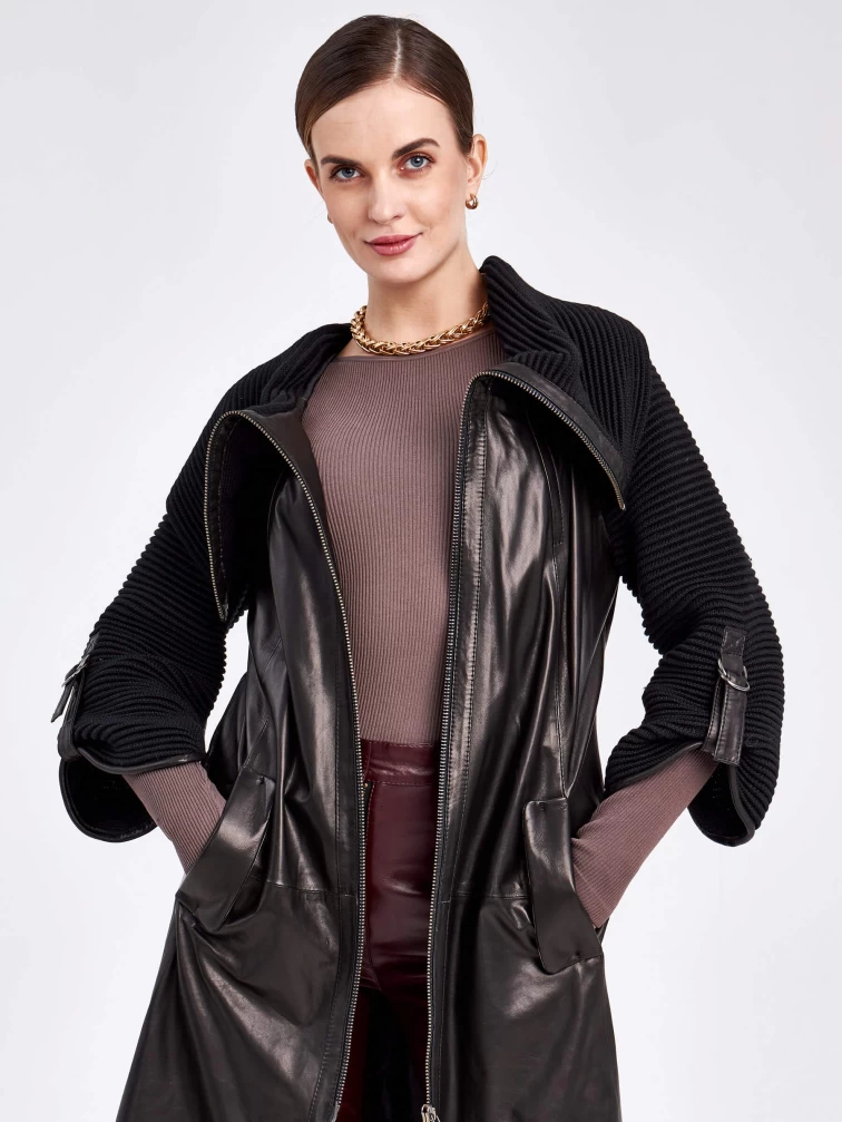 Кожаный плащ женский 396, с трикотажными рукавами, черный, размер 46, артикул 91740