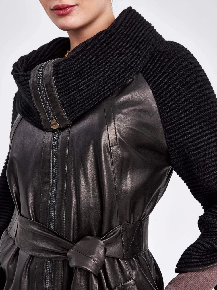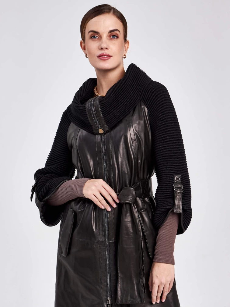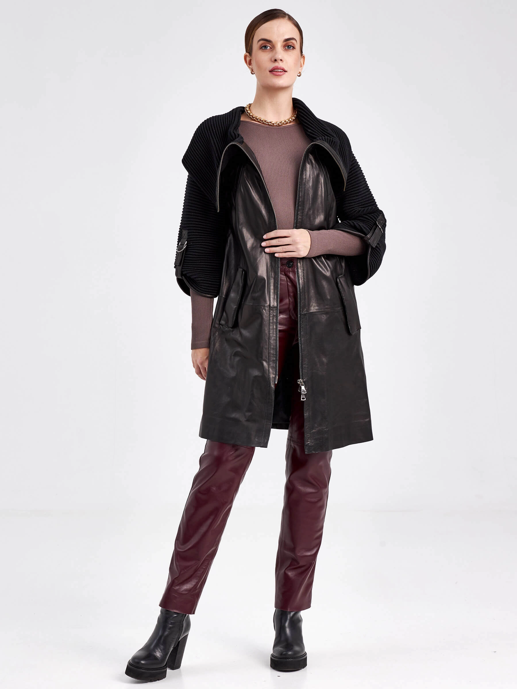 Создавая эту модель, мастера использовали натуральную мягкую кожу в тандеме с плотным трикотажем. Полуприлегающий силуэт.Объемный воротник, двухзамковая молния. Рукава изделия дополнили регулирующими кожаными ремешками. Этот плащ дарит не только комфорт, но и подчеркивает женственность.