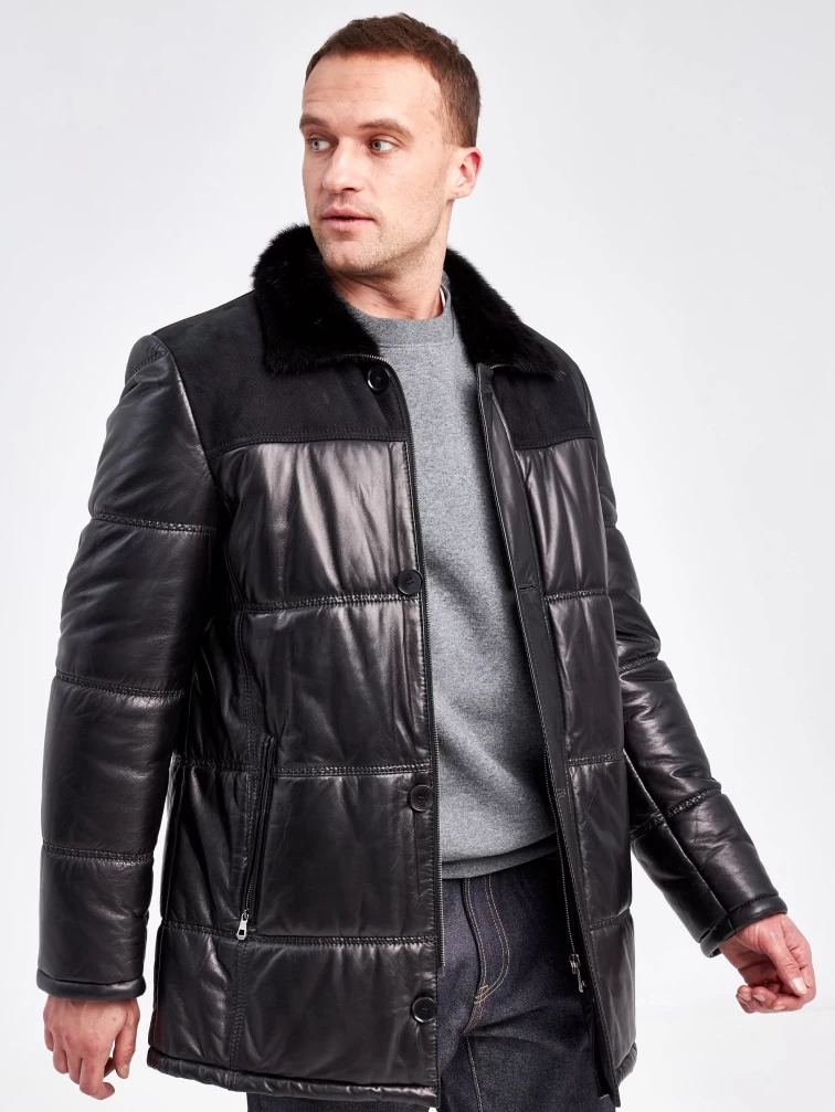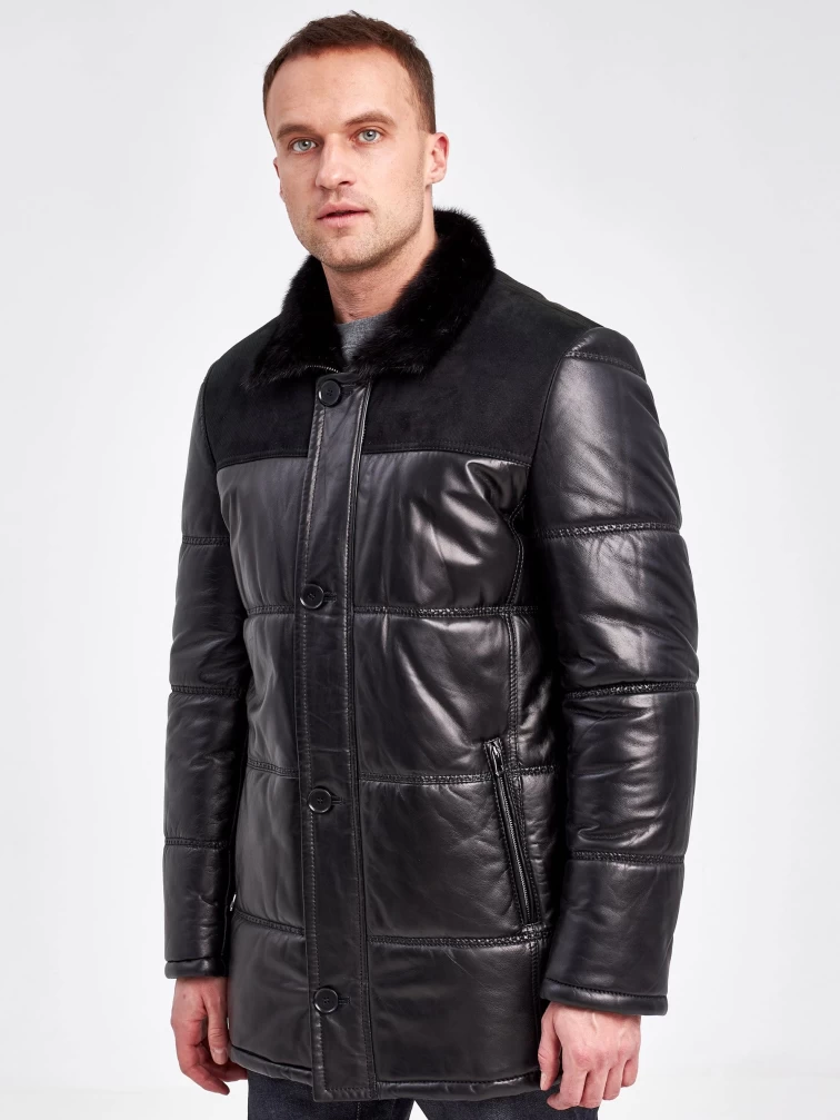 Зимний кожаный мужской пуховик с воротником меха норки 50014, черный, размер 50, артикул 40860