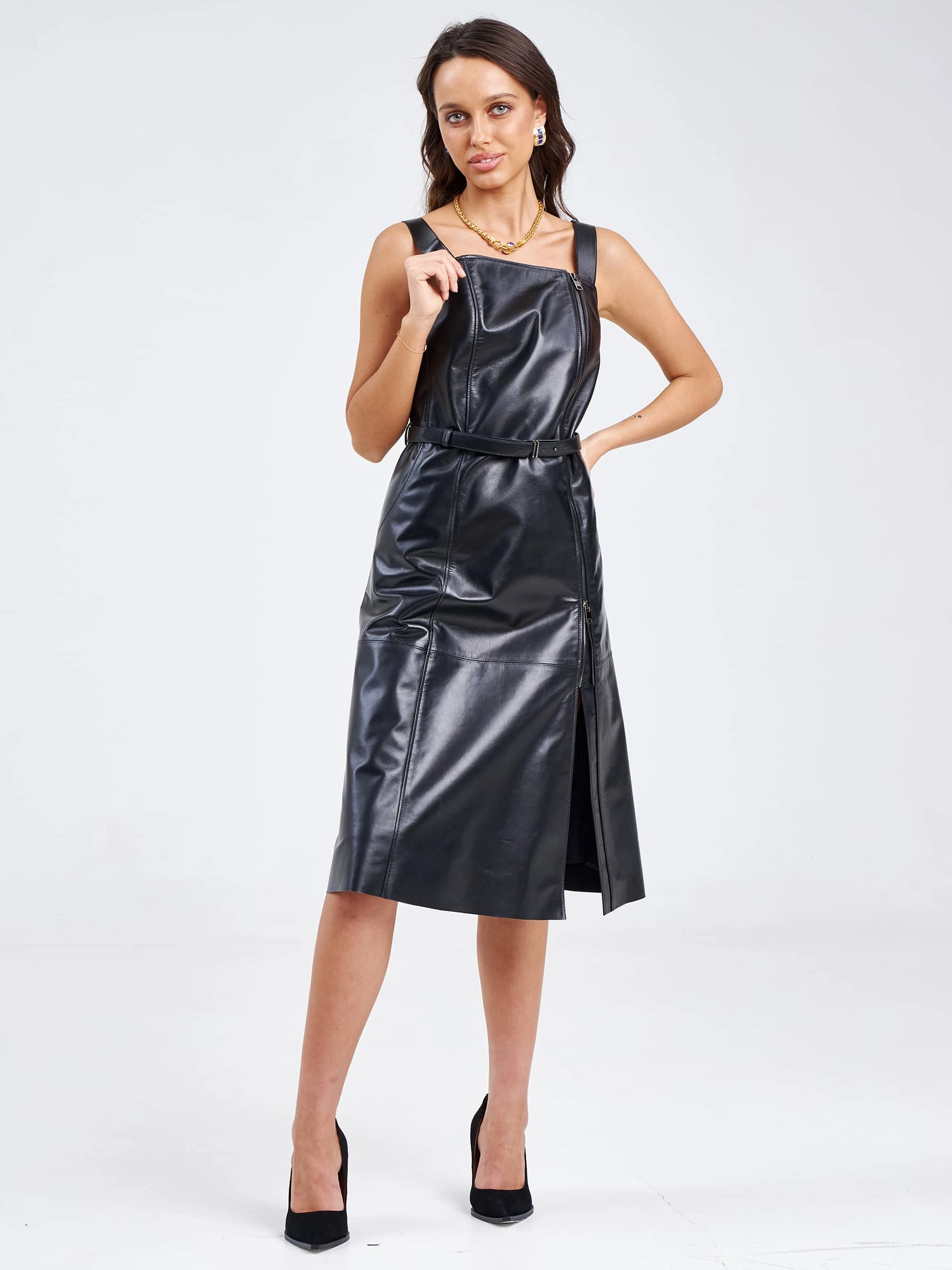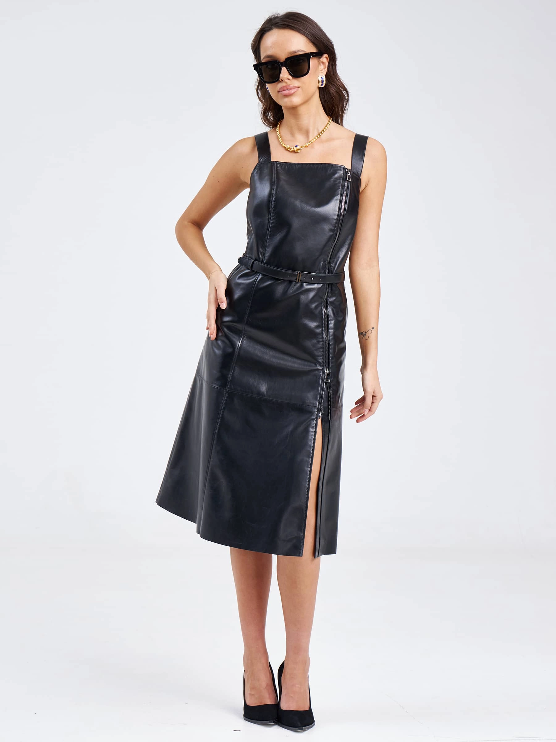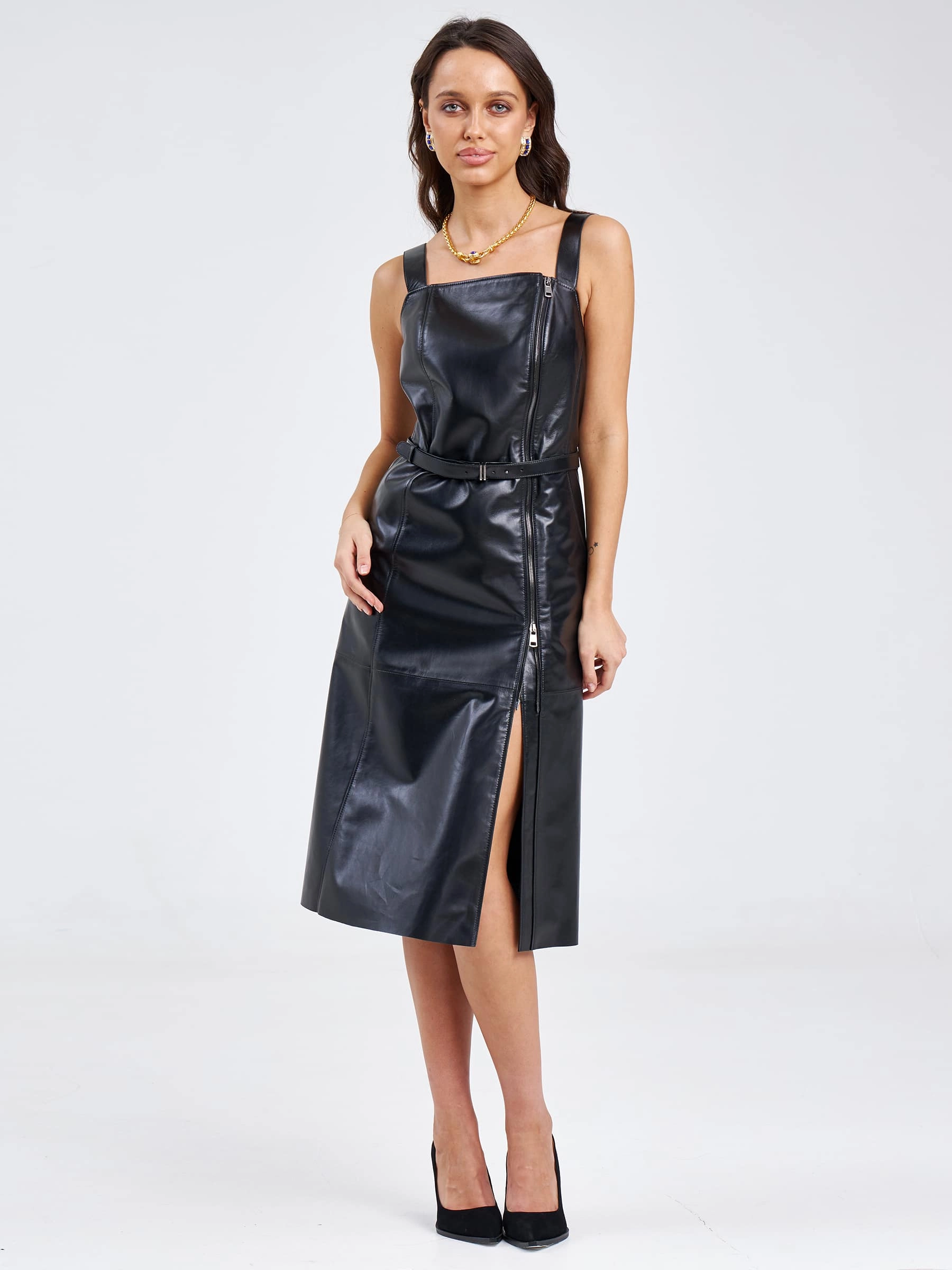 Товар женский сарафан из натуральной кожи 03, черный, размер 50, артикул 85200 выполнен из натуральной кожи с застежкой бретели. Рассчитан на сезон: весна-лето. Длина изделия 86 см, силуэт приталенный .