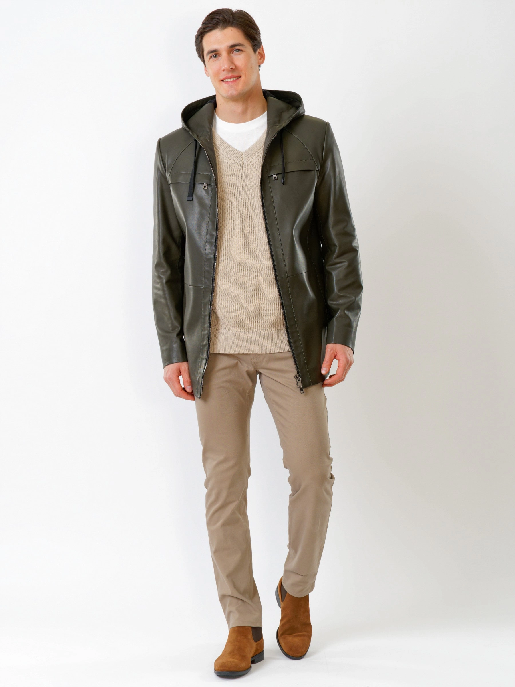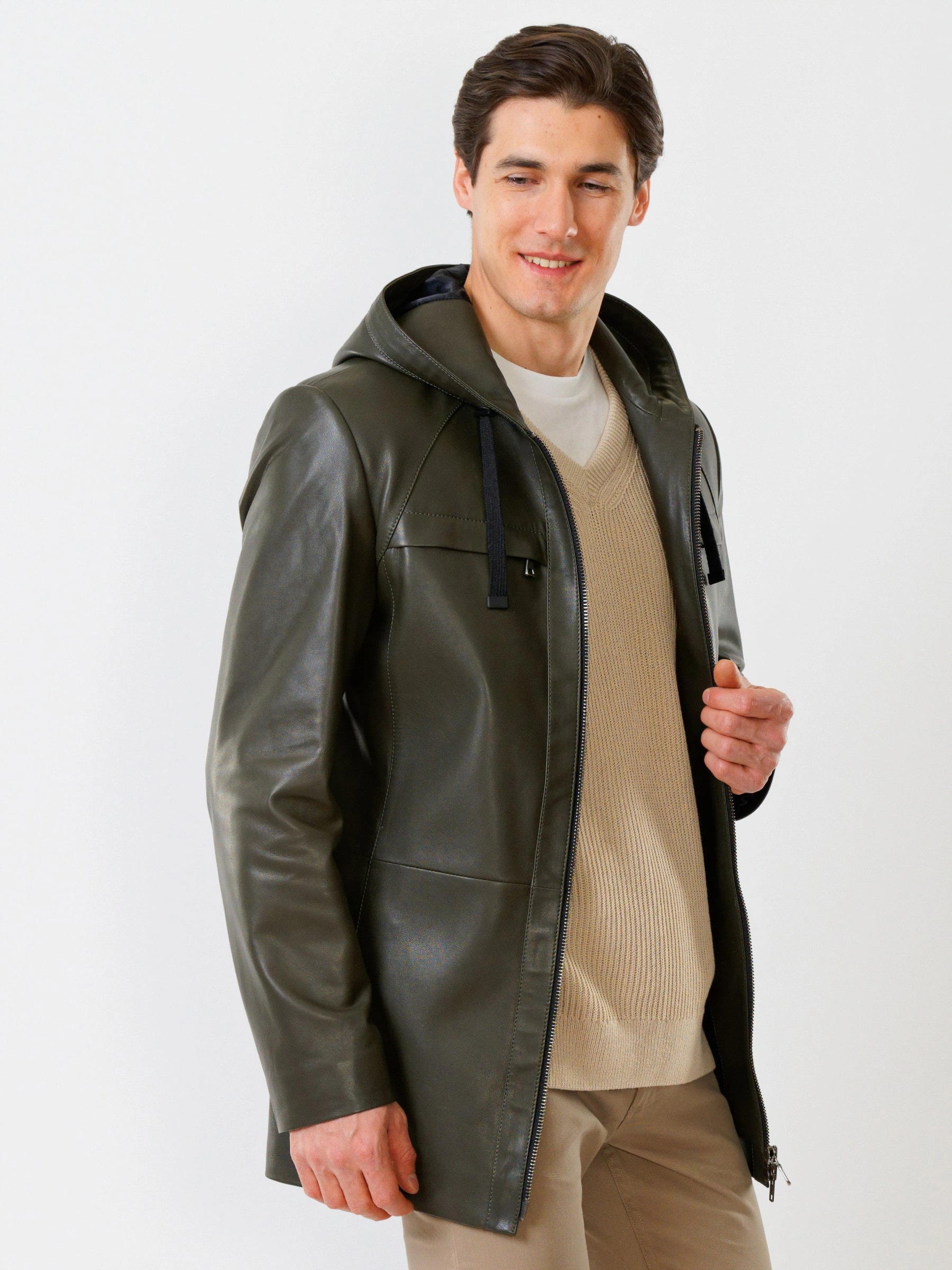 Удлиненная мужская кожаная куртка с капюшоном премиум класса 552, оливковая, размер 48, артикул 28760