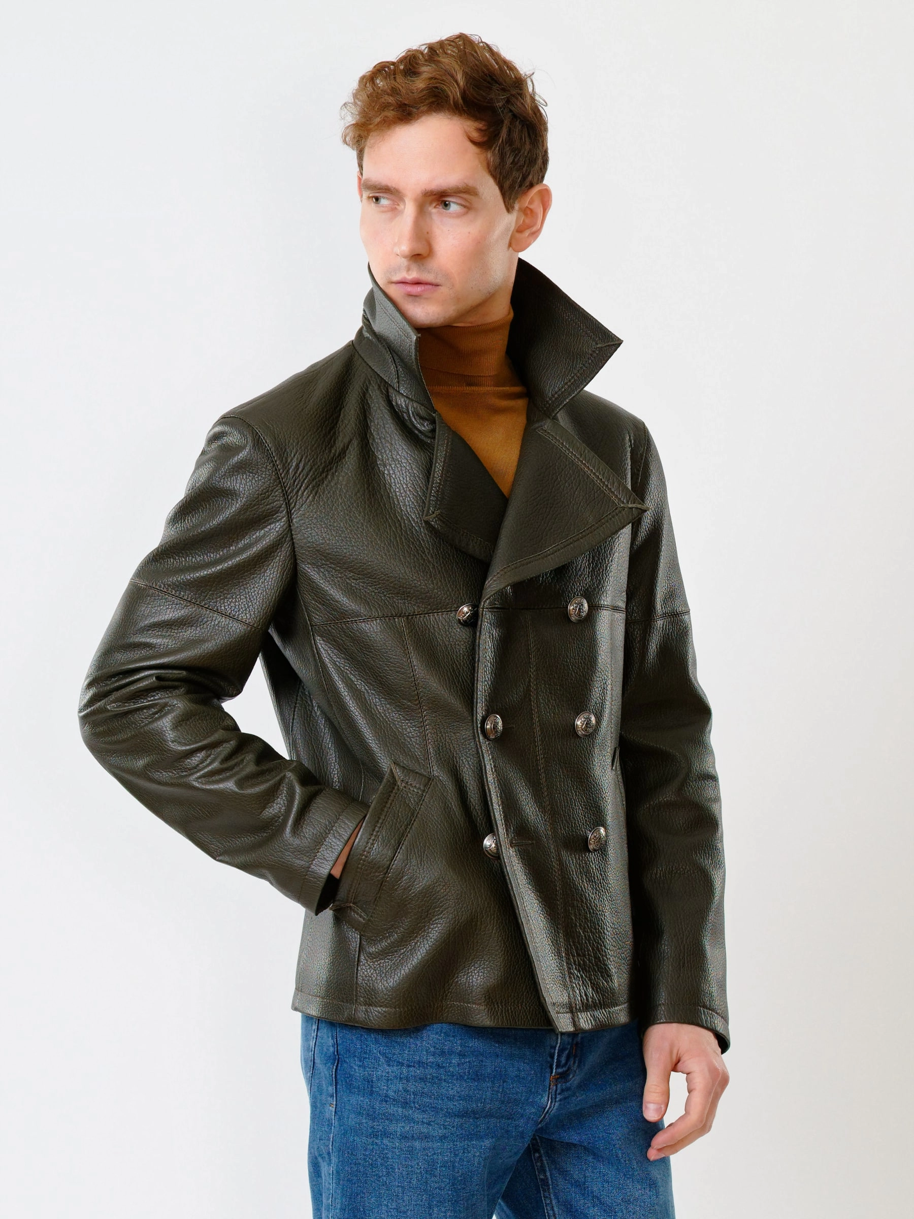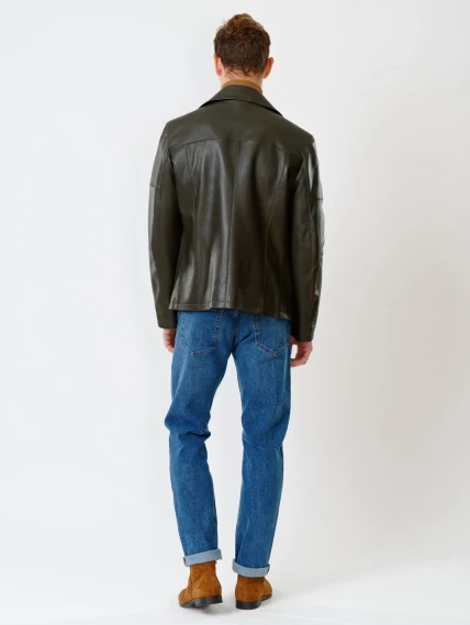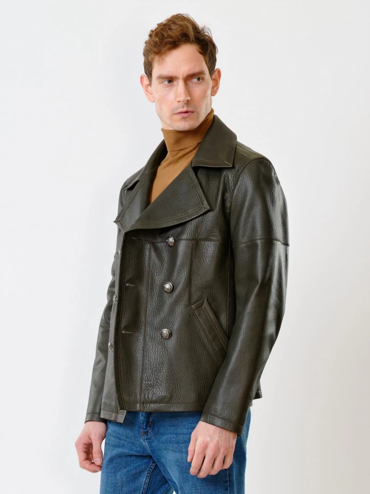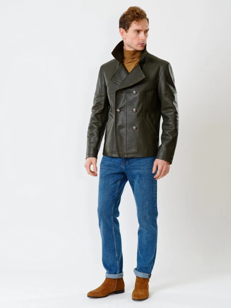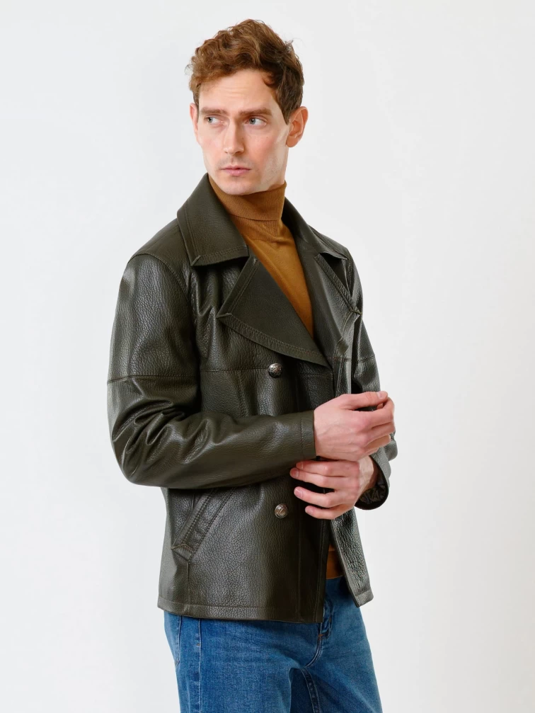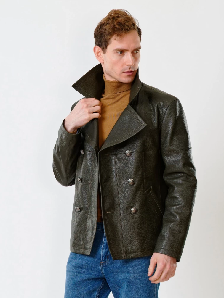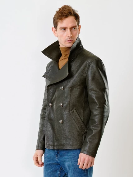 Двубортная мужская кожаная куртка Клуб, оливковая, размер 48, артикул 28390