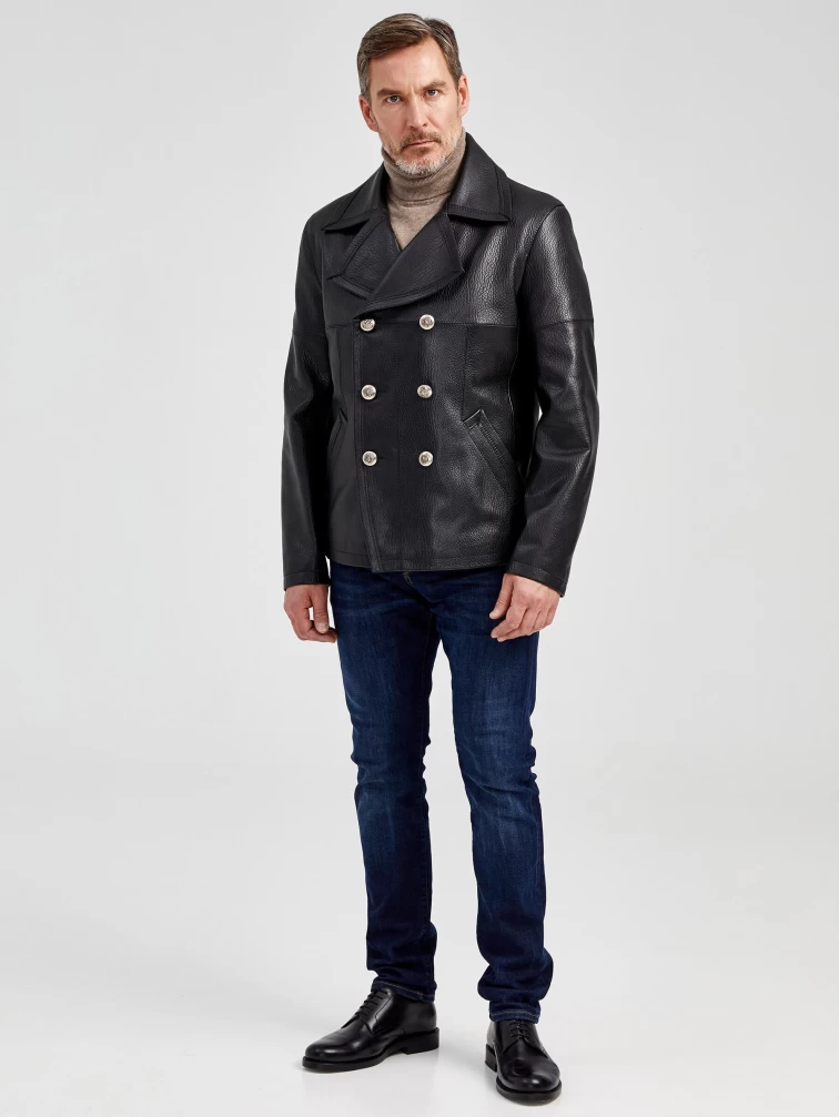 Товар двубортная мужская кожаная куртка клуб, черная, размер 48, артикул 28982 выполнен из натуральной кожи с застежкой пуговицы. Рассчитан на сезон: весна-лето. Длина изделия 78см, силуэт полуприлегающий.
