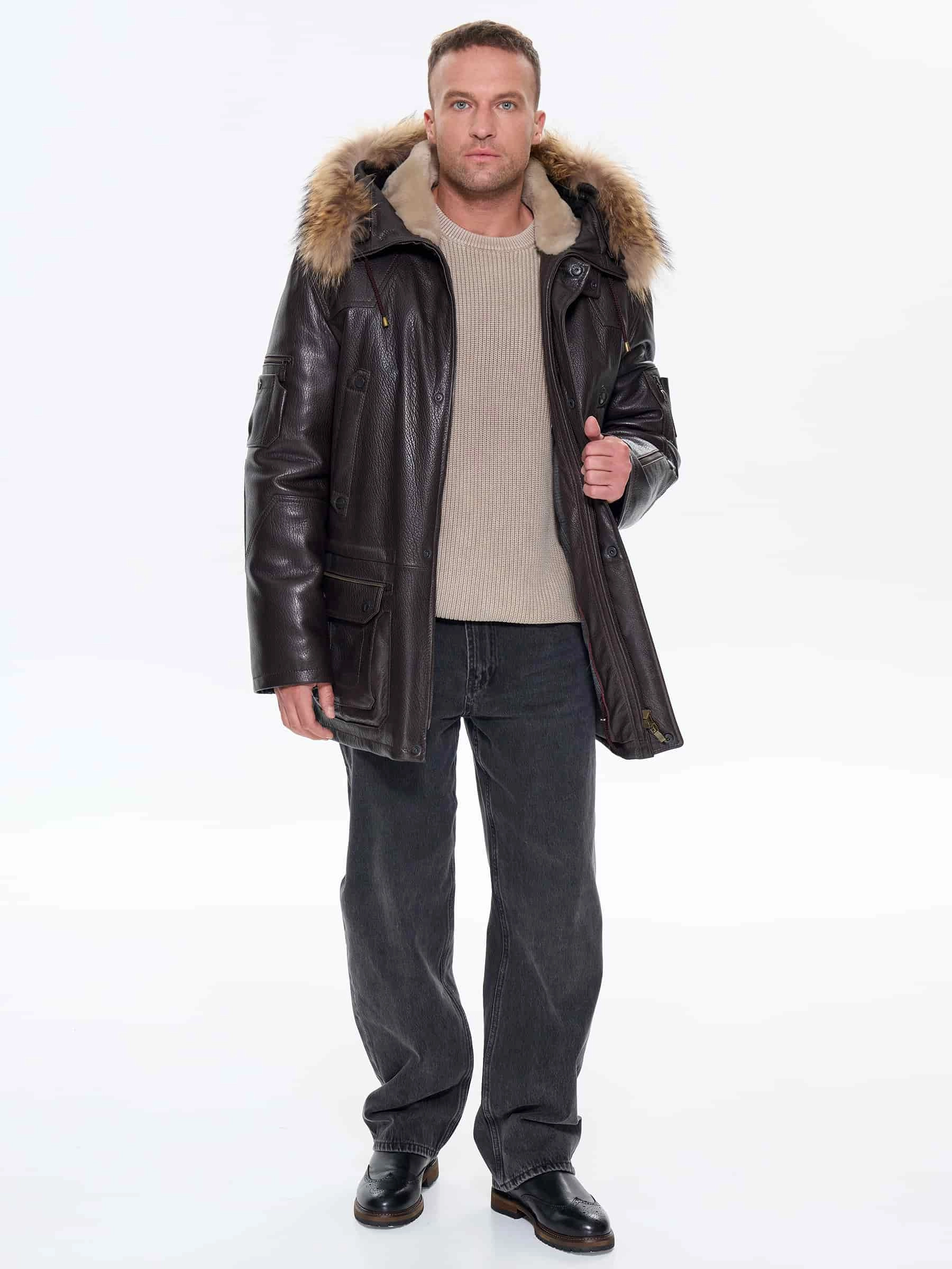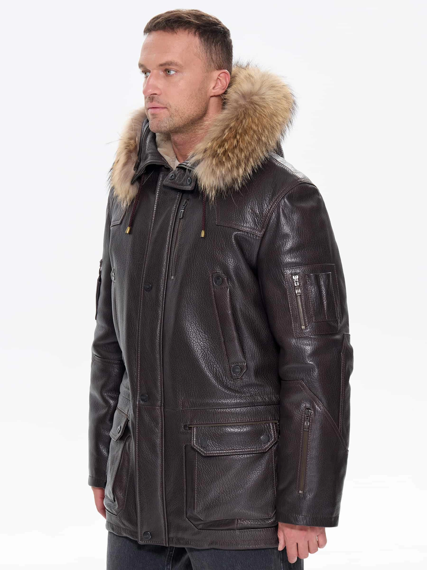 Утепленная мужская кожаная куртка аляска с мехом енота Алекс, коричневая, размер 52, артикул 40300