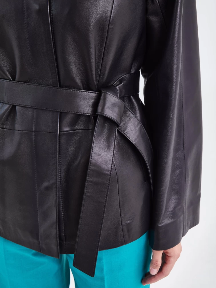 Куртка из натуральной кожи на потайных кнопках с элегантным круглым вырезом без воротника и рукавами реглан. Прямой силуэт в повседневном стиле дополнен широким регулируемым поясом, создающим эффект «песочные часы», и практичными боковыми карманами. Идеально сочетается с юбками-карандаш, водолазками, темными джинсами и ботильонами, добавляя образу утонченную элегантность. Качество кожи — премиальное!