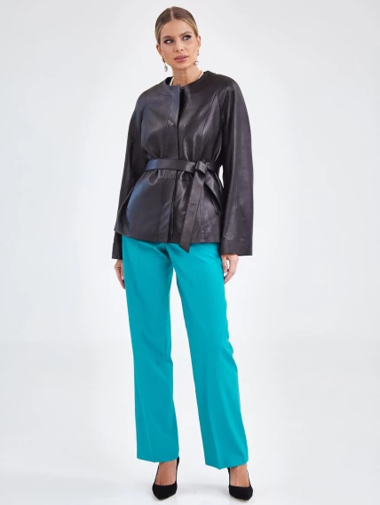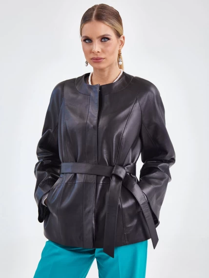 Кожаная женская куртка без воротника с поясом 3019, черная, размер 50, артикул 92110