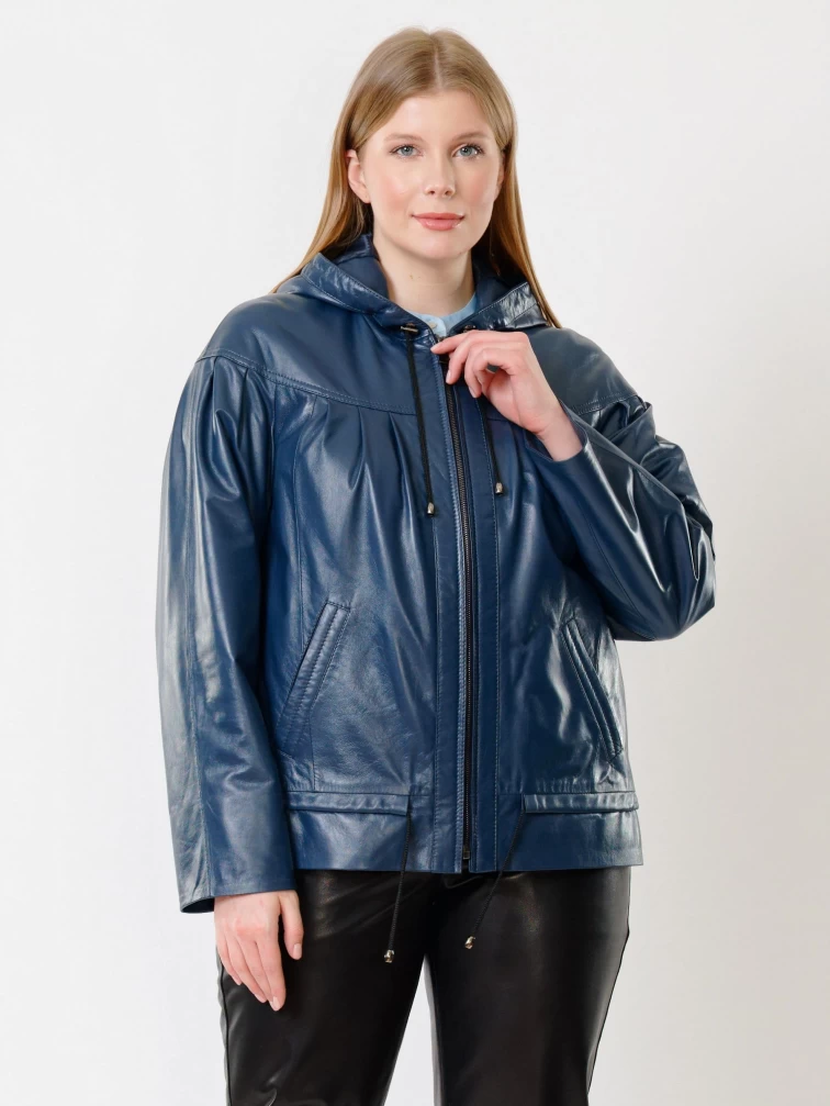 Кожаная женская куртка с капюшоном 303, синяя, размер 54, артикул 91190