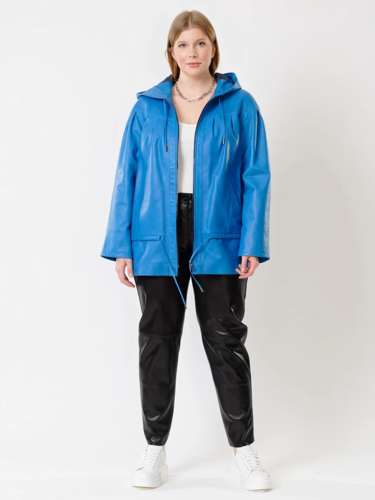 Товар кожаная женская куртка с капюшоном 303у, голубая, размер 54, артикул 91201 выполнен из натуральной кожи с застежкой молния. Рассчитан на сезон: весна-лето. Длина изделия 75 см, силуэт свободный.