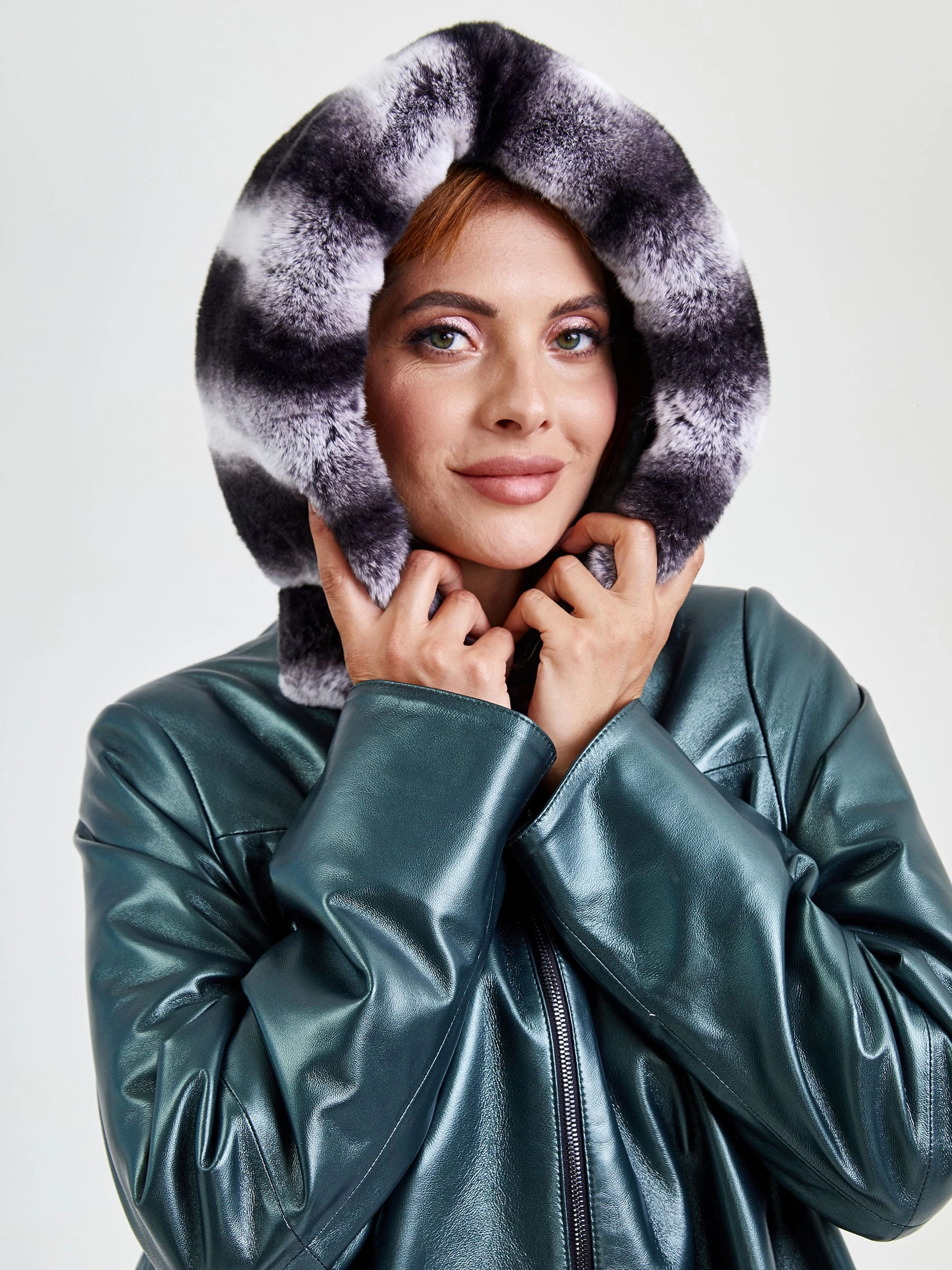 Кожаная женская куртка с капюшоном и мехом "рекса" 308уш, зеленый, размер 56, артикул 91751