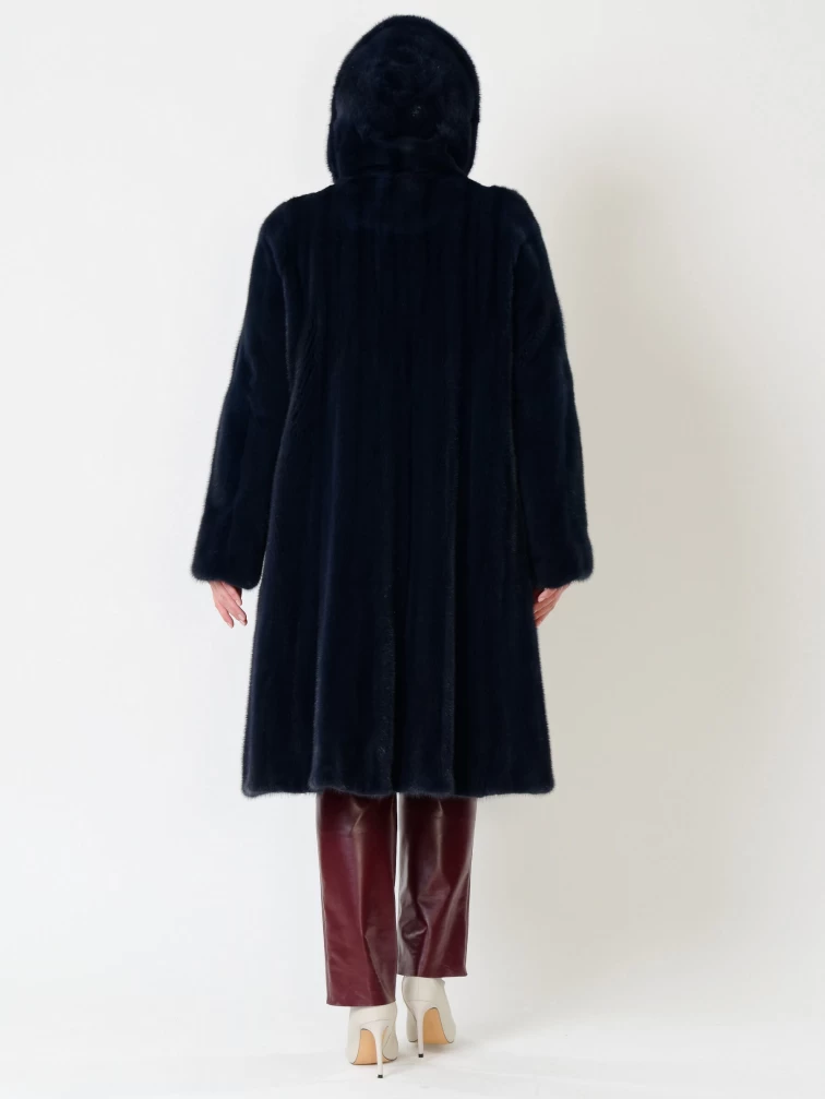 Пальто из меха норки датской селекции. Мех тонирован в глубокий синий цвет. Удобный капюшон. Все технологические швы продублированы на х/б кромку вручную. Аккуратность во всей работе. Необыкновенно комфортная посадка по фигуре. Прекрасная свобода движений.
