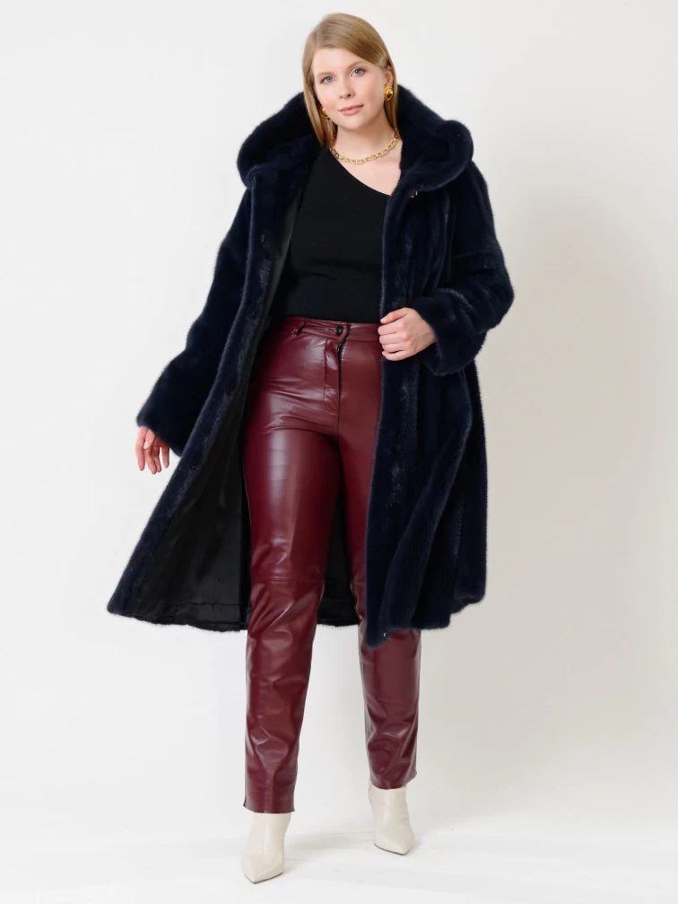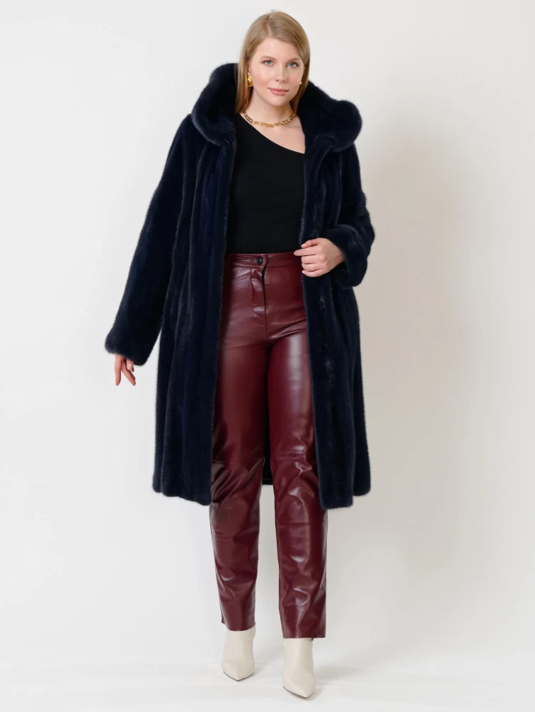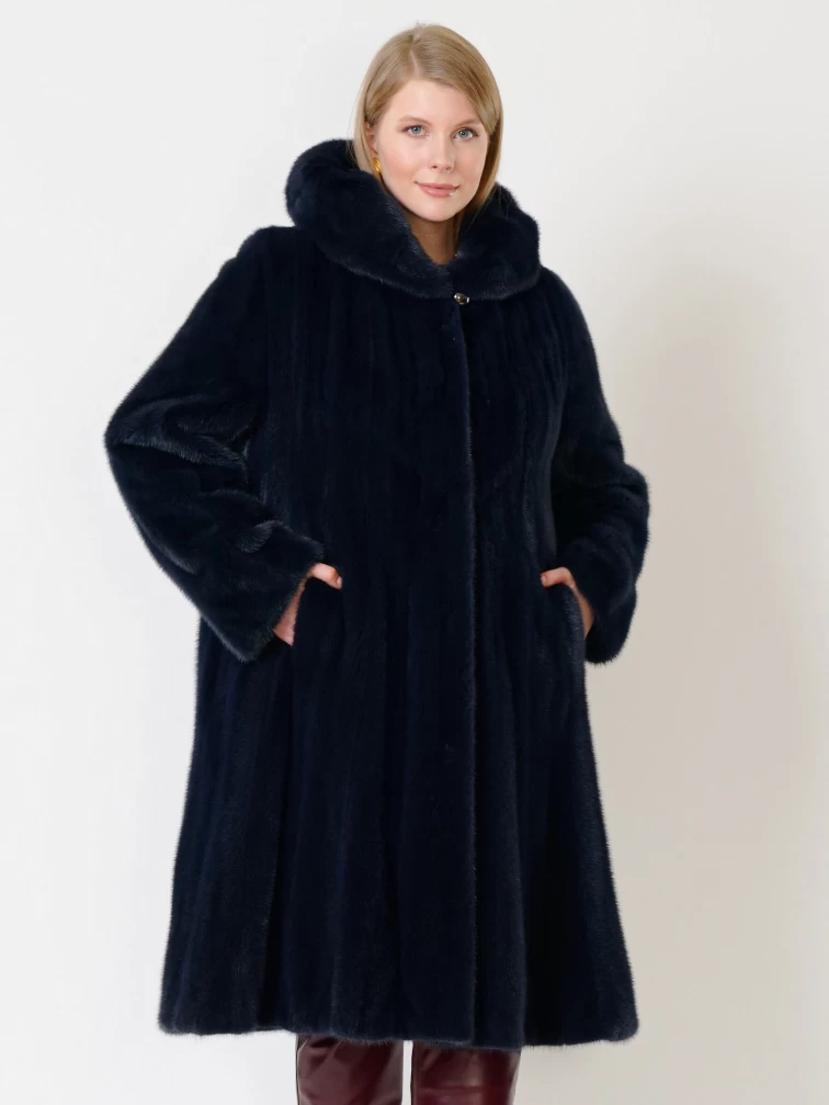 Товар норковая женская шуба с капюшоном 4021(к), синяя, размер 52, артикул 32730 выполнен из норка крашенной с застежкой клипсы. Рассчитан на сезон: осень-зима. Длина изделия свыше 90 см, силуэт прямой.