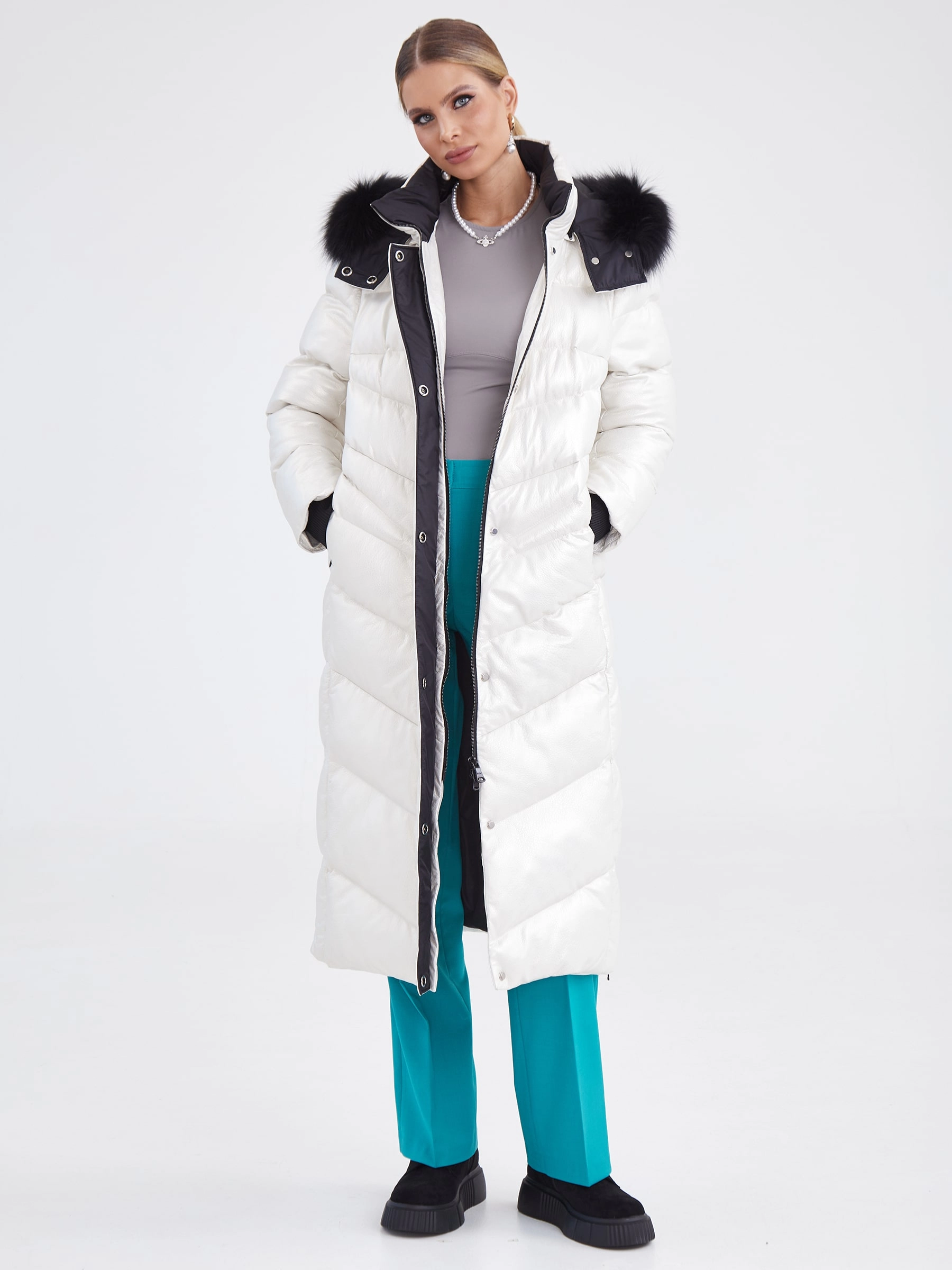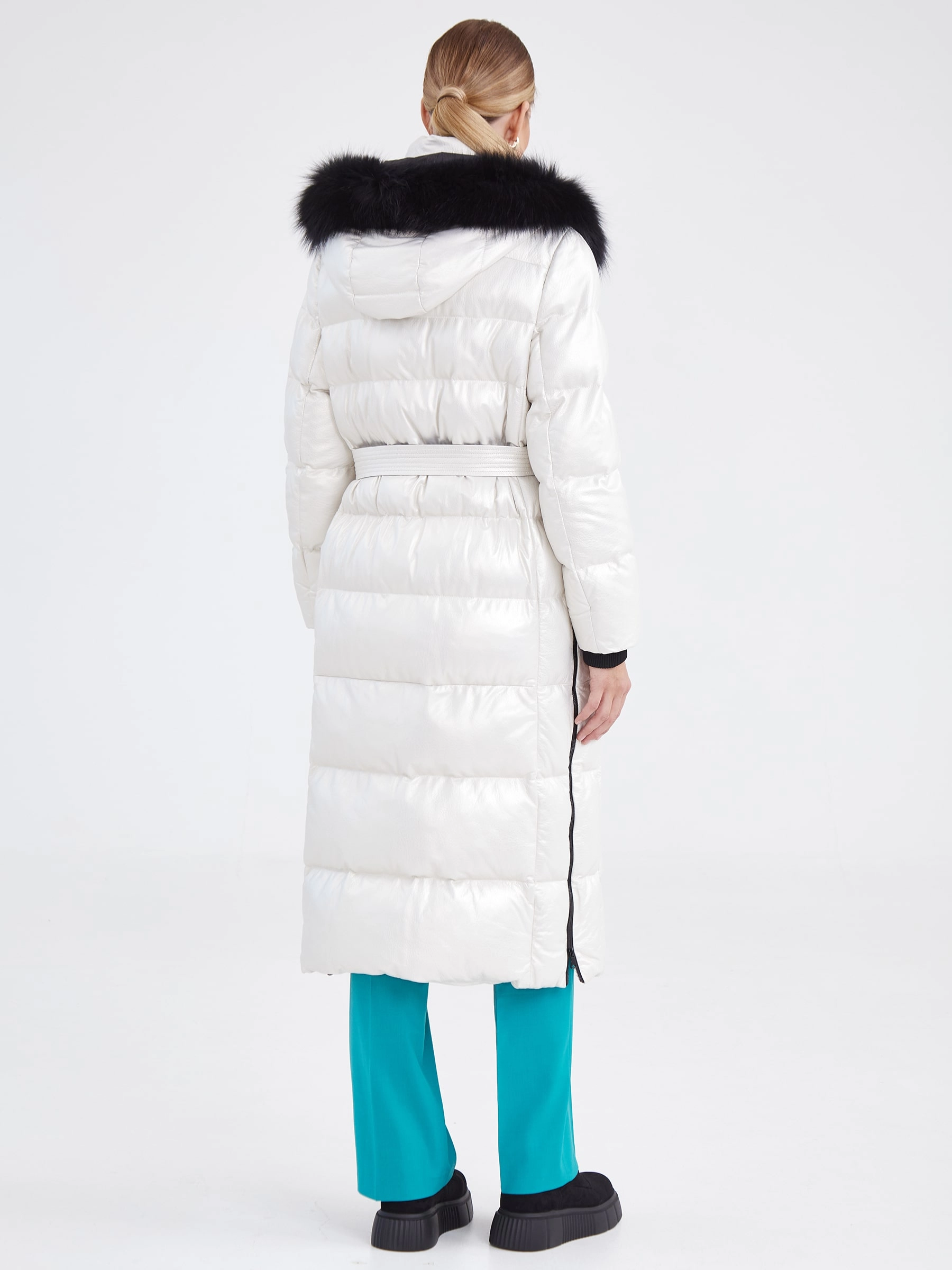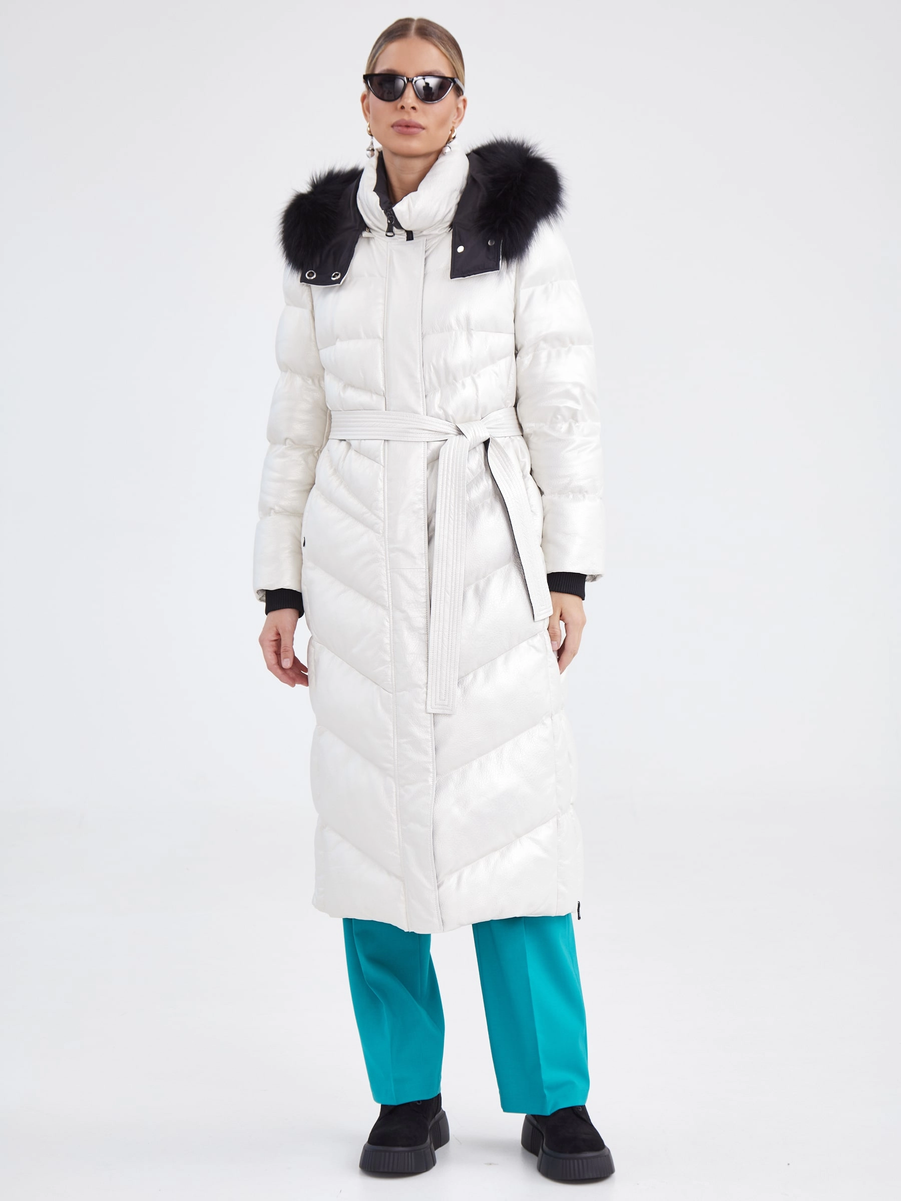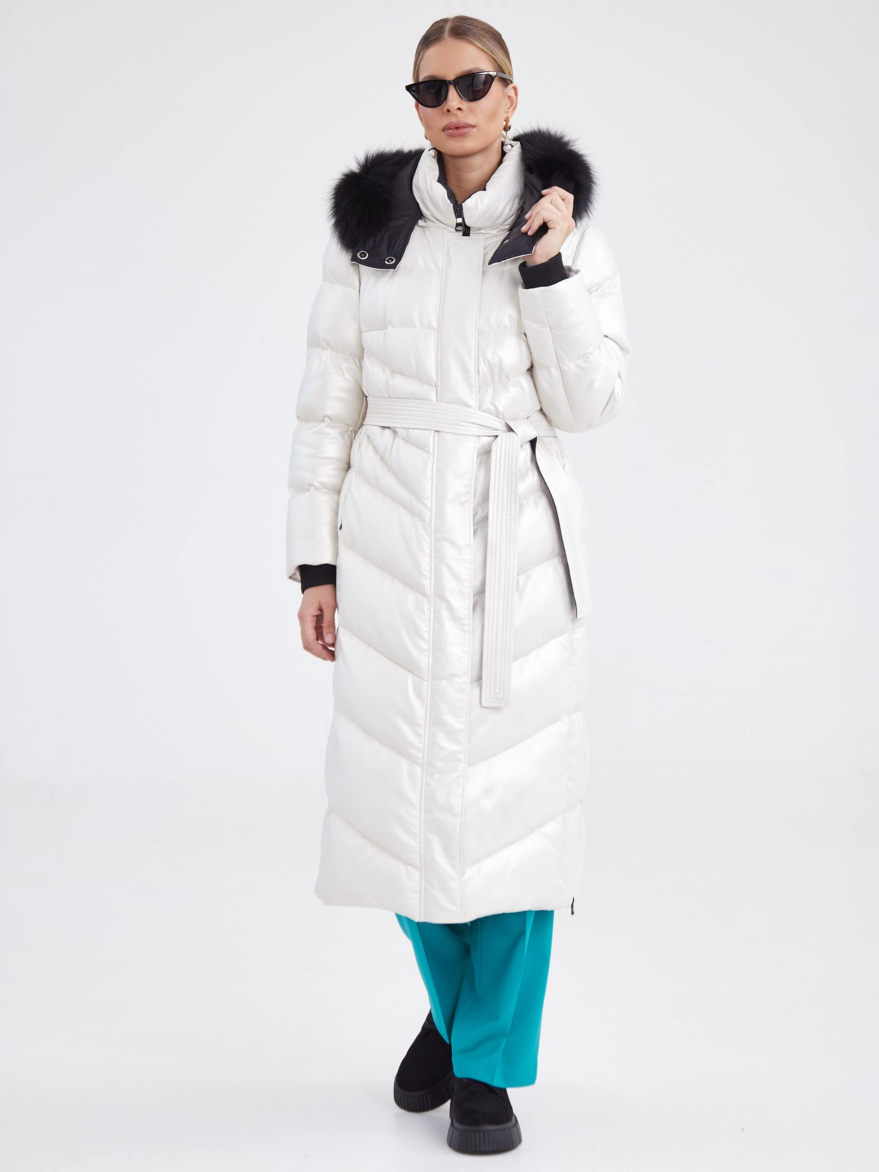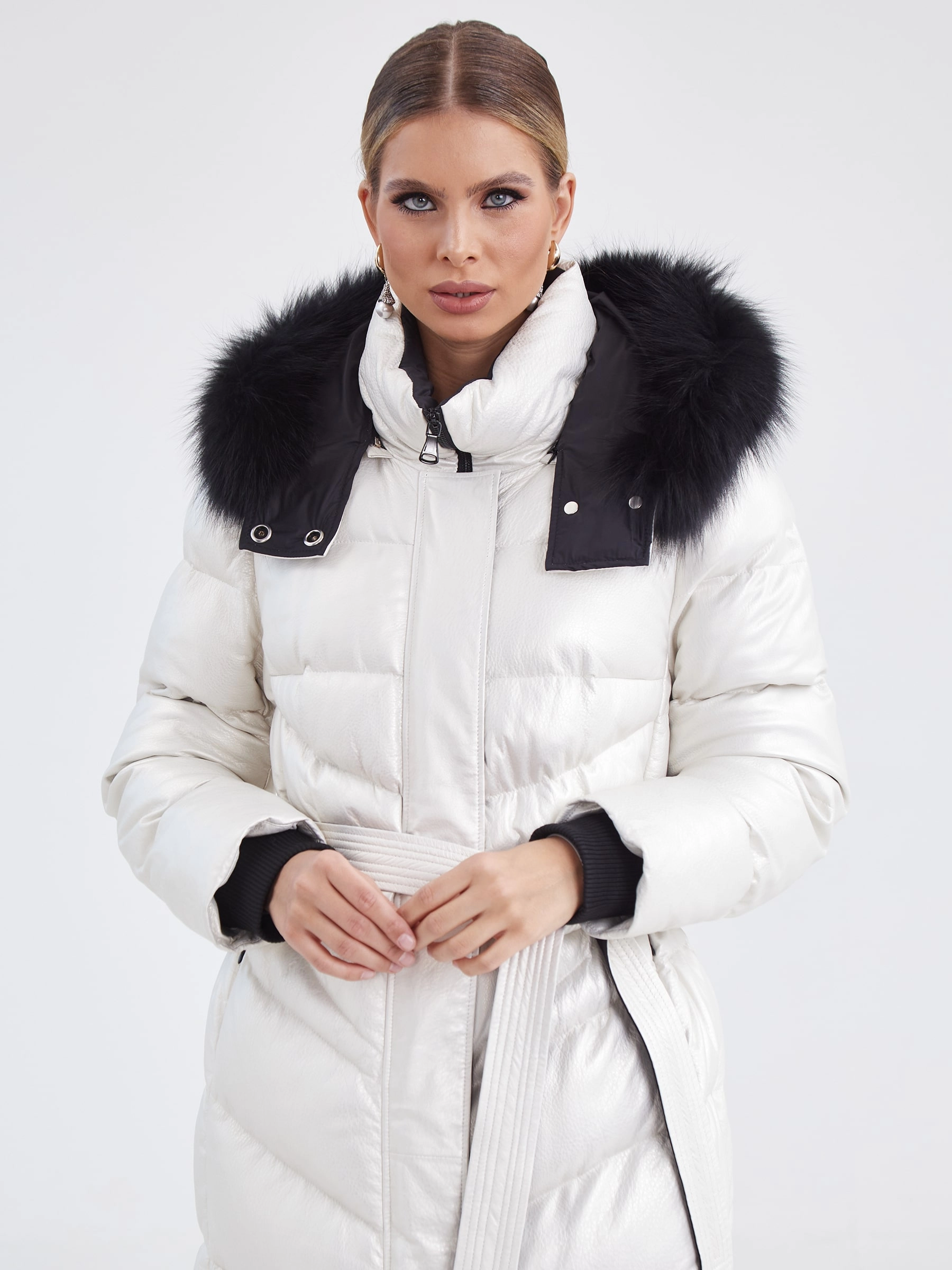 Прямое стеганное пальто выполнили из белой зернистой перламутровой кожи. Застежка - молния закрыта клапоном. Изменить силуэт можно при помощи широкого пояса. Утеплителем послужил немецкий синтепон Френденберг. За дополнительный комфорт отвечают глубокий съемный капюшон который декорировали пушистым мехом песца. Завершили модель высокими боковыми разрезами застегивающимися молнией.