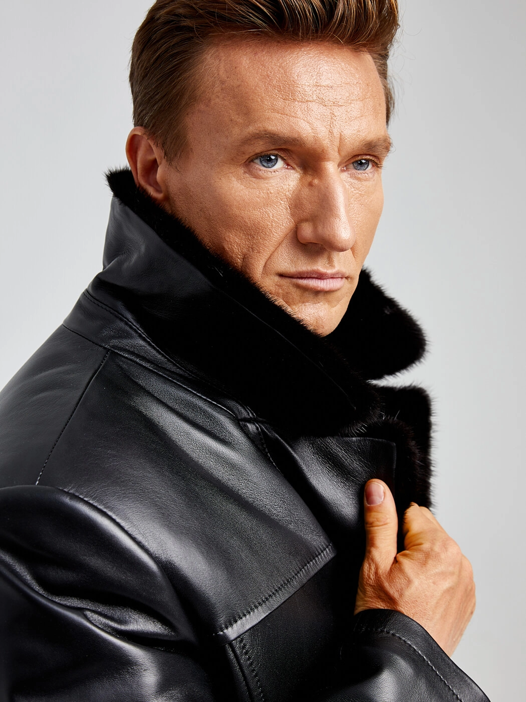 Товар кожаная мужская дубленка с воротником меха норки премиум класса 533мех, черная, размер 50, артикул 40431 выполнен из натуральной кожи с застежкой пуговицы. Рассчитан на сезон: осень-зима. Длина изделия 104 см, силуэт прямой.