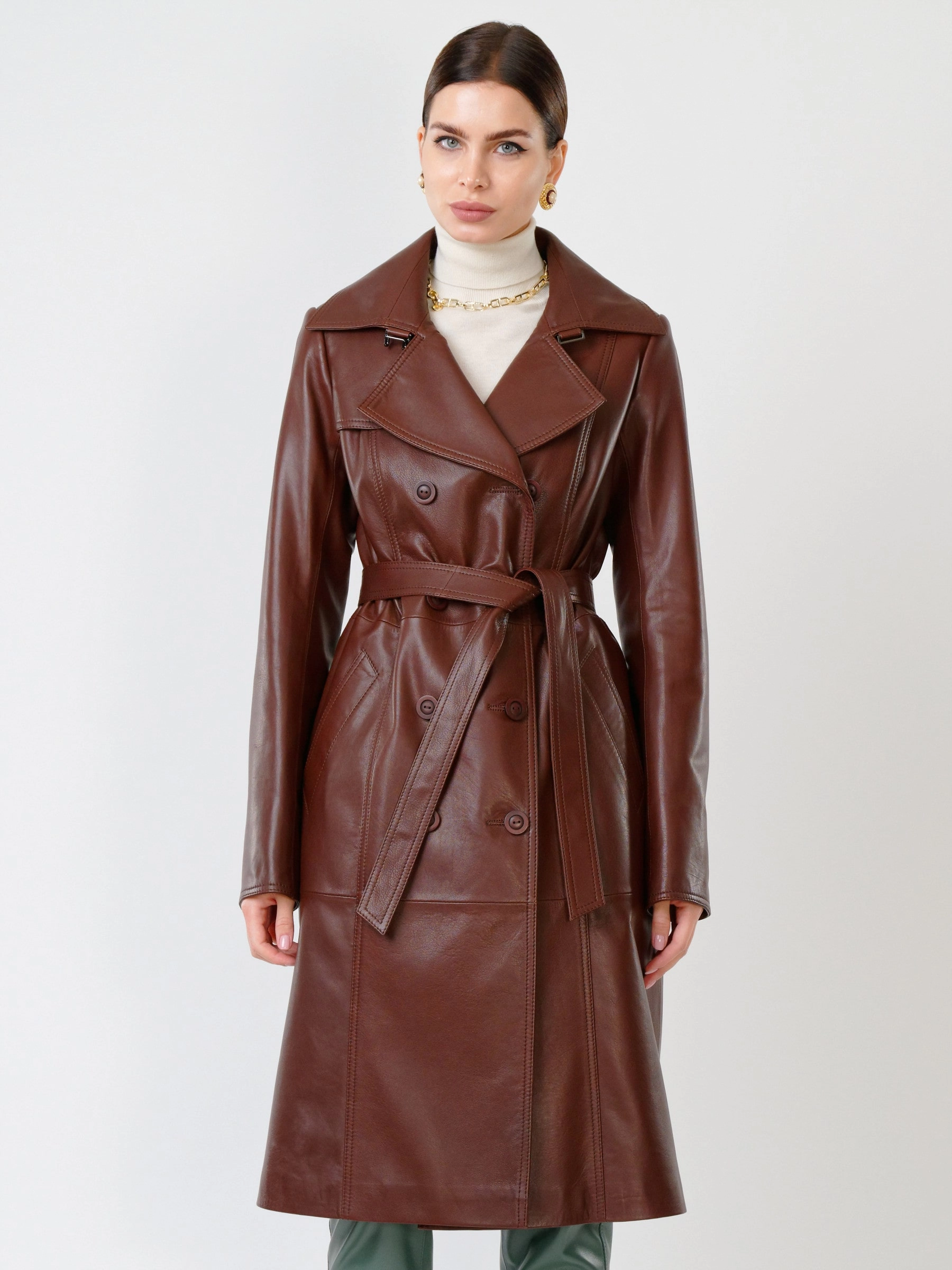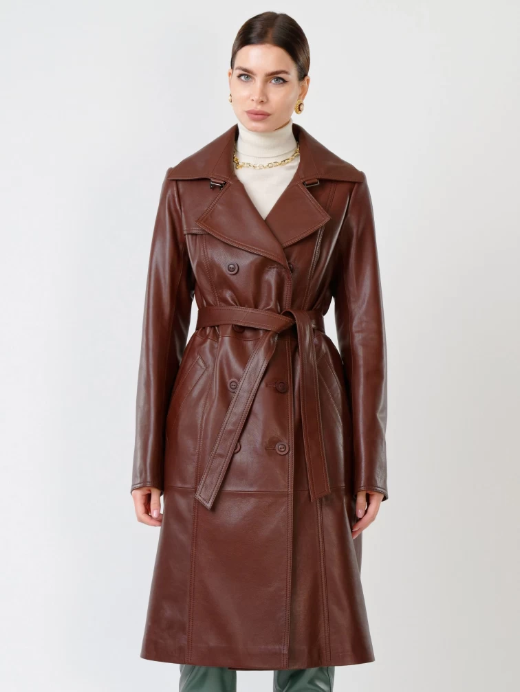 Кожаный двубортный женский плащ с поясом 3003, ореховый, размер 48, артикул 60591