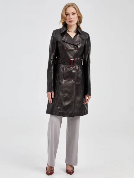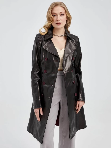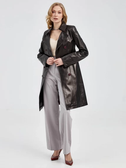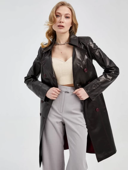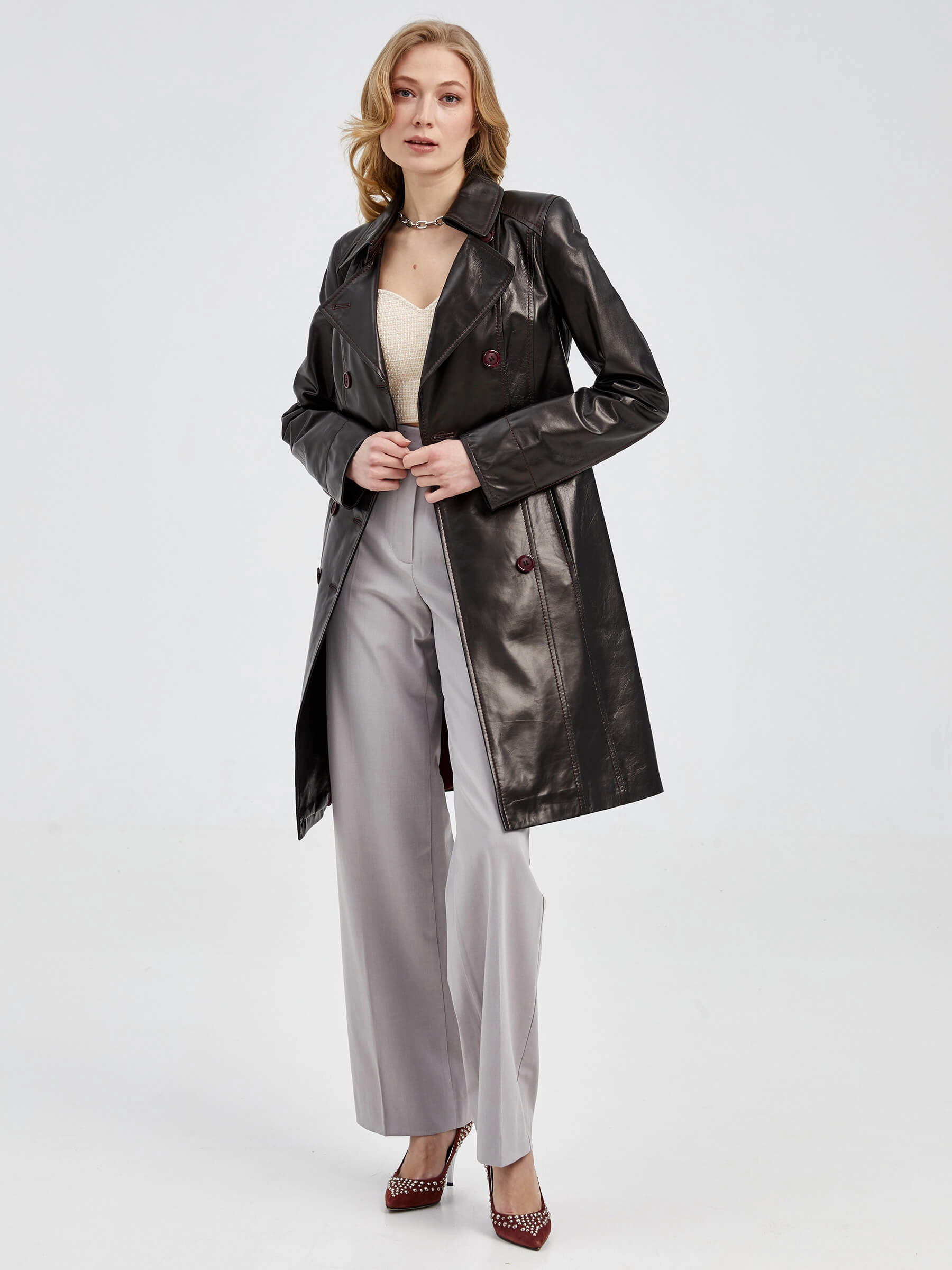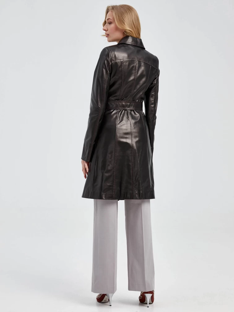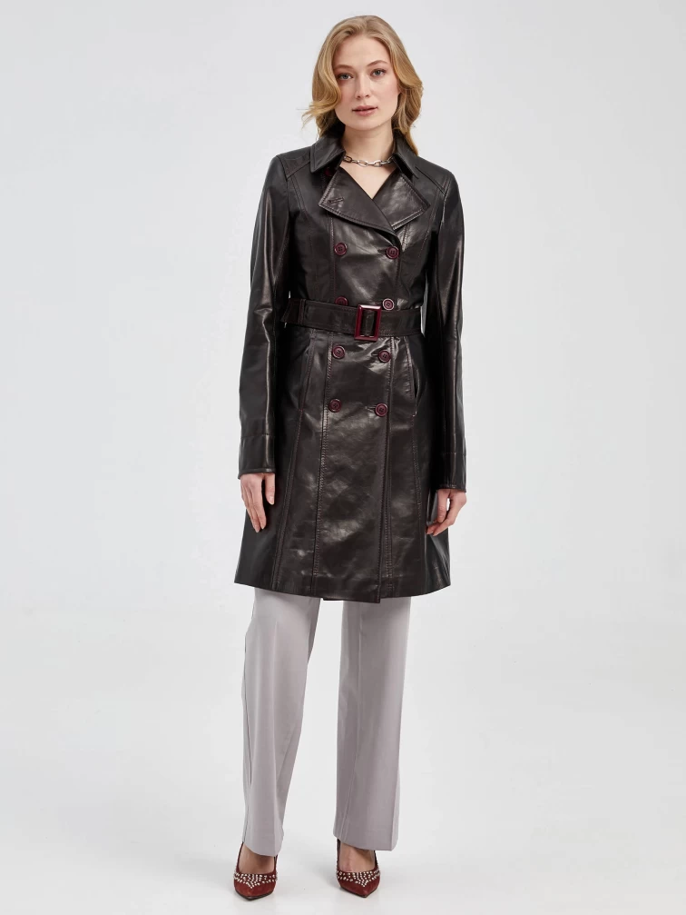 Облегающий силуэт, роскошная натуральная кожа и эффектный двубортный крой — этот женский плащ длиной 92 см станет фаворитом сезона. Классический английский воротник, втачные рукава и застежка на пуговицы подчеркивают элегантность, а широкий пояс с прямоугольной пряжкой идеально выделит талию. Черный цвет, прорезные карманы и безупречное качество кожи гарантируют универсальность и шик в любом луке — наденьте с объемным джемпером, джинсами и сапогами для уверенной элегантности на десятилетия.
