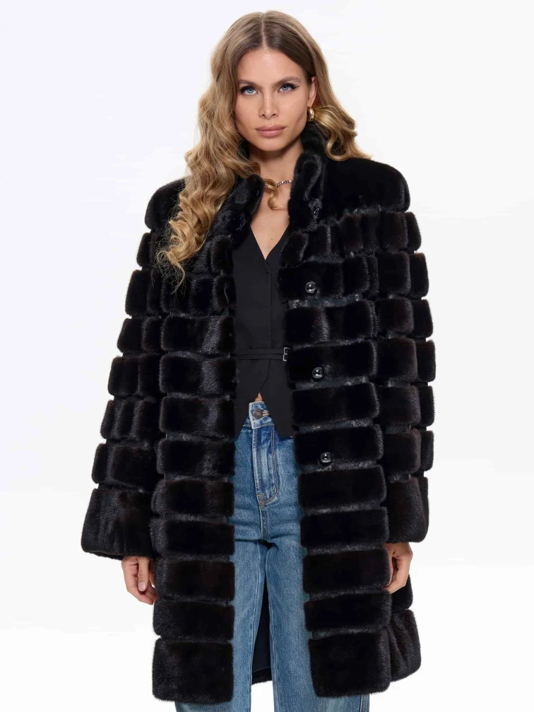 Женская шуба BRASCHI из натурального меха норки выполнена по уникальной технологии поперечной укладки меха, представленная в классическом прямом силуэте универсальной длины миди около 90 см. Поперечное расположение шкурок создает эффектный пледовый рисунок, обеспечивая невероятную мягкость, пластичность и роскошный объем. Модель оснащена строгим вертикальным воротником-стойкой без капюшона, а отсутствие декоративной отделки подчеркивает красоту натурального меха. Шуба застегивается на крупные пуговицы и имеет комфортную вискозную подкладку, выполненная в глубоком теплом оттенке мокко, который особенно выигрышно сочетается с уникальной поперечной укладкой меха, что делает ее идеальным выбором для холодной зимы.