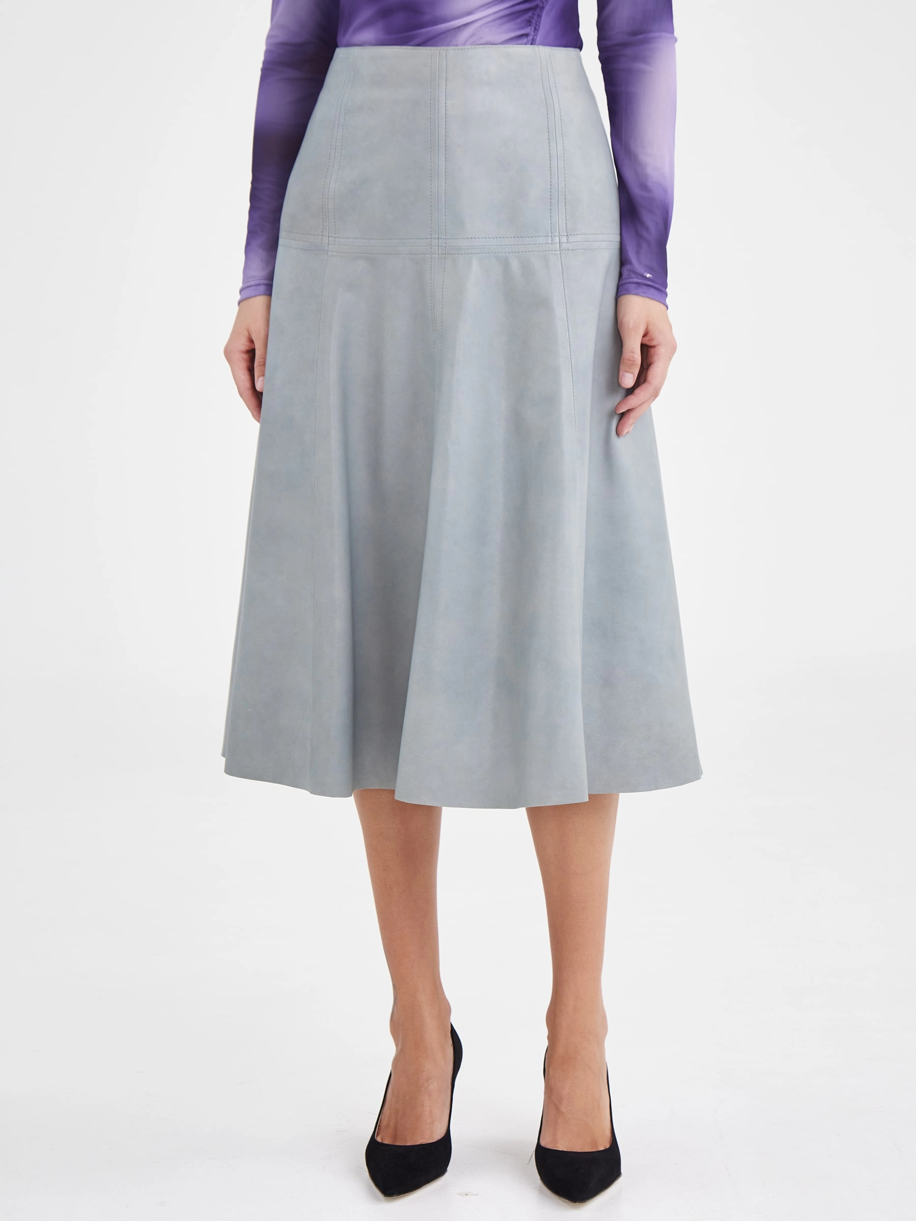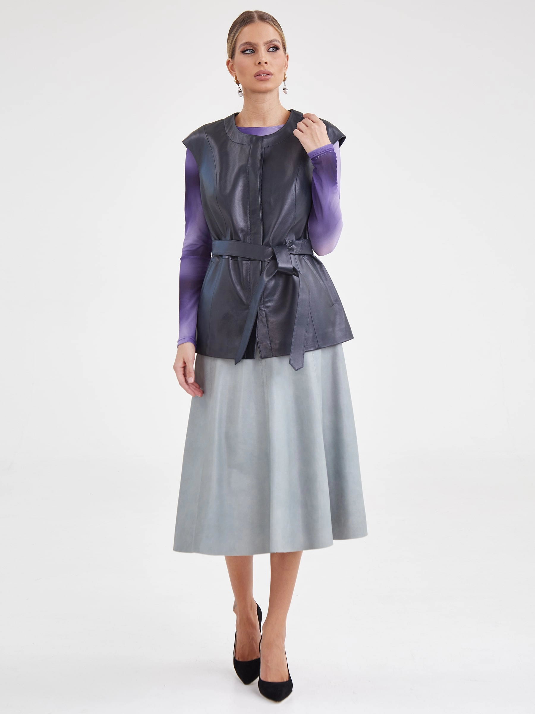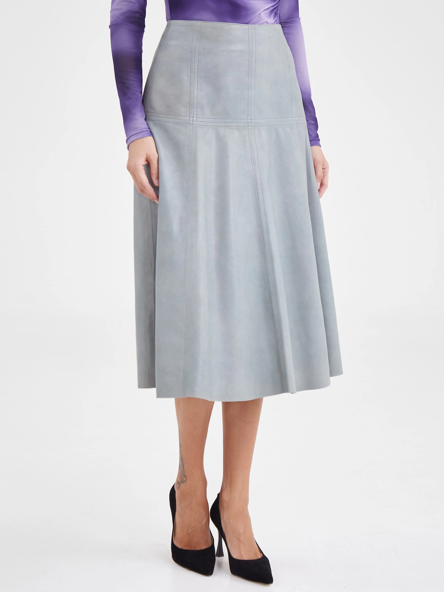 Женственная юбка-годе из натуральной кожи премиум-класса серо-голубого цвета сочетает облегающий верх с эффектным воздушным расширением к низу, создавая элегантный контраст силуэта. Потайная молния сзади обеспечивает чистые линии без пояса, а нежный дымчато-небесный оттенок тонкой кожи придает образу утонченность и лёгкость. Этот универсальный фасон легко трансформирует ваш стиль от романтичного ретро с водолазками и жакетами до современного дерзкого лука с объемными свитерами и грубыми ботинками, идеально дополняя как шелковые топы для вечернего выхода, так и повседневные образы с лаконичными блузами.