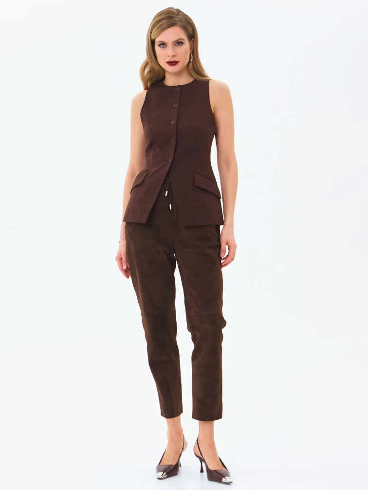 Товар замшевые женские брюки 09з, коричневые, размер 46, артикул 86030 выполнен из натуральной замши с застежкой кулиски. Рассчитан на сезон: всесезон.силуэт прямой.
