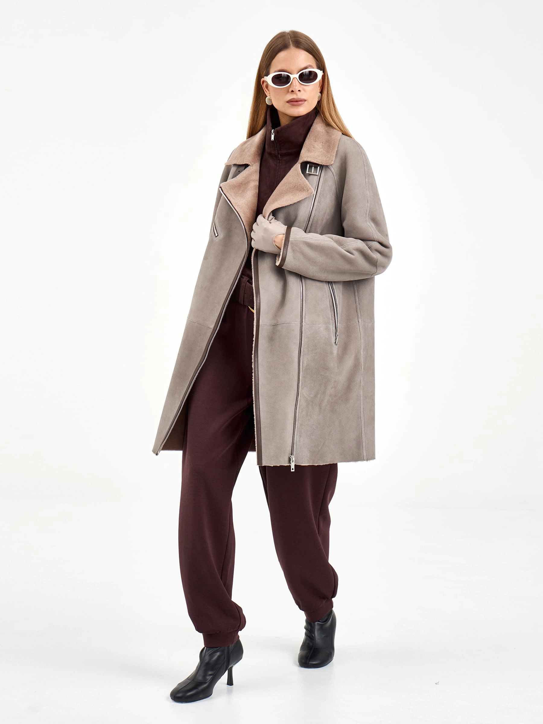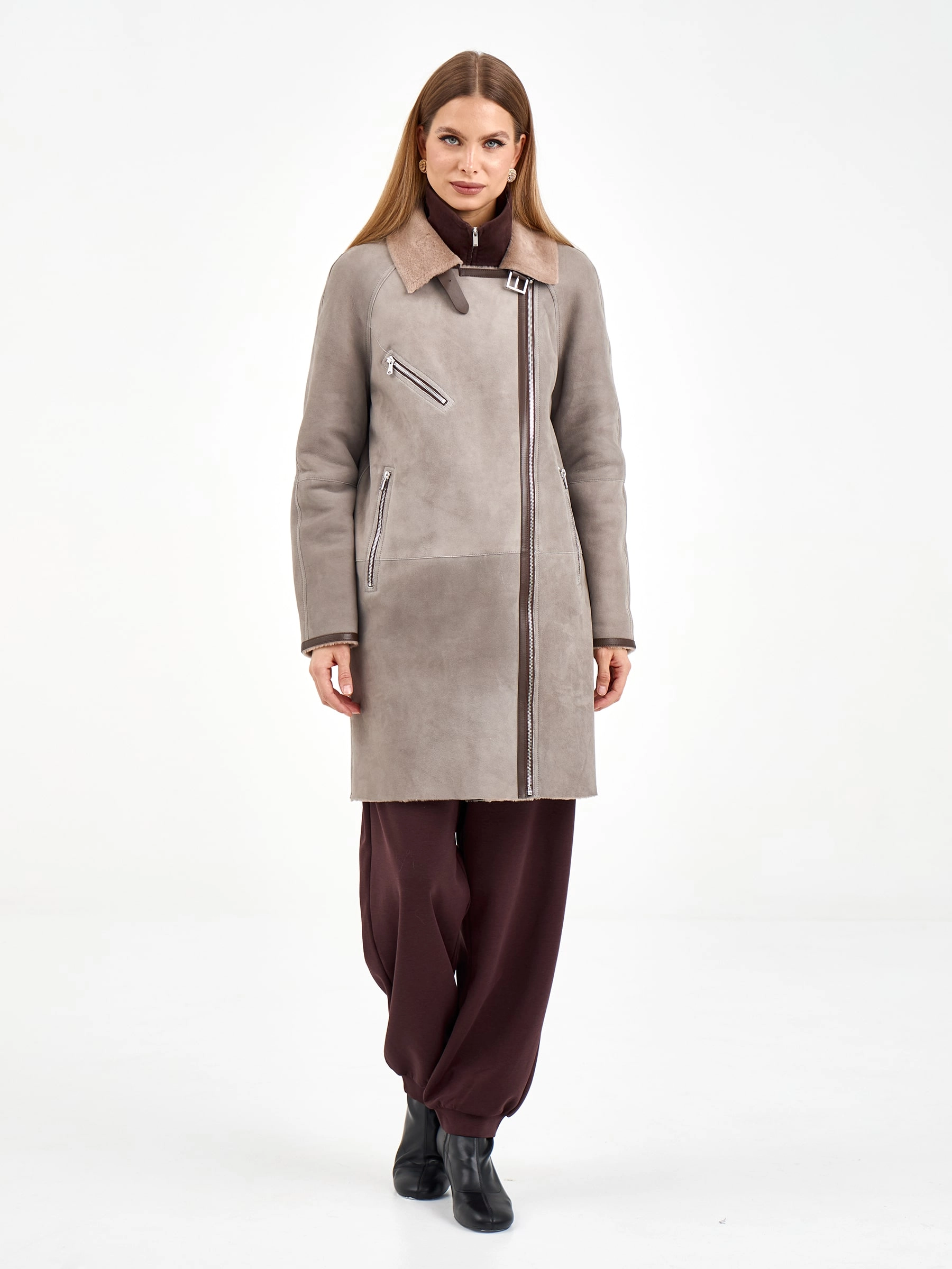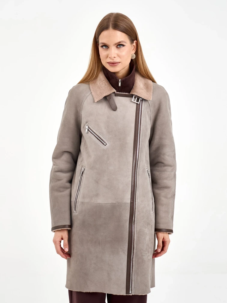 Эта стильная дублёнка-косуха свободного кроя, выполненная из премиальной овчины мерино, представлена в сдержанном оттенке серого. Длина 90 см, рукав реглан и английский воротник с широкими лацканами создают образ, сочетающий классику и современность. Стилисты рекомендуют носить её с кожаными ботинками и джинсами для повседневного образа или с вязаным платьем и сапогами-челси для элегантного лука. Изящная застёжка-ремень с пряжкой под воротником завершает дизайн, делая эту модель идеальным выбором для ценительниц качественной верхней одежды.