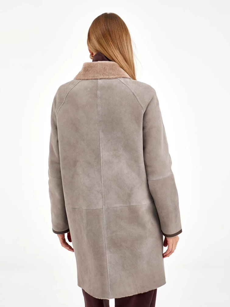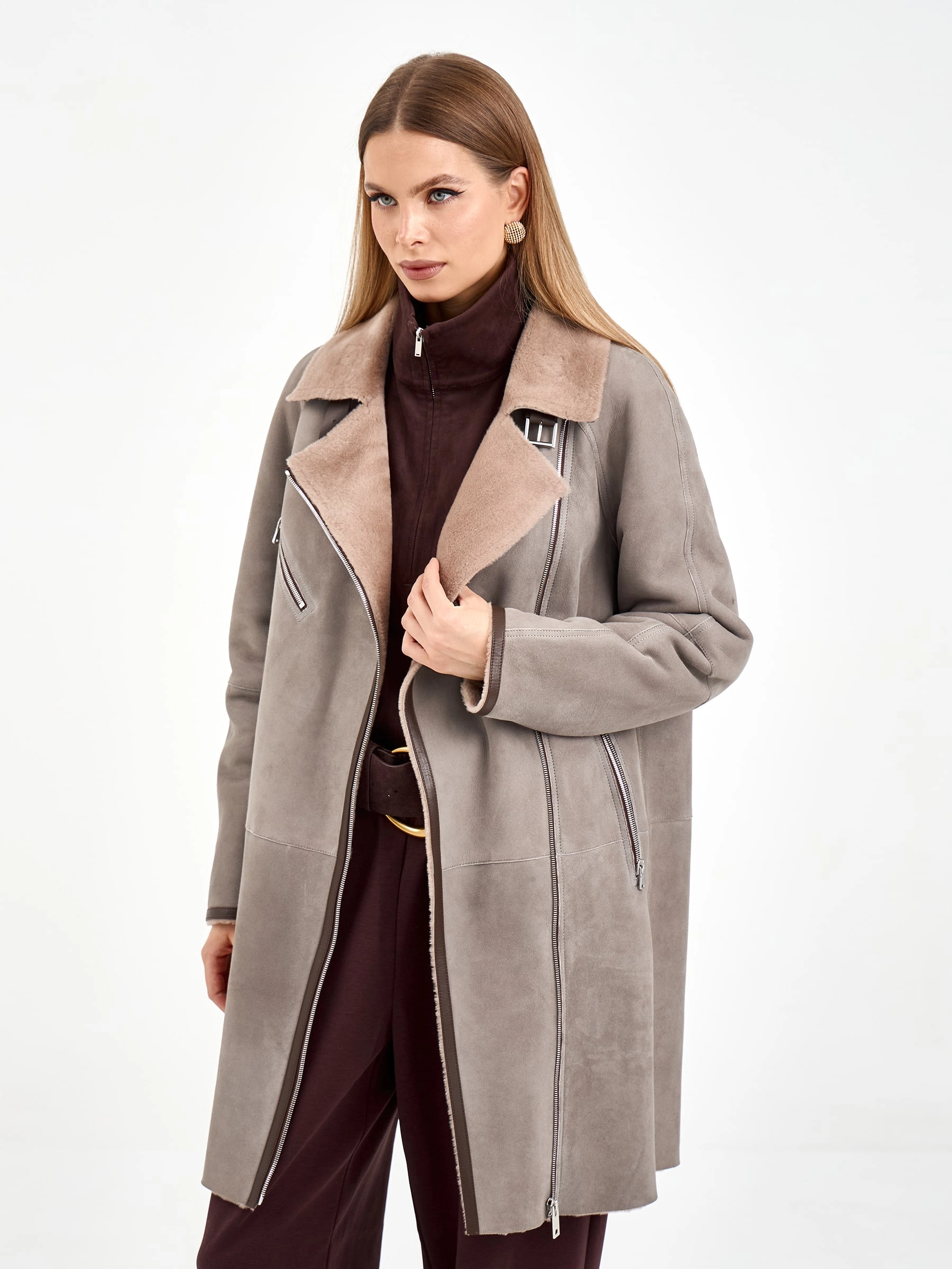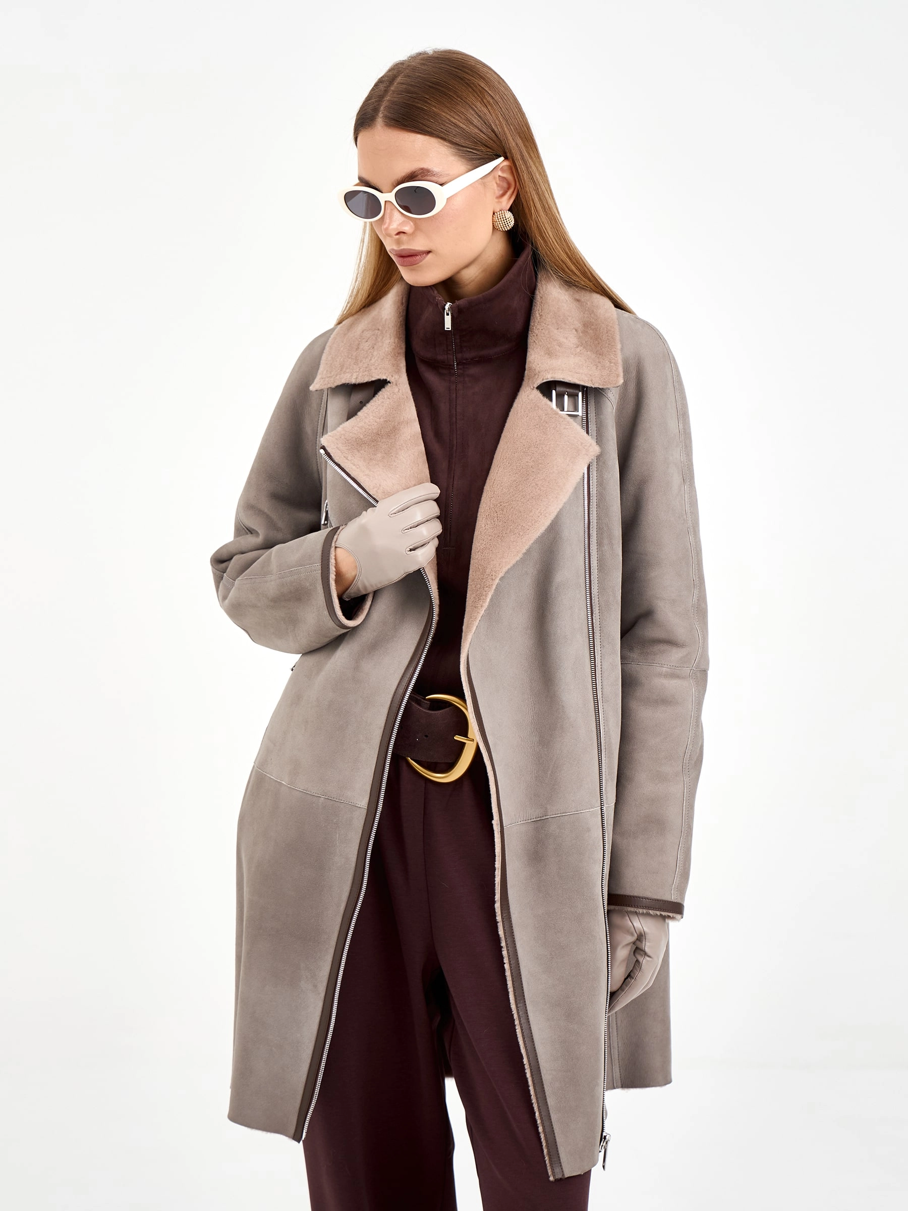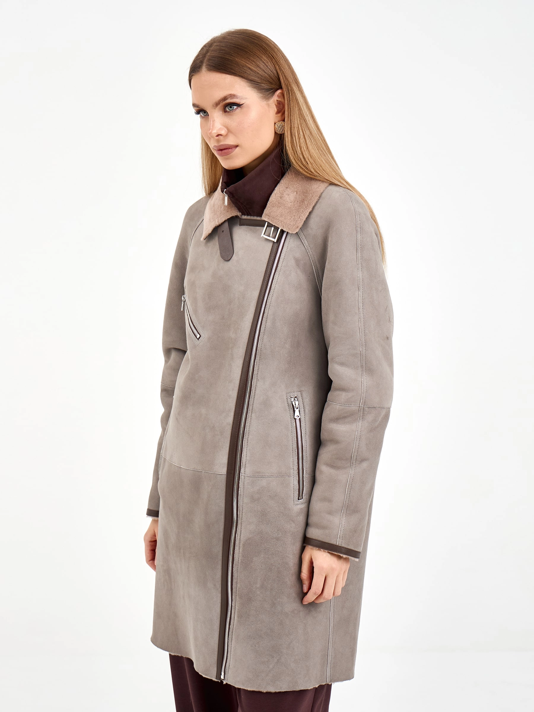 Эта стильная дублёнка-косуха свободного кроя, выполненная из премиальной овчины мерино, представлена в сдержанном оттенке серого. Длина 90 см, рукав реглан и английский воротник с широкими лацканами создают образ, сочетающий классику и современность. Стилисты рекомендуют носить её с кожаными ботинками и джинсами для повседневного образа или с вязаным платьем и сапогами-челси для элегантного лука. Изящная застёжка-ремень с пряжкой под воротником завершает дизайн, делая эту модель идеальным выбором для ценительниц качественной верхней одежды.