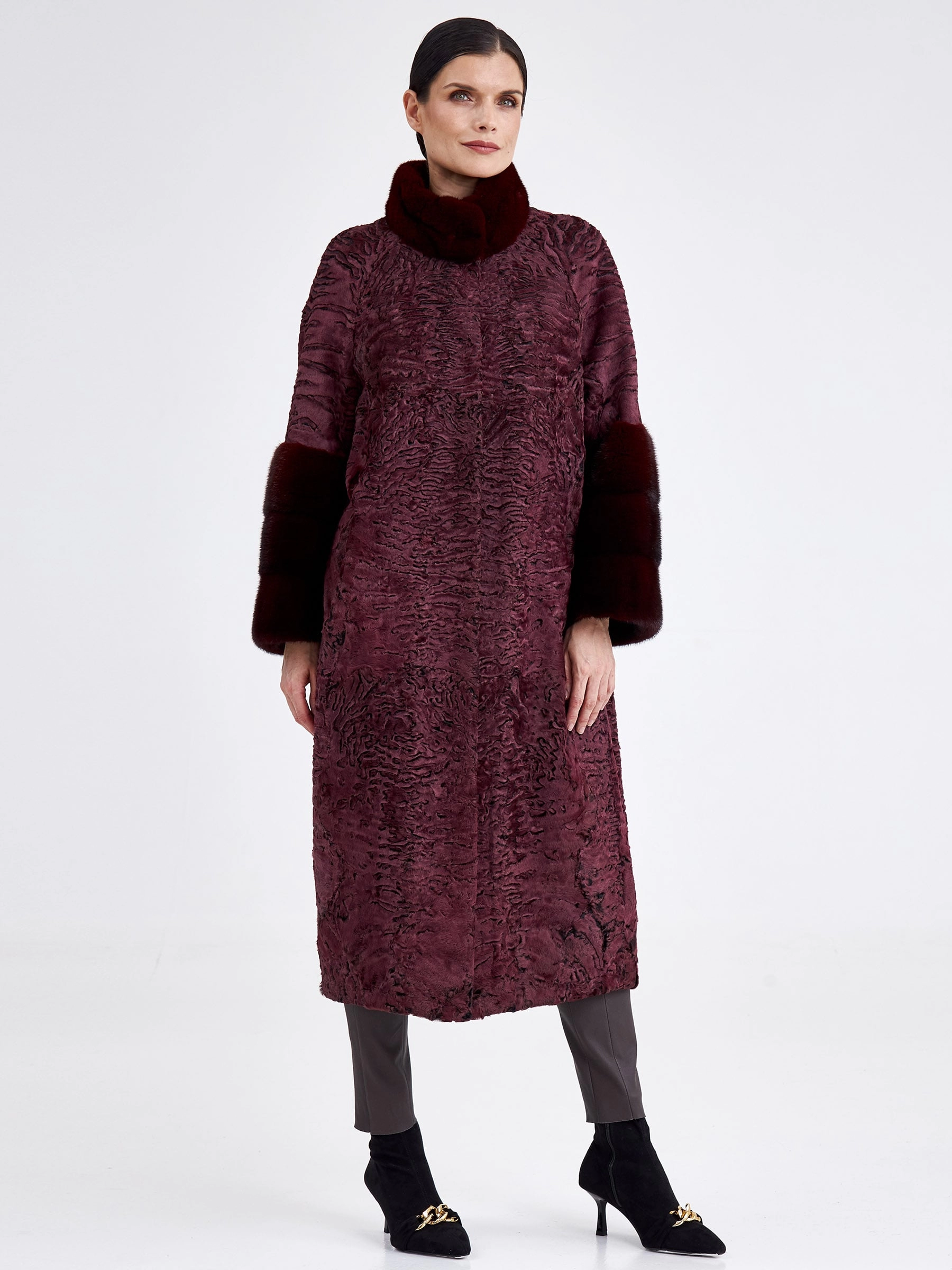 Длинное прямое пальто из нежного каракуля в комбинации с густой шелковистой норкой. Этот стиль подходит женщинам абсолютно любого возраста. Мастера убрали элементы декора , но сделали акцент на невысокую стойку и рукава из норки темно бордового оттенка. Модель подчеркивает элегантность и сдержаность.