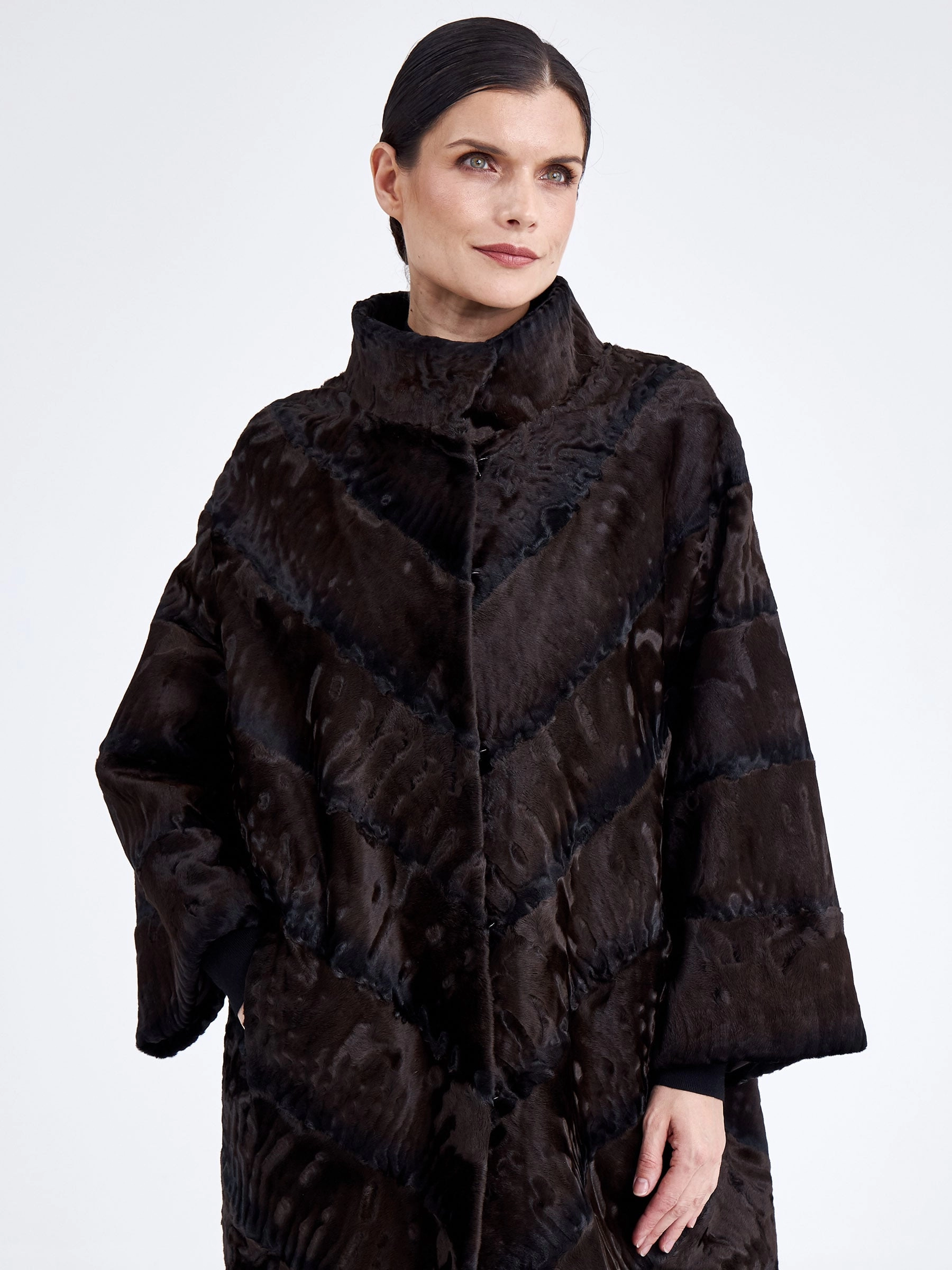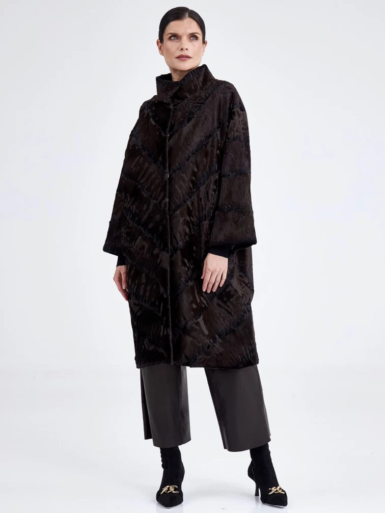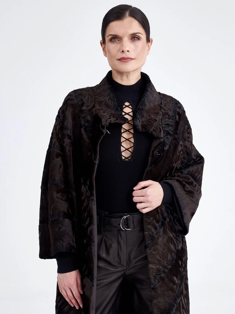 Эфектное пальто выполненное из нежного меха каракуля -удачно сочетает в себе практичность, комфорт и элегантность. Изделие выглядит как красивейший узор состоящий из множества завитков, переливающихся на солнце. Прямой крой, не высокая стойка.Отсутствие какого либо декора. Только стиль и премиум класс!