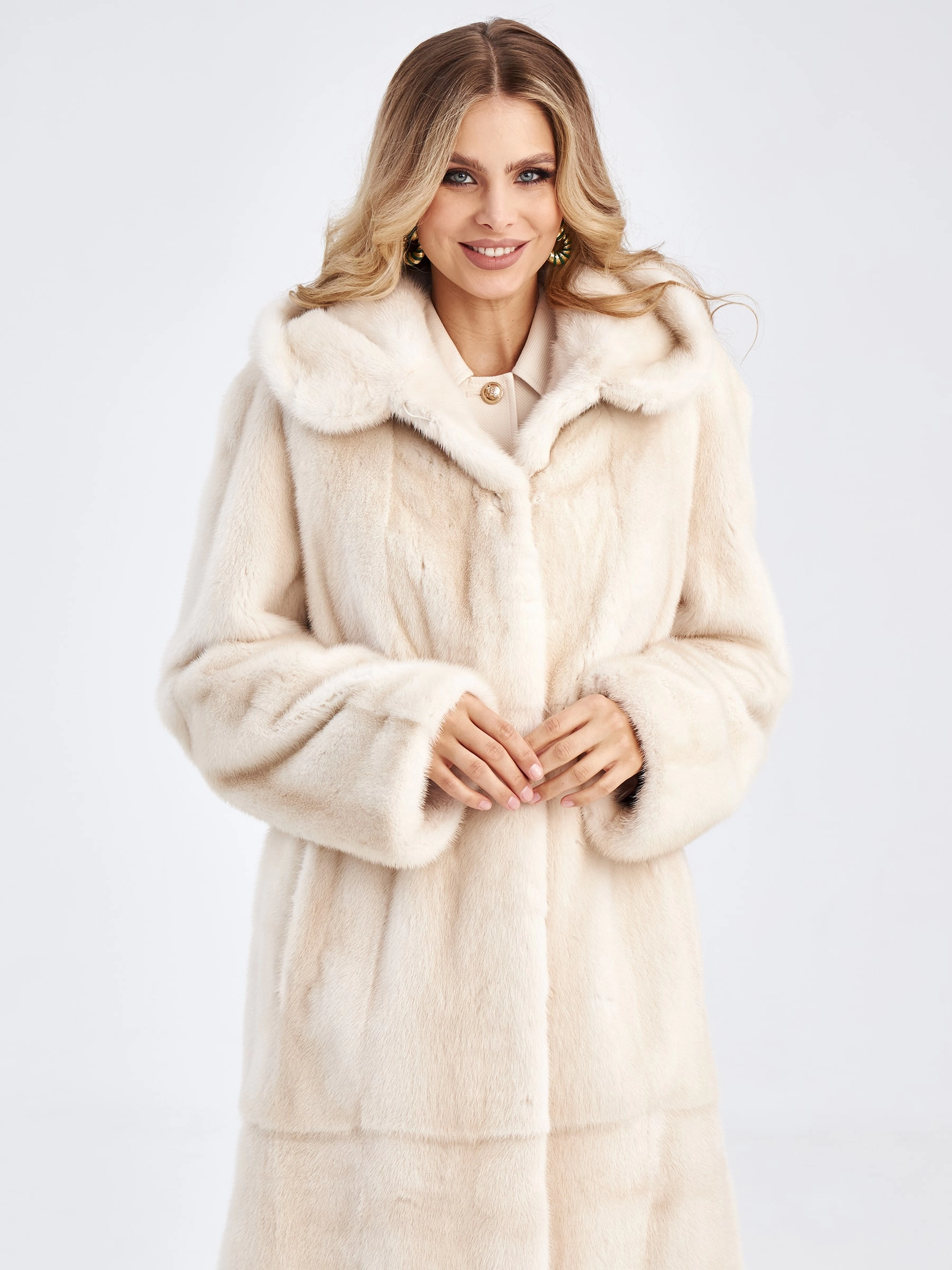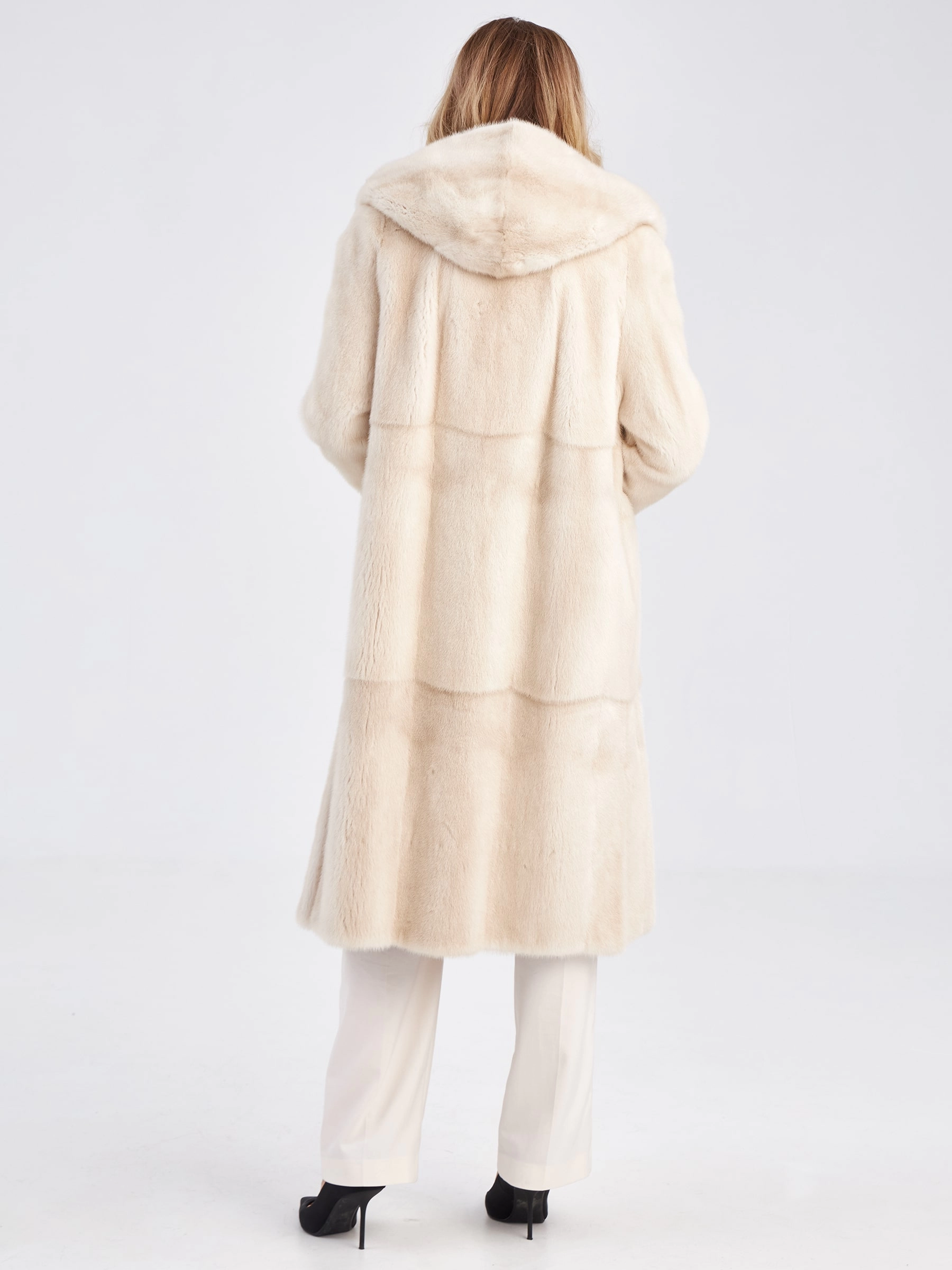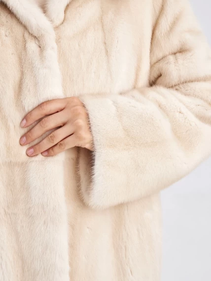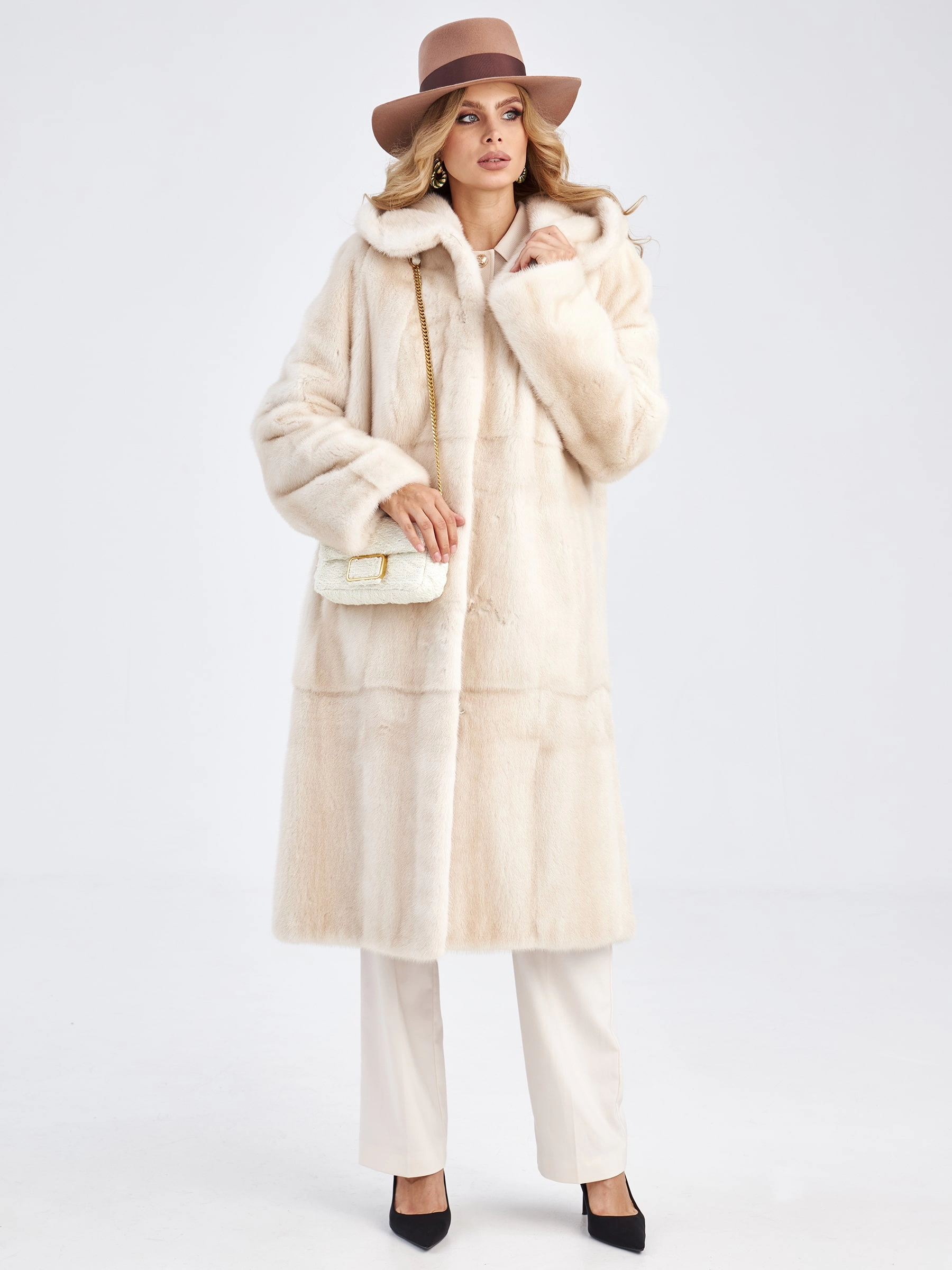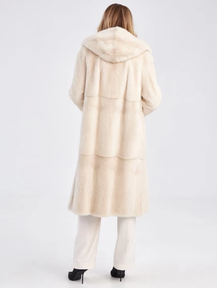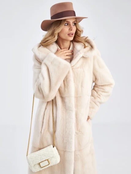 Длинная норковая шуба с капюшоном для женщин премиум класса Марина(к), жемчужная, размер 56, артикул 33750